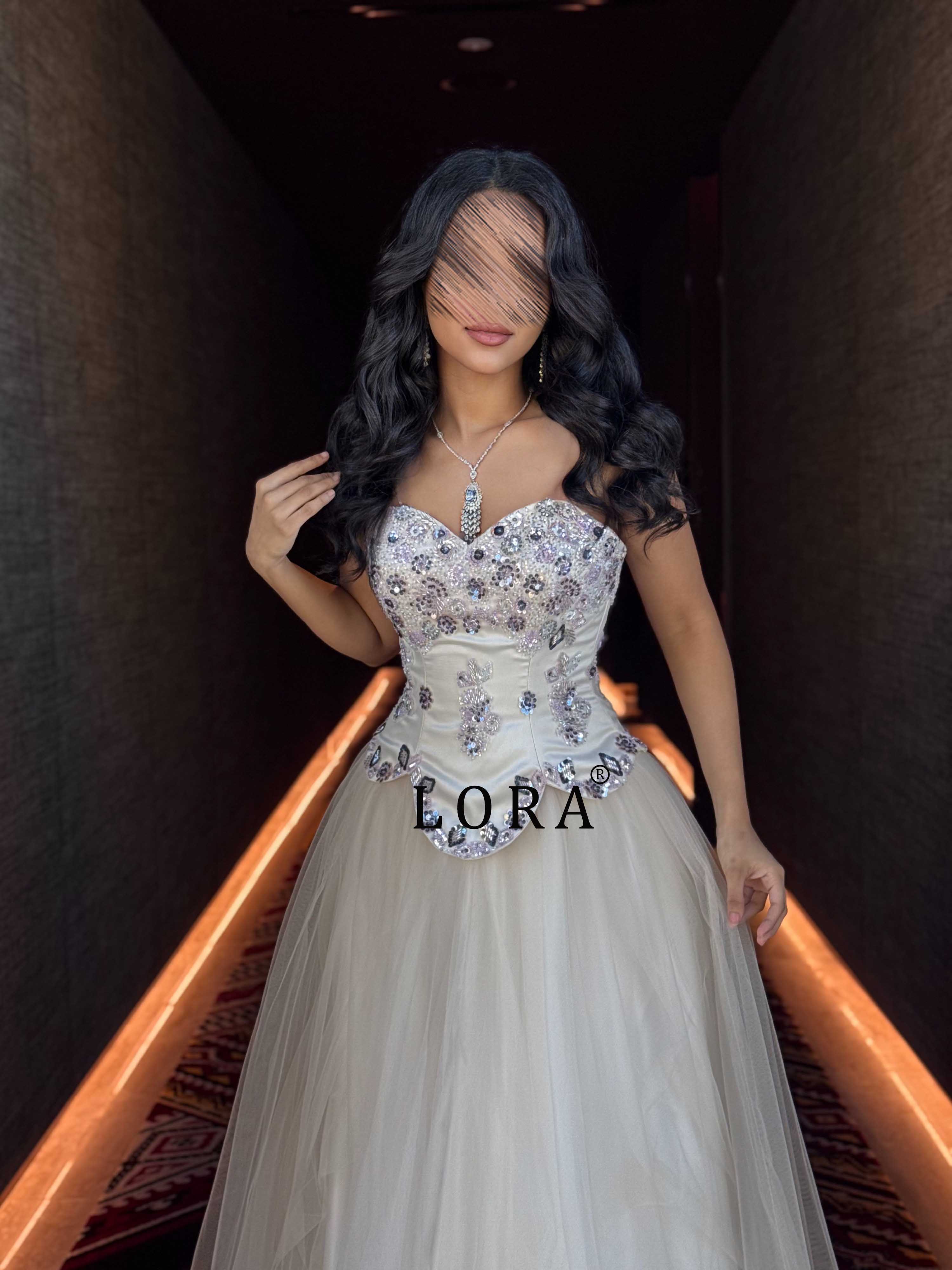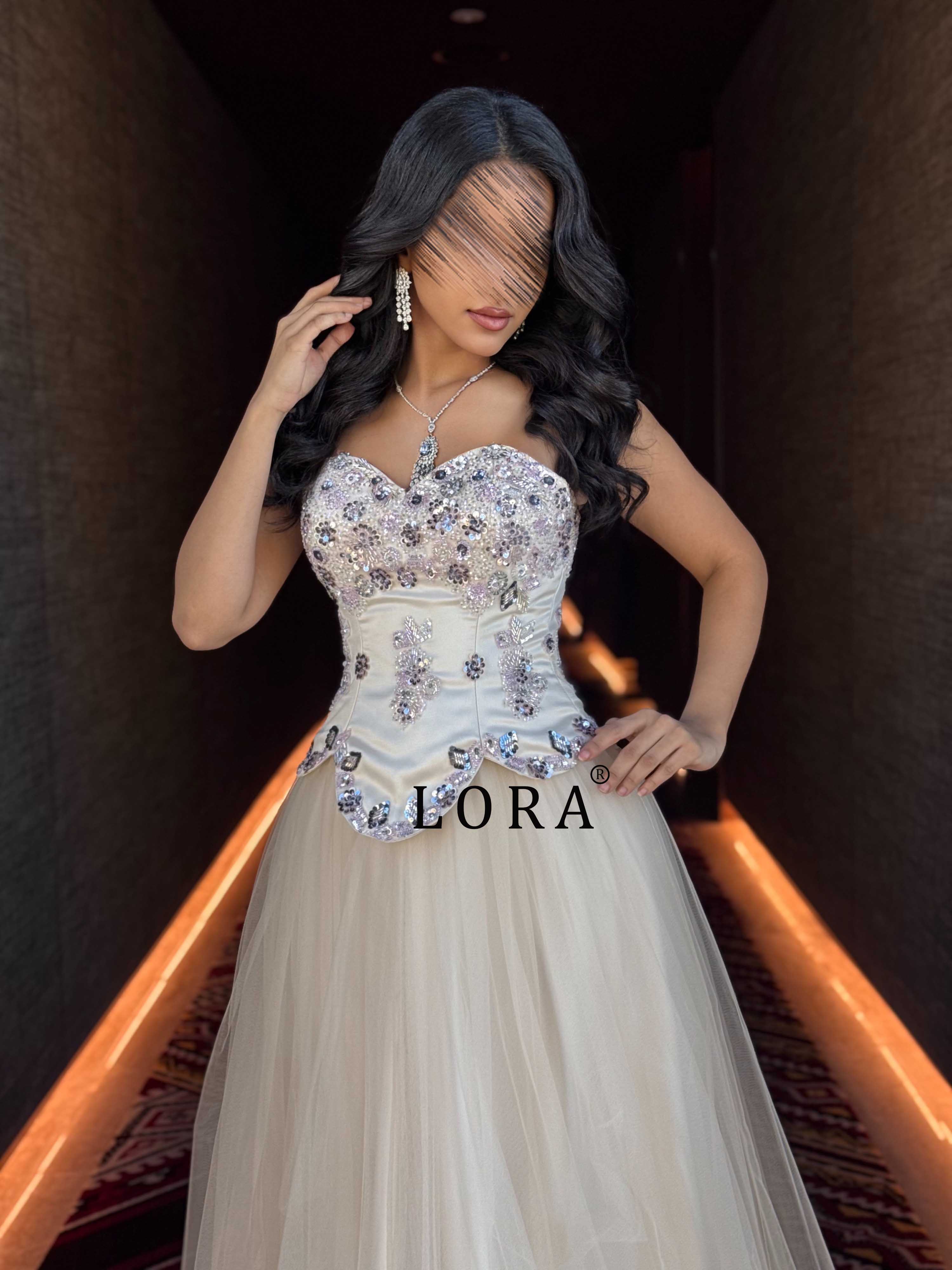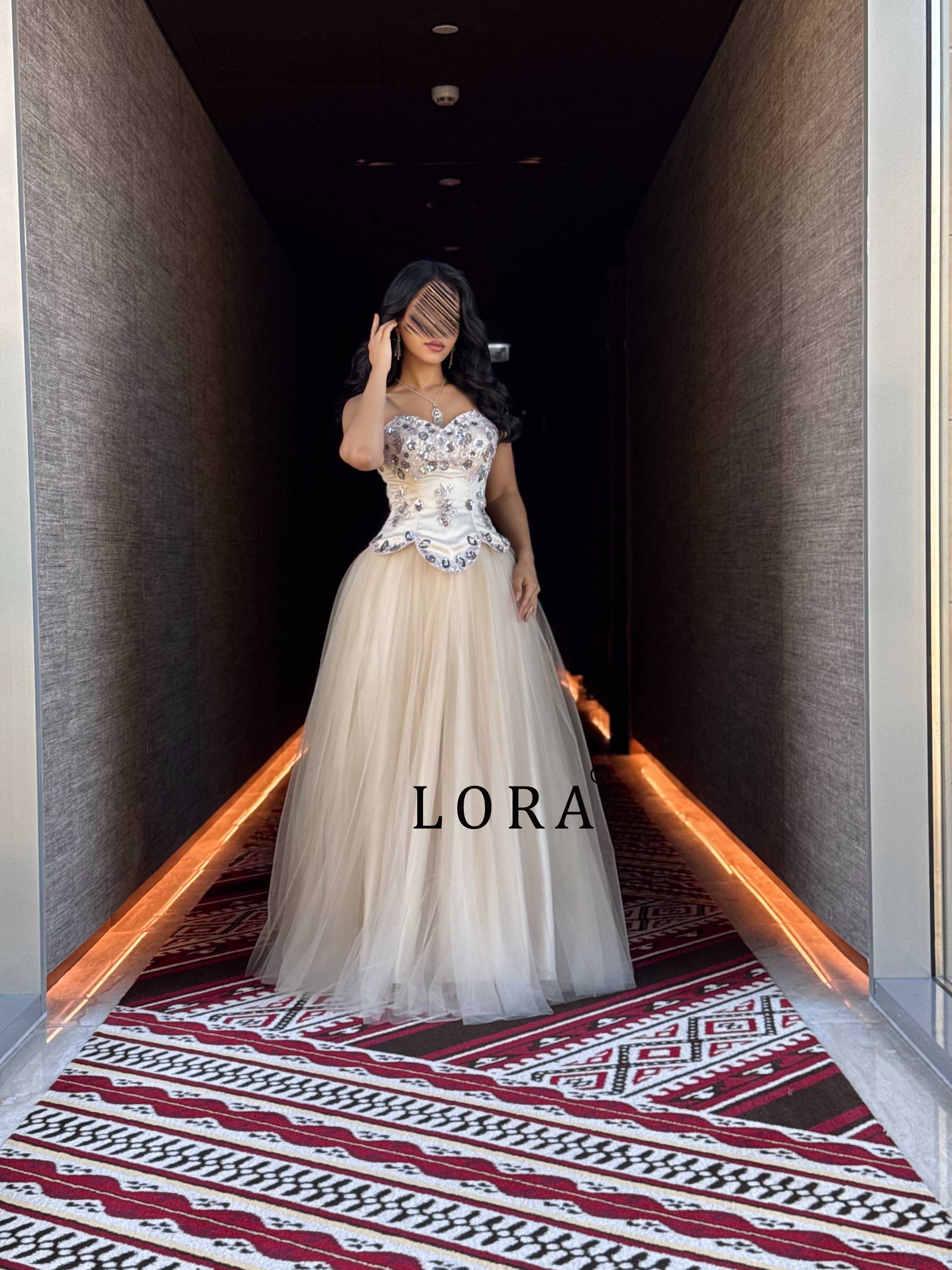 فستان أبيض ملكي من LORA بتصميم مطرّز فاخر يفيض أنوثة ورقياً. إطلالة فخمة تجمع بين الجمال الكلاسيكي والفخامة الحديثة لتناسب مناسباتك الخاصة.