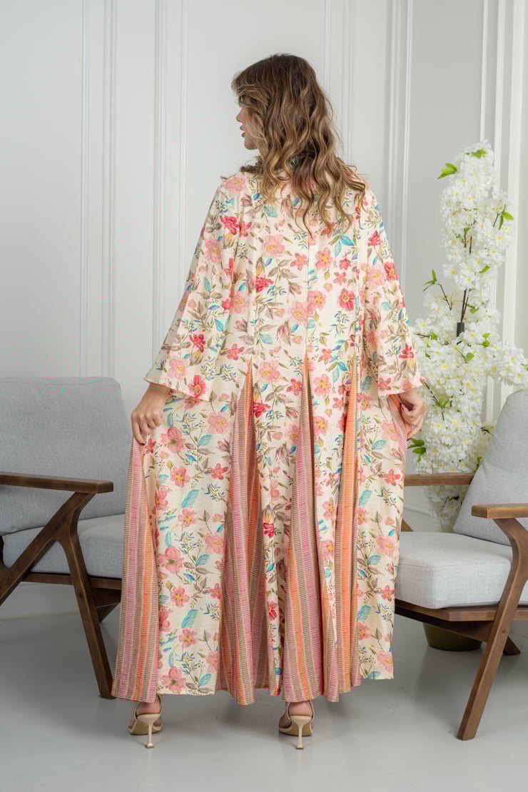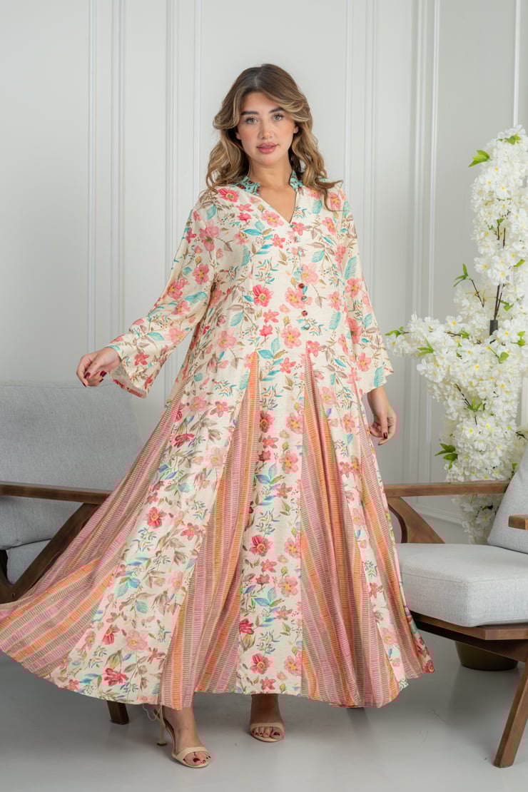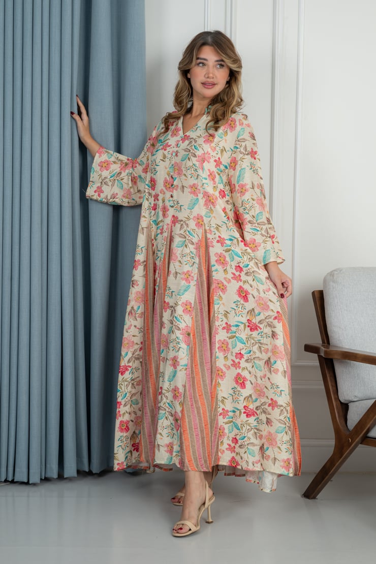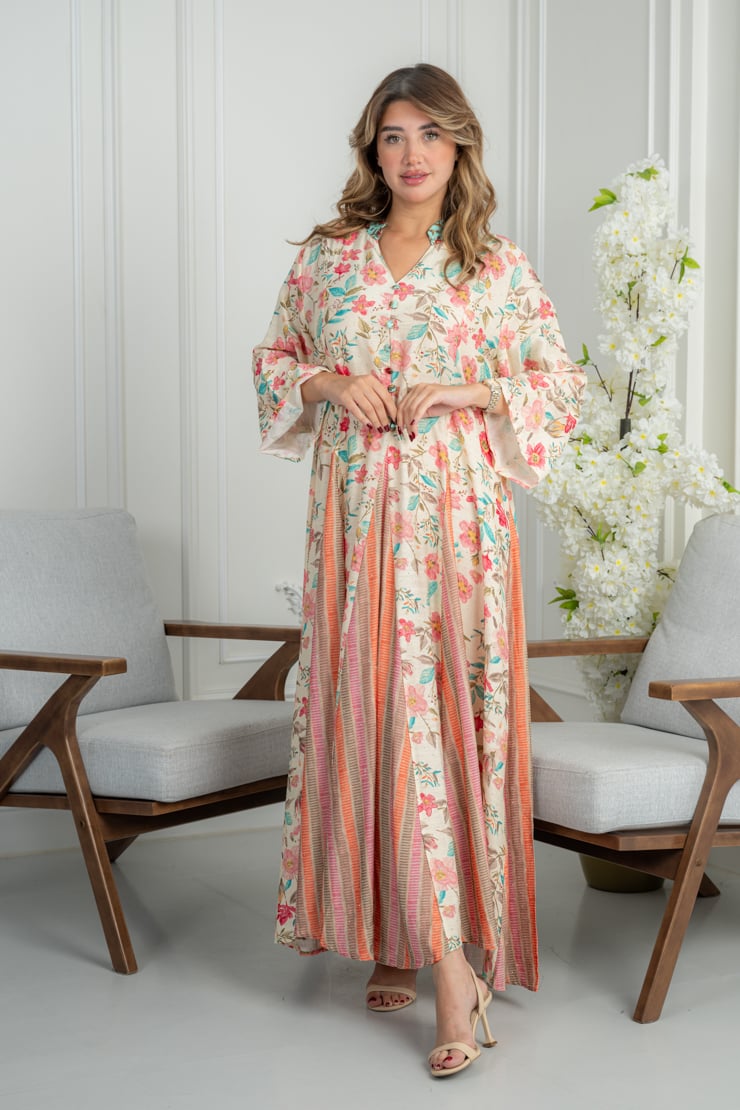 جلابية أنثوية بتصميم هادئ يجمع بين الرقي والراحة، مزينة بنقشة زهور ناعمة وألوان متناغمة تمنح إطلالة راقية ومشرقة تناسب الذوق العصري مع لمسة شرقية أنيقة.