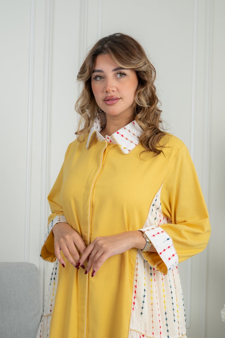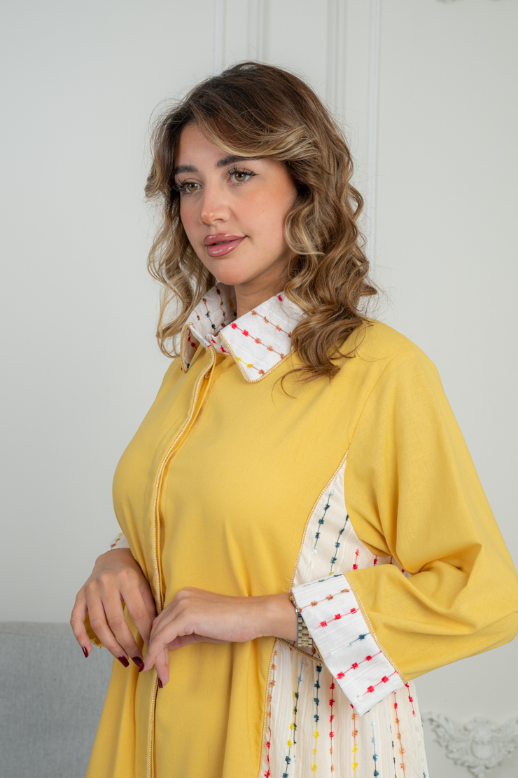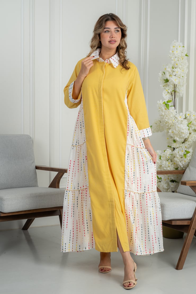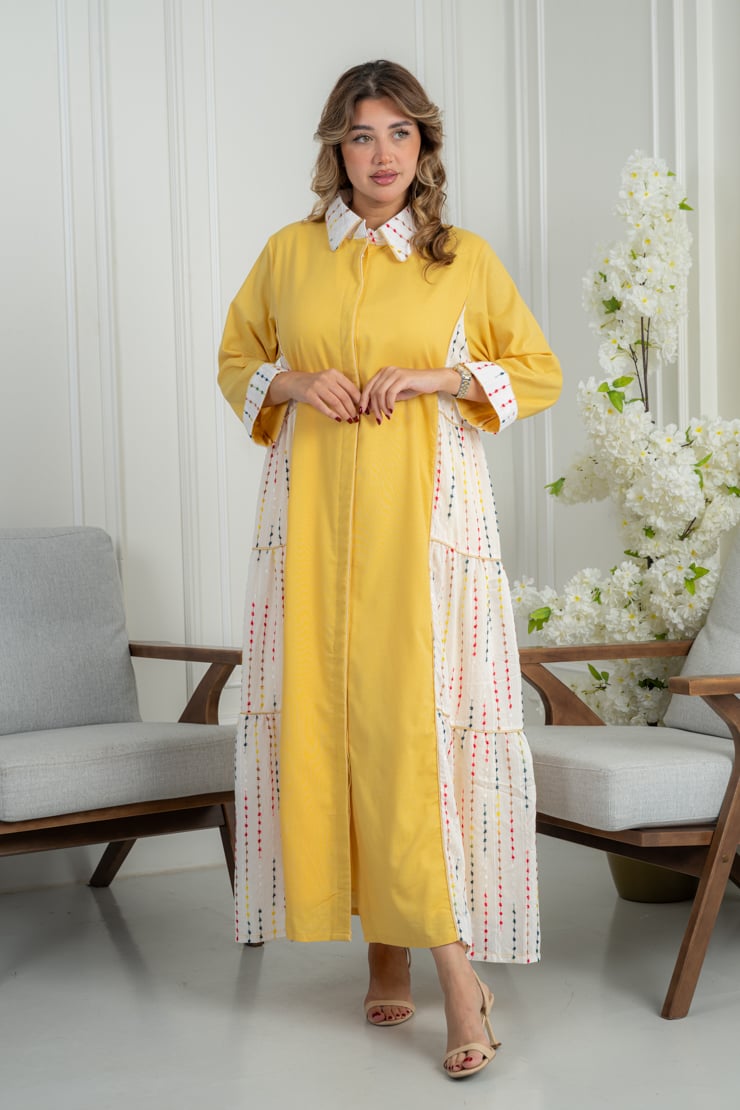 جلابية صفراء أنيقة بتفاصيل جانبية منقوشة