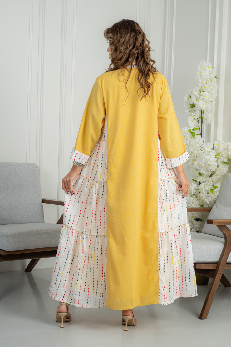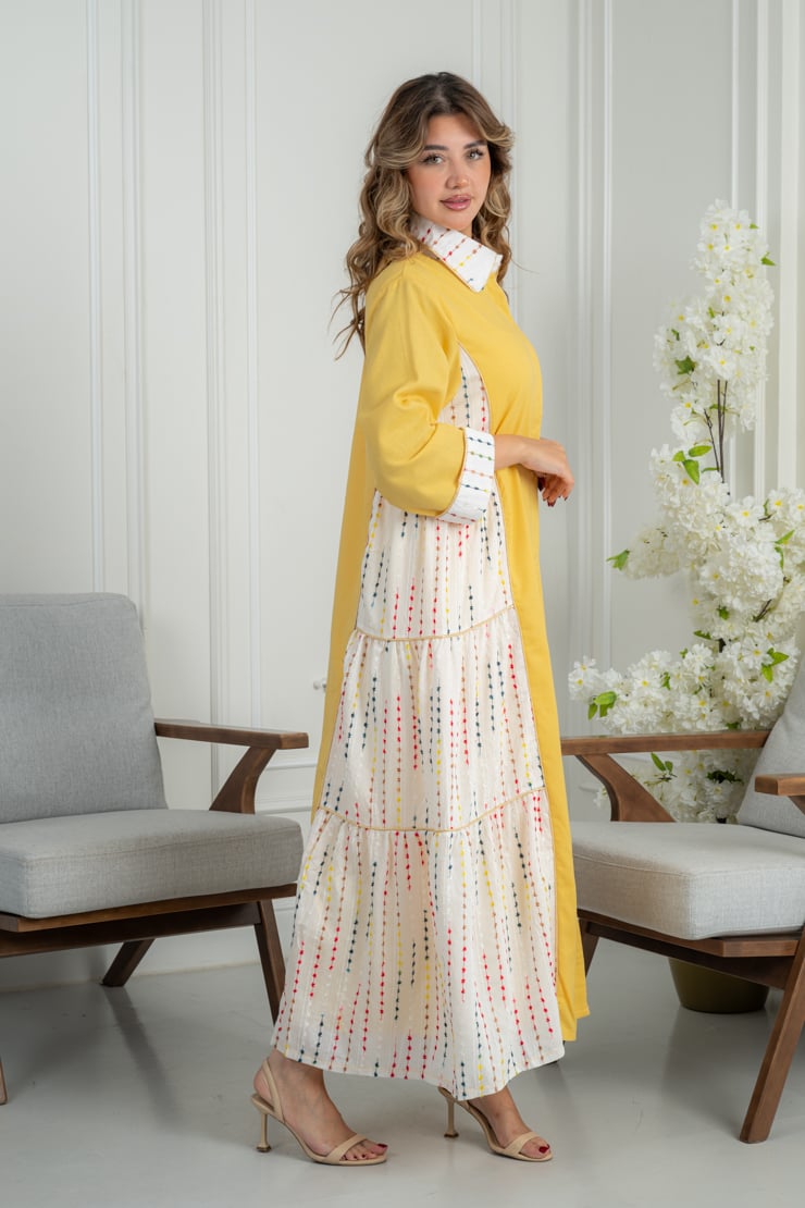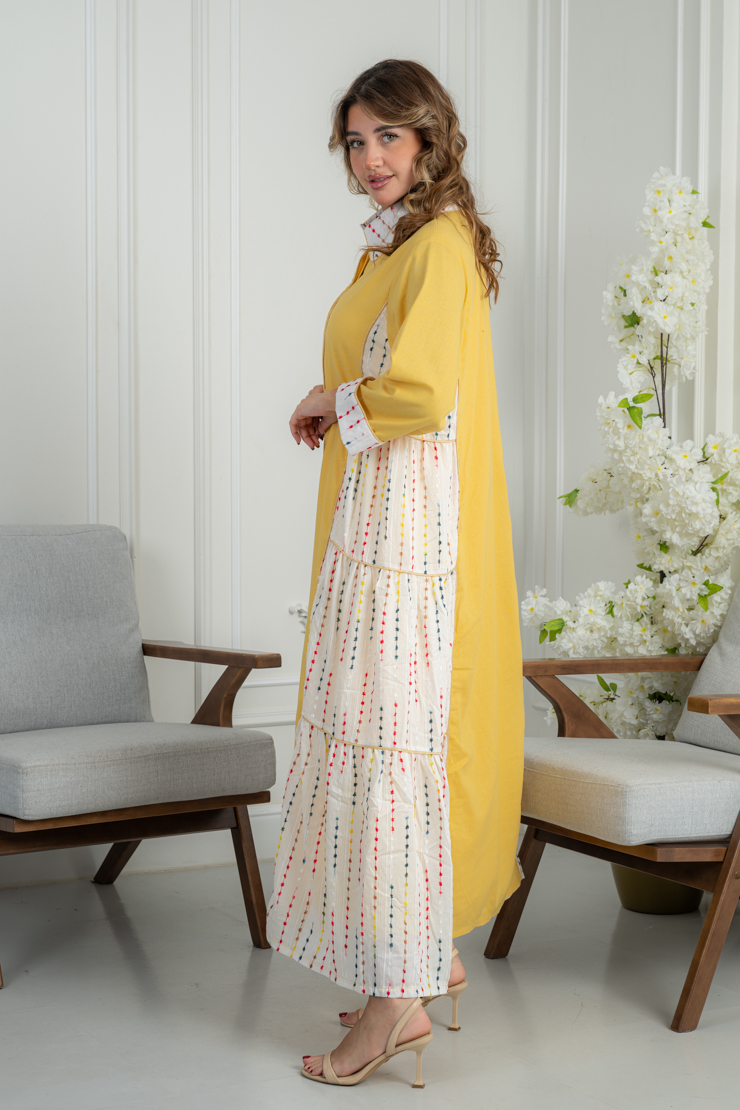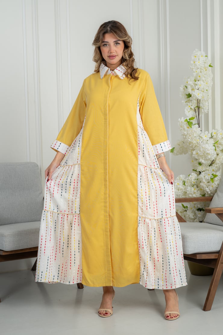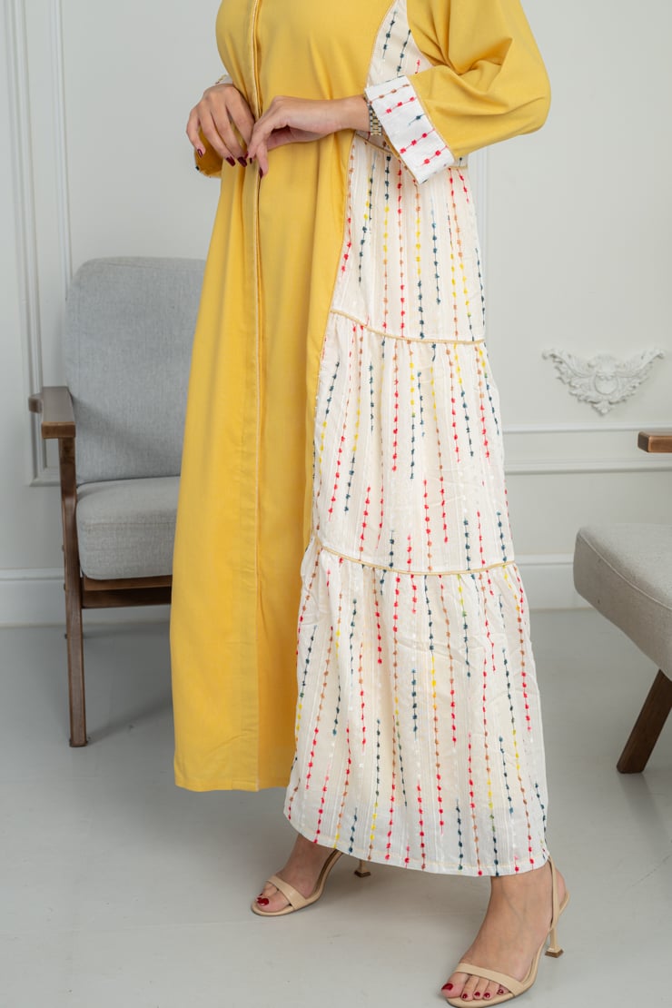 جلابية صفراء أنيقة بتفاصيل جانبية منقوشة