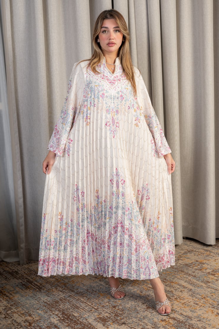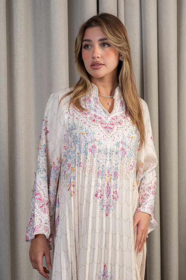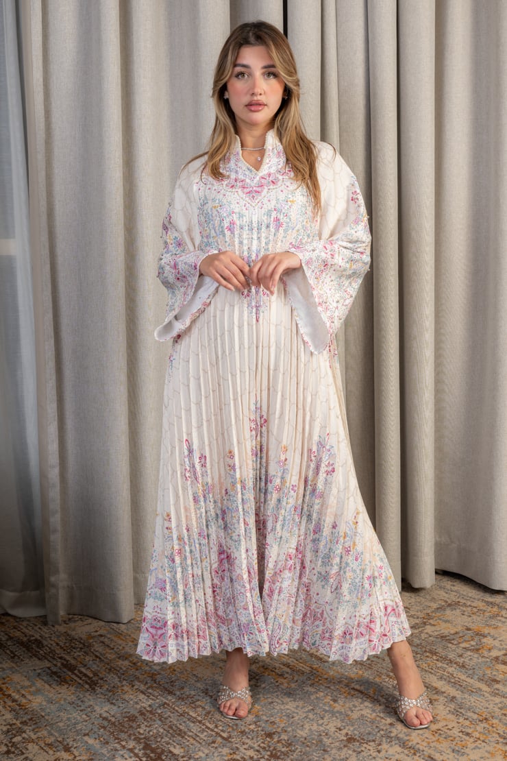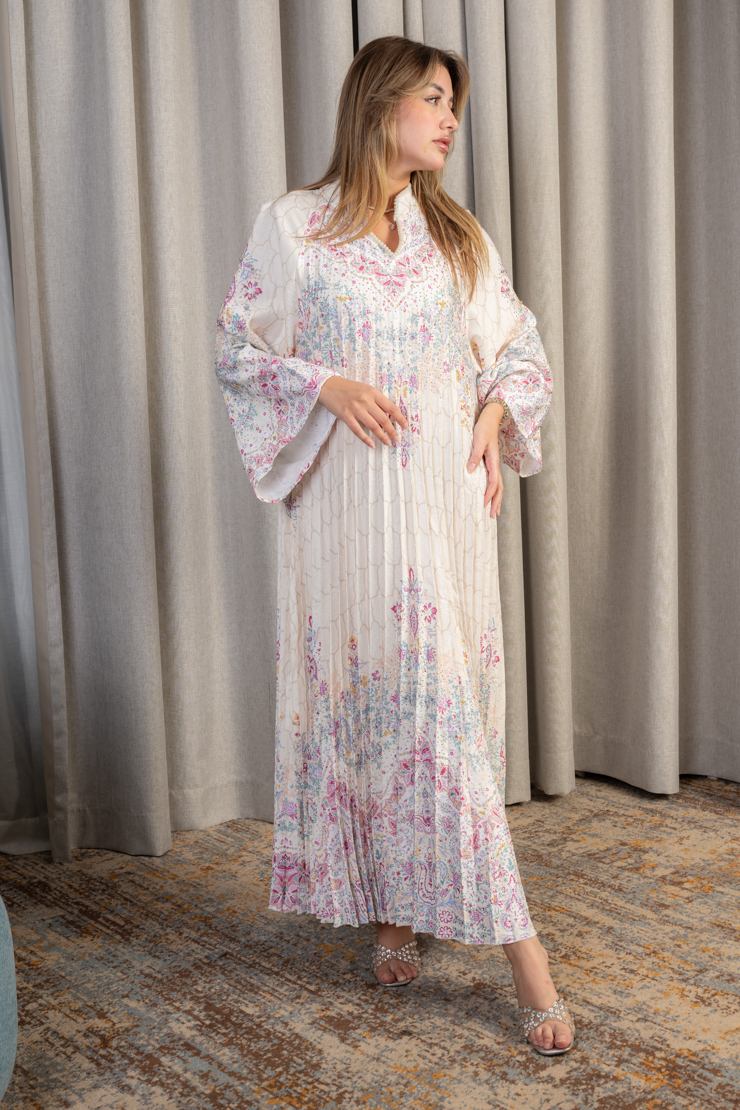 جلابية نسائية بقصة واسعة وانسيابية مصنوعة من قماش خفيف وناعم، تتميز بثنيات طولية تضيف انسيابية وأناقة واضحة. تتزين بنقوش زهرية ناعمة موزعة بتوازن على كامل الجلابية، مع أكمام واسعة تعزز من الراحة والطابع المحتشم. التصميم مناسب للإطلالات اليومية الراقية والمناسبات الهادئة التي تتطلب أناقة غير متكلفة.