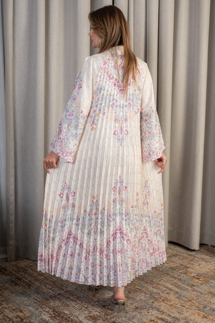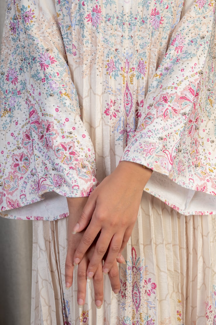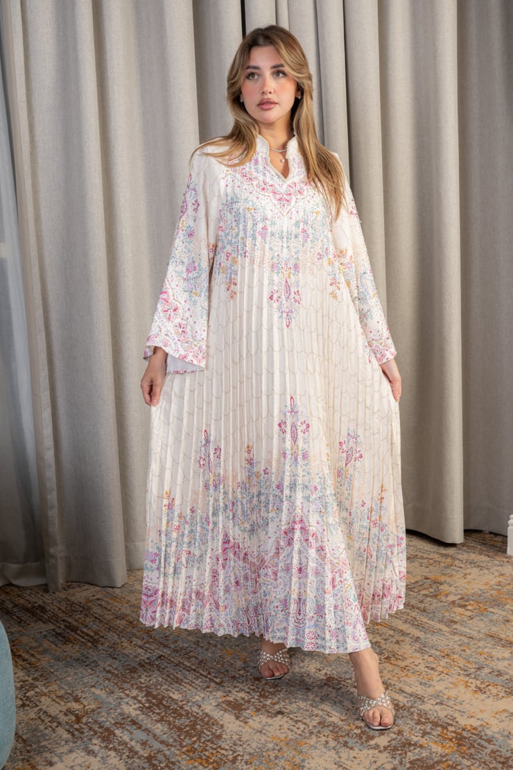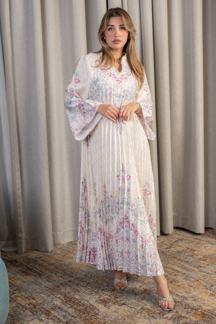 جلابية نسائية بقصة واسعة وانسيابية مصنوعة من قماش خفيف وناعم، تتميز بثنيات طولية تضيف انسيابية وأناقة واضحة. تتزين بنقوش زهرية ناعمة موزعة بتوازن على كامل الجلابية، مع أكمام واسعة تعزز من الراحة والطابع المحتشم. التصميم مناسب للإطلالات اليومية الراقية والمناسبات الهادئة التي تتطلب أناقة غير متكلفة.