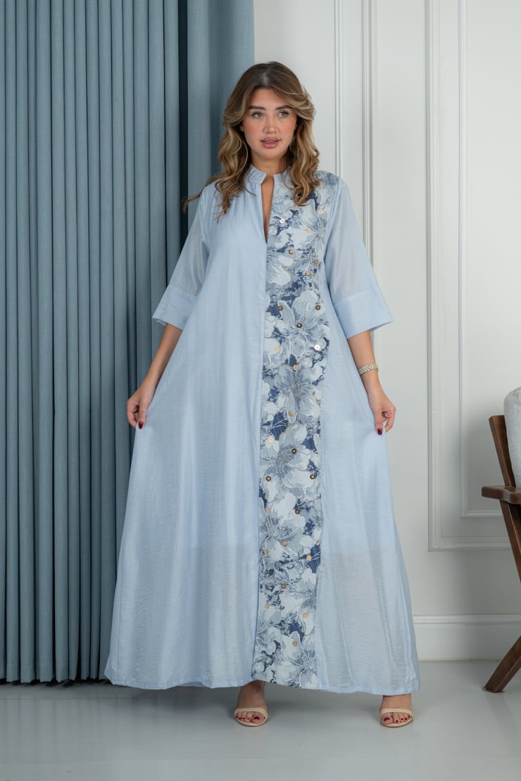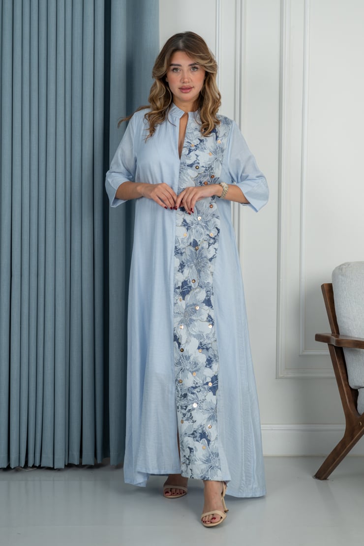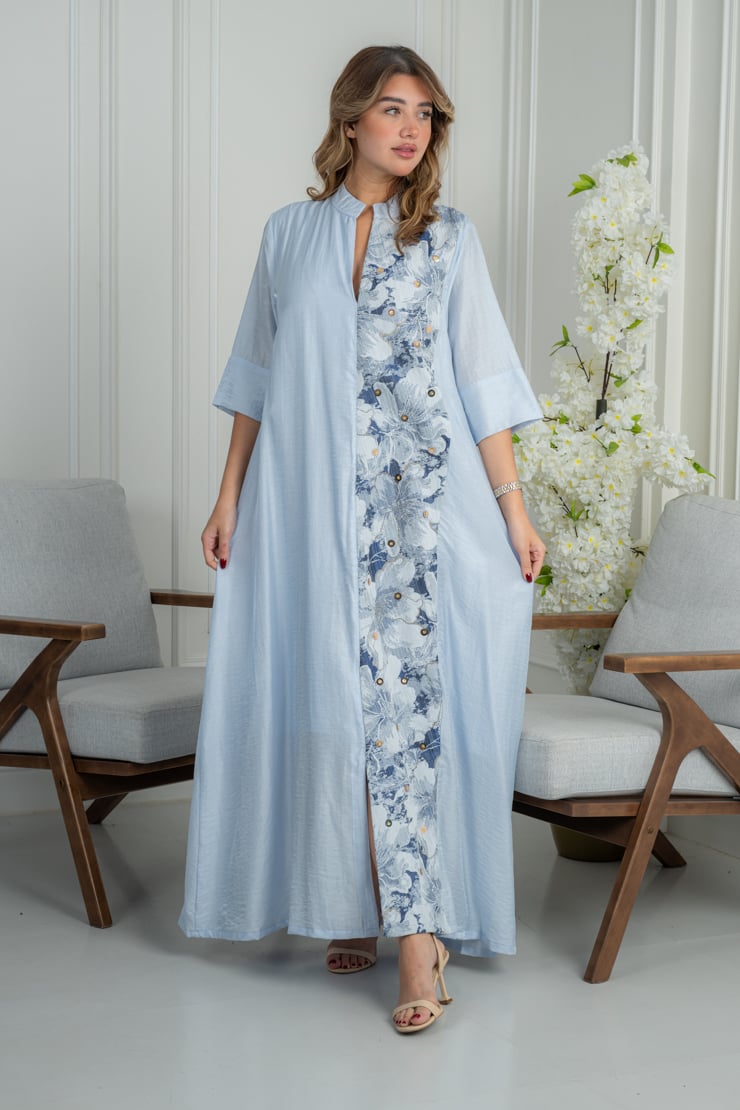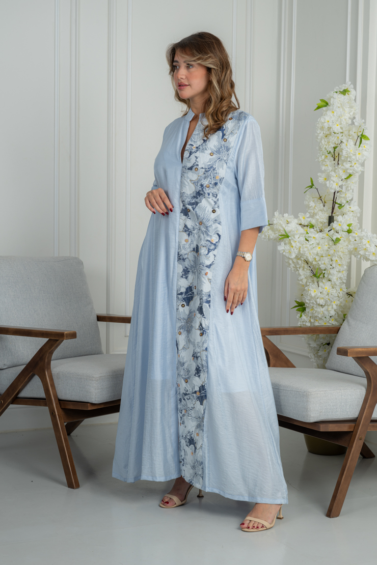 جلابية راقية بتصميم هادئ يعكس الأنوثة والبساطة، تجمع بين اللون الأزرق الفاتح ولمسات التطريز الزهري الناعم لإطلالة أنيقة ومريحة تناسب الذوق اليومي الراقي.