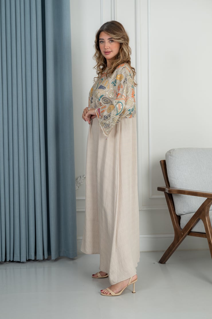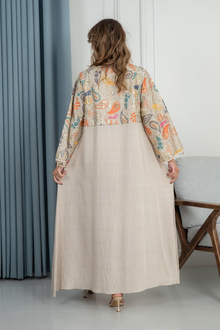 جلابية مصممة بقصة واسعة وانسيابية تضمن الراحة والأناقة معًا. تتميز بجزء علوي مزخرف بنقوش فنية ناعمة تضيف طابعًا مميزًا، مع أكمام واسعة تمنح حرية الحركة ولمسة أنثوية جذابة. القماش خفيف وناعم، مناسب للاستخدام اليومي أو المناسبات البسيطة، ويعكس أسلوبًا محتشمًا وراقيًا.
