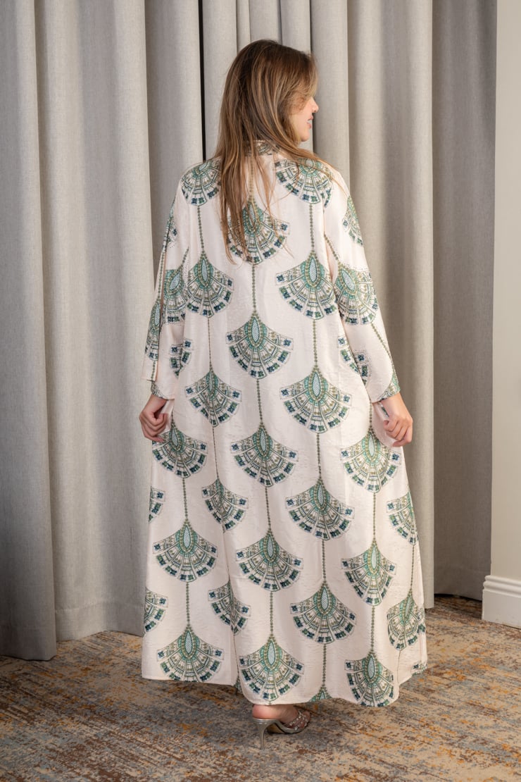 جلابية نسائية بقصة واسعة وانسيابية مصنوعة من قماش خفيف وناعم يوفر راحة عالية طوال اليوم. يتميز التصميم بنقوش هندسية أنيقة موزعة على كامل الجلابية، مع أكمام واسعة تضيف طابعًا مريحًا وفخمًا في الوقت نفسه. القصة الفضفاضة تمنح حرية حركة وأناقة هادئة، ما يجعل الجلابية خيارًا مثاليًا للإطلالات اليومية الراقية والمناسبات النسائية الهادئة.