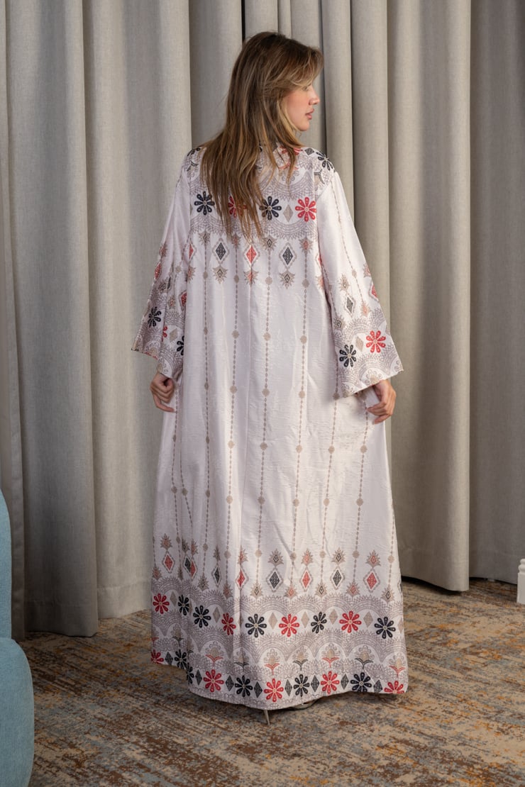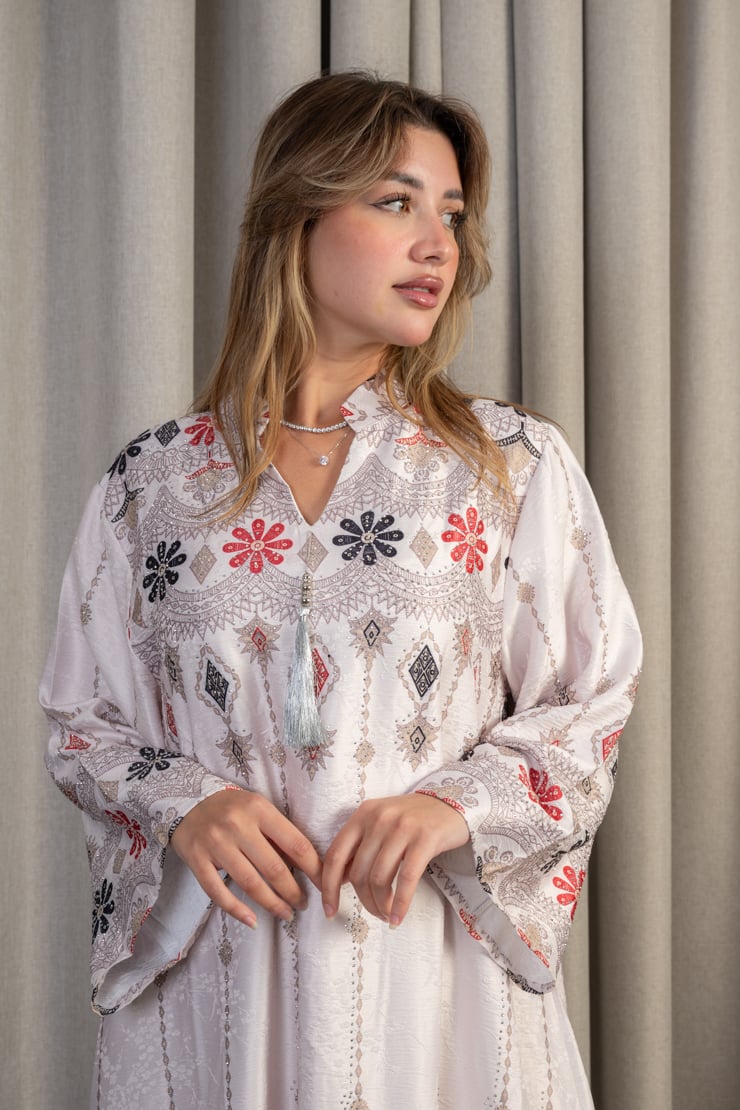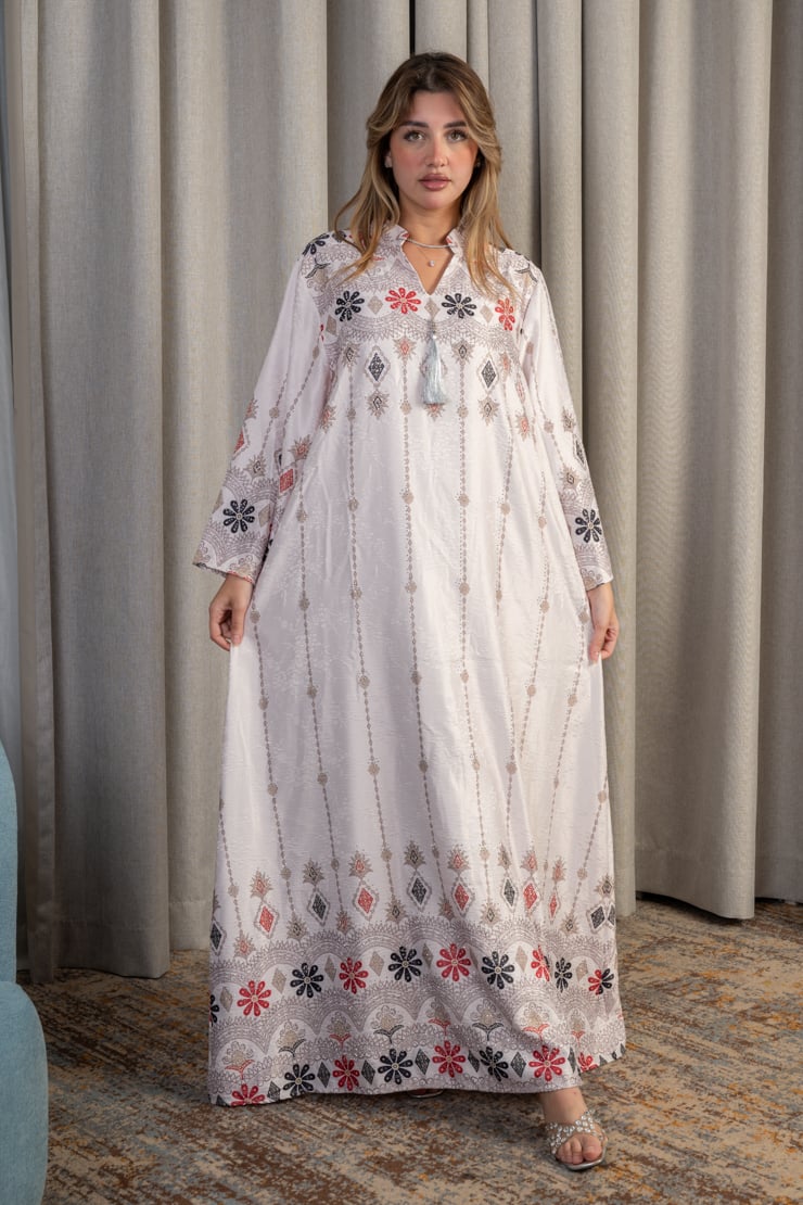جلابية نسائية بقصة واسعة وانسيابية، مصنوعة من قماش خفيف ومريح للاستخدام اليومي والمناسبات الهادئة. تتميز بنقوش تطريز تراثية موزعة بعناية على كامل التصميم، مع أكمام طويلة تضيف لمسة أنيقة ومحتشمة. القصة الفضفاضة تمنح راحة عالية وحركة سهلة، مما يجعل الجلابية خيارًا مثاليًا للإطلالات الراقية غير المتكلفة.
