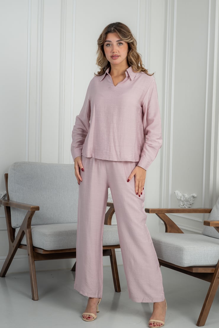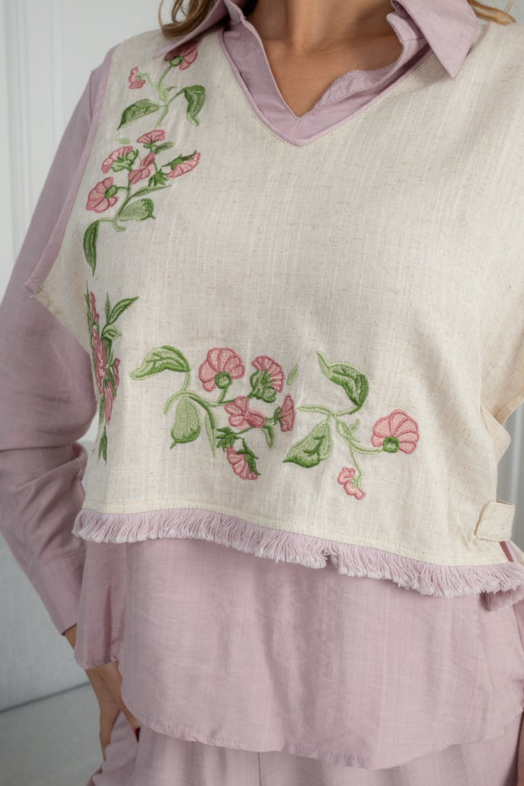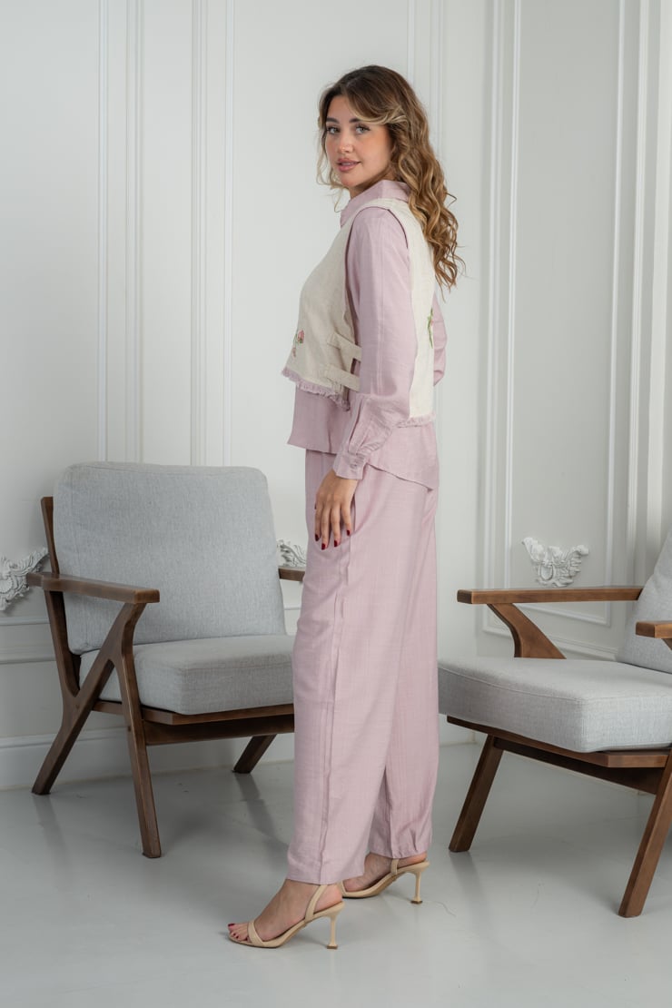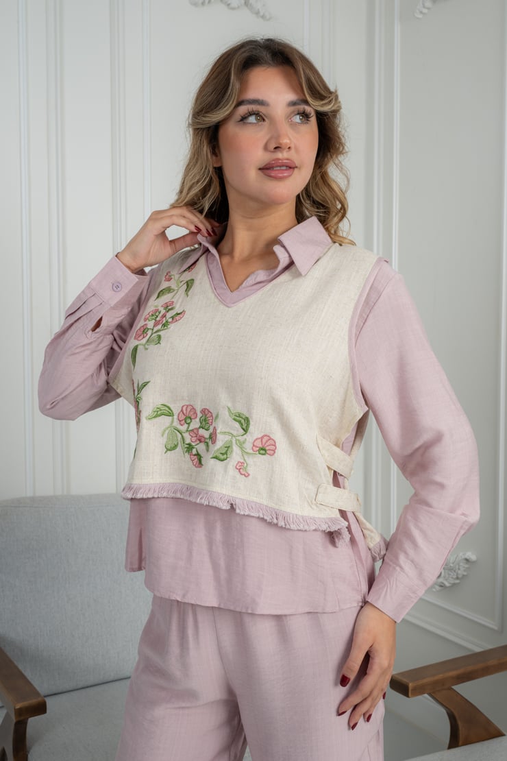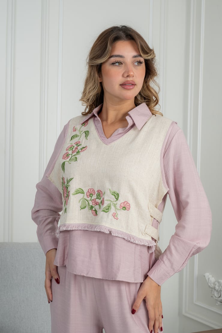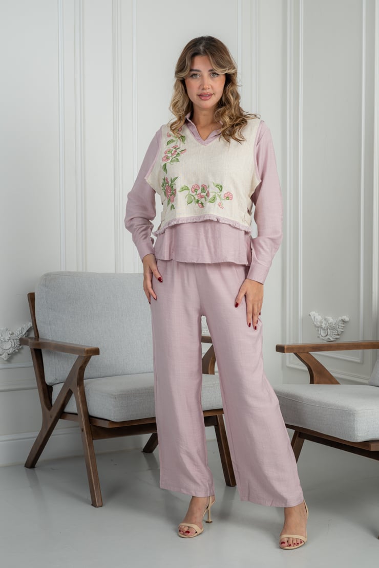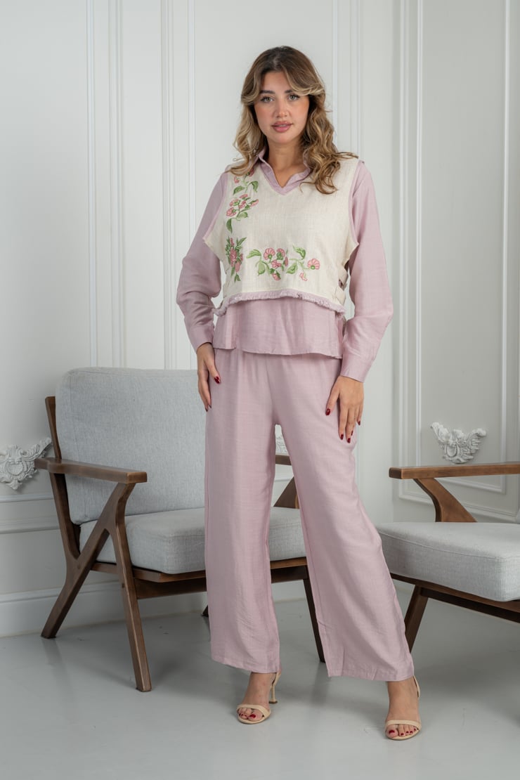 طقم مكوّن من قطعتين، بلوزة بأكمام طويلة مع طبقة علوية مزينة بتطريز زهري ناعم، وبنطال بقصة مستقيمة مريحة. التصميم متناسق ومناسب للاستخدام اليومي، والقماش خفيف يمنح إحساسًا بالراحة طوال اليوم مع سهولة في التنسيق.