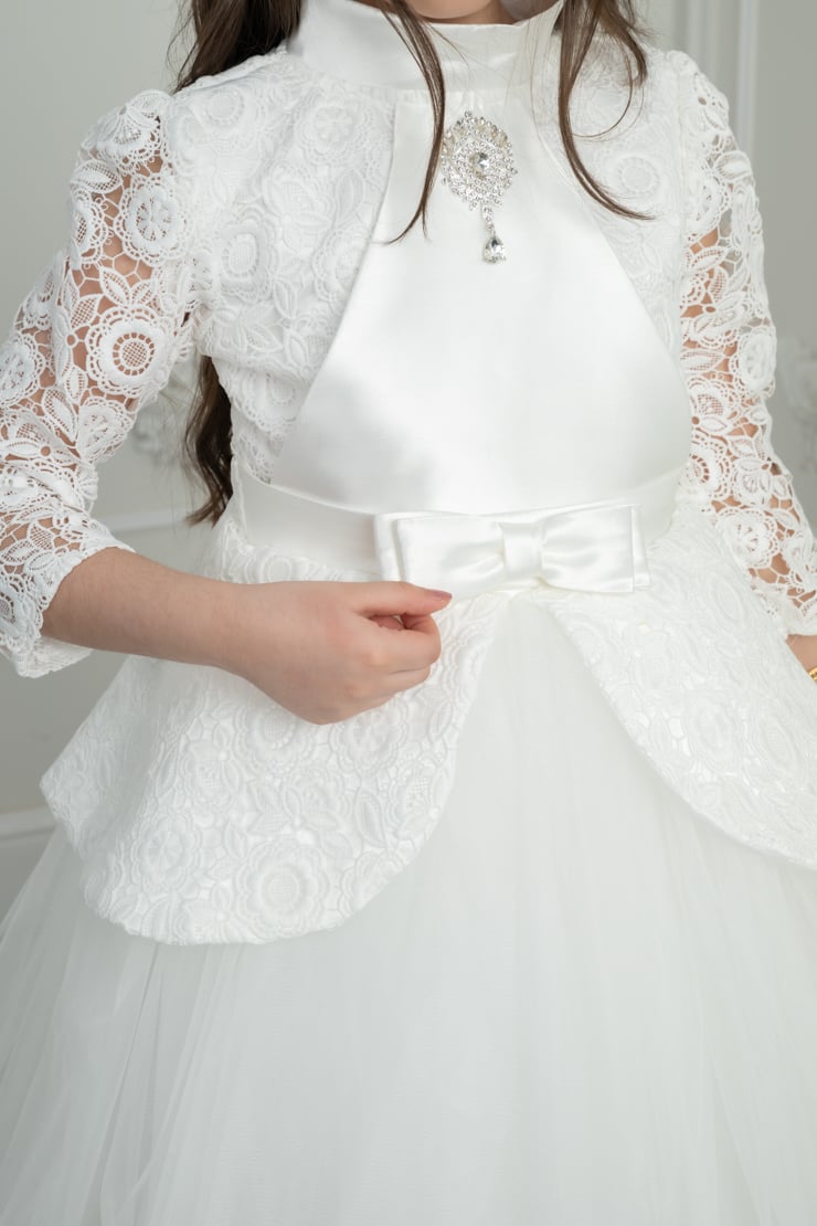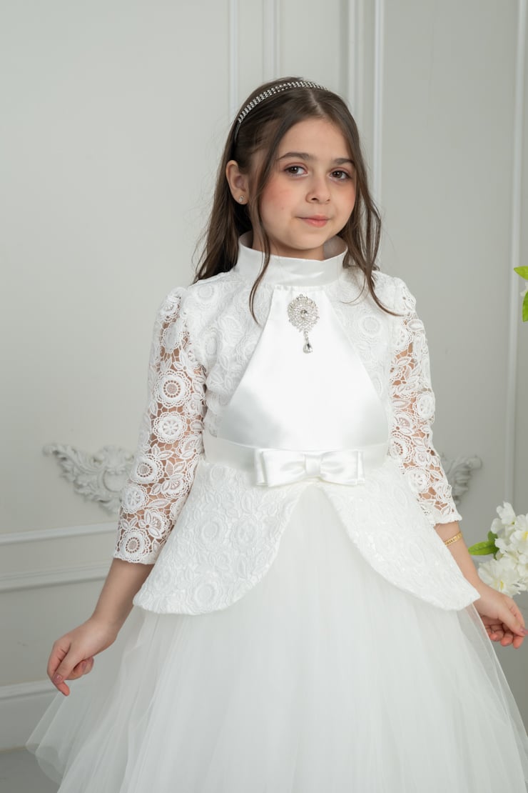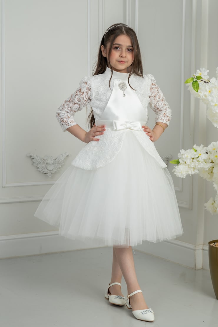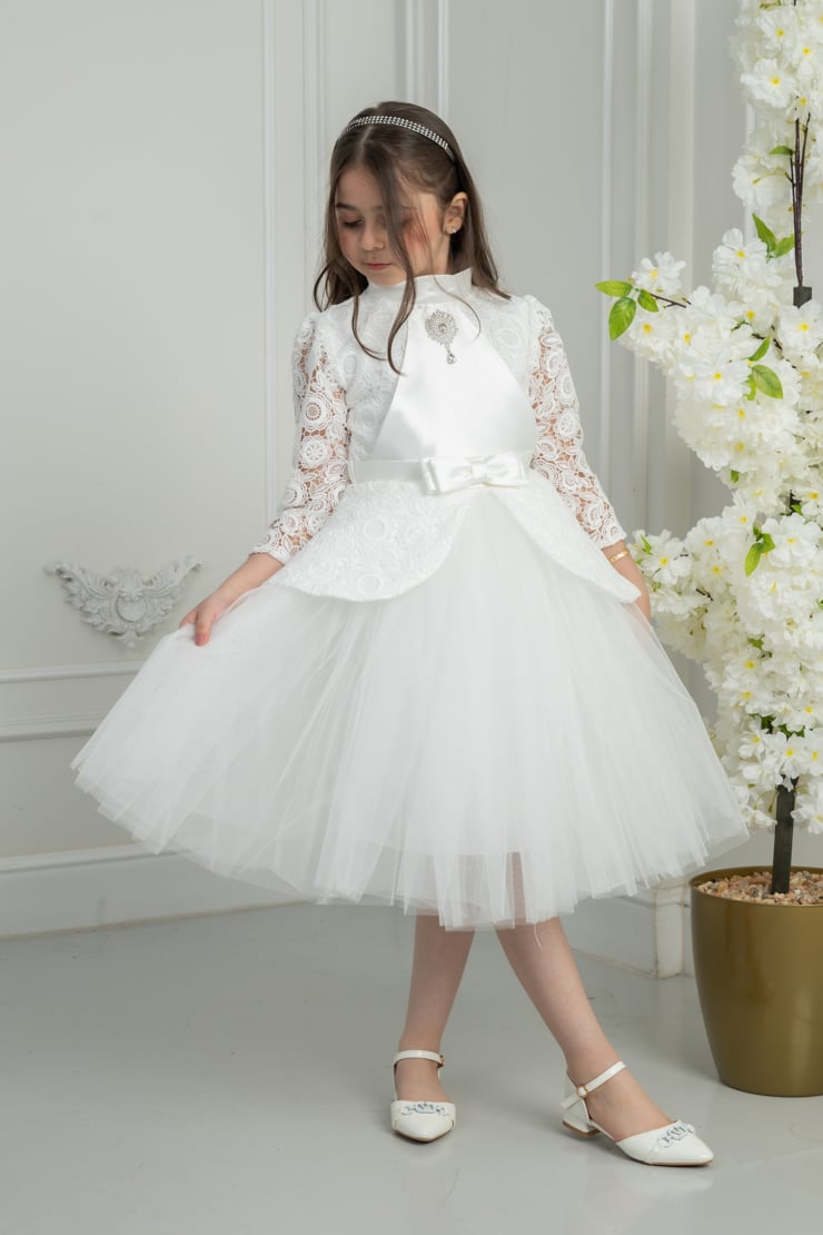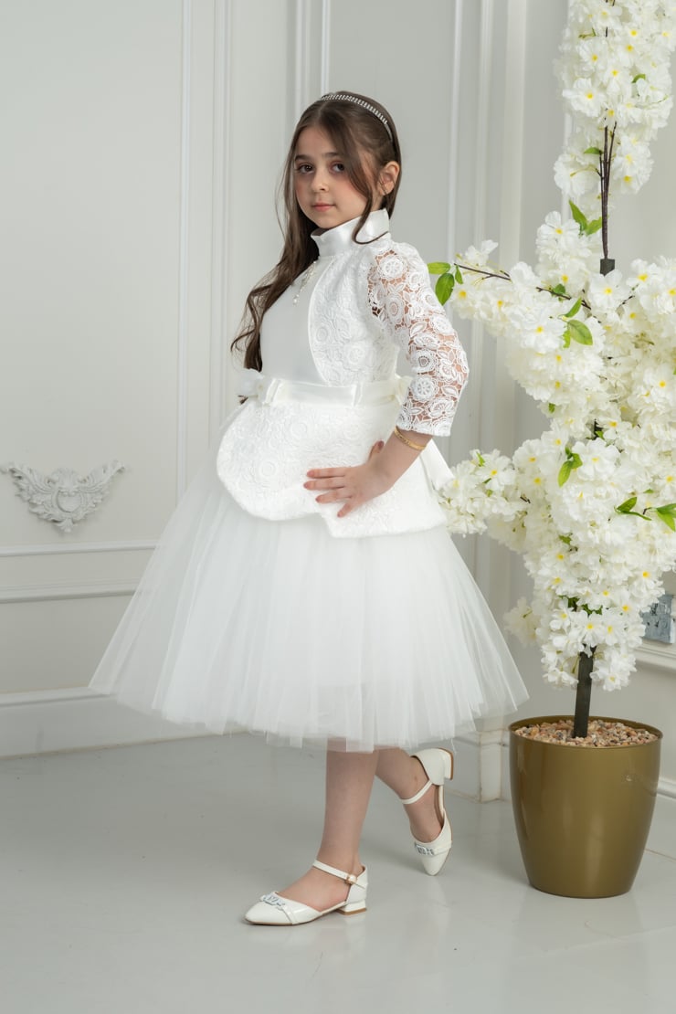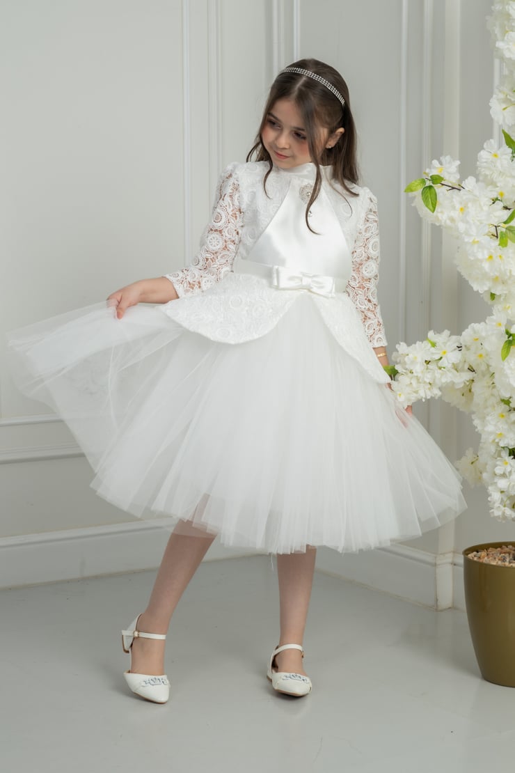 فستان أطفال باللون الأبيض يتميز بتصميم فاخر مع أكمام من الدانتيل وتنورة من التول الناعم بقصة منفوشة. مزود بحزام أنيق يبرز جمال التصميم. مثالي للأفراح، الأعياد، والمناسبات الرسمية.