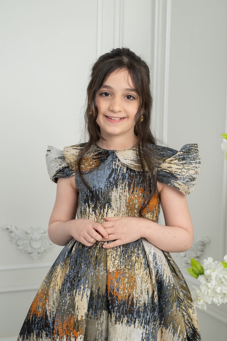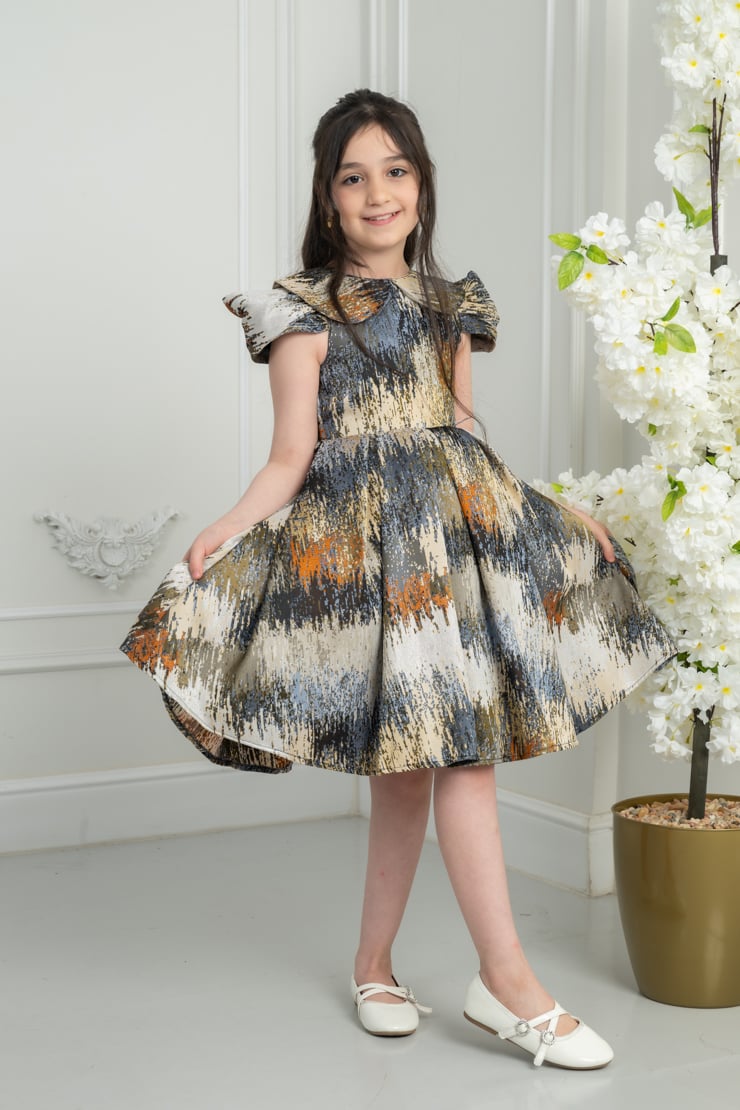 فستان أطفال بتدرجات الأسود والذهبي يتميز بنقشات فنية وقصة واسعة تمنح راحة وأناقة. الأكمام القصيرة تضيف لمسة طفولية أنيقة، مما يجعله مناسباً للحفلات والمناسبات الخاصة.