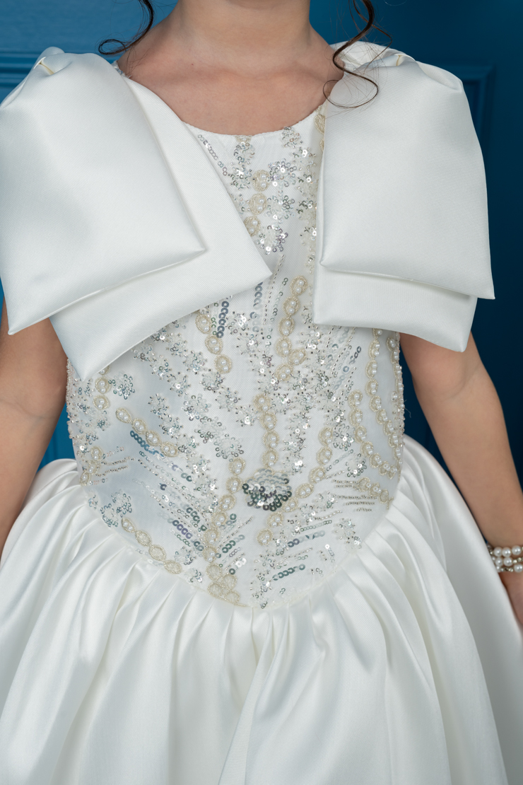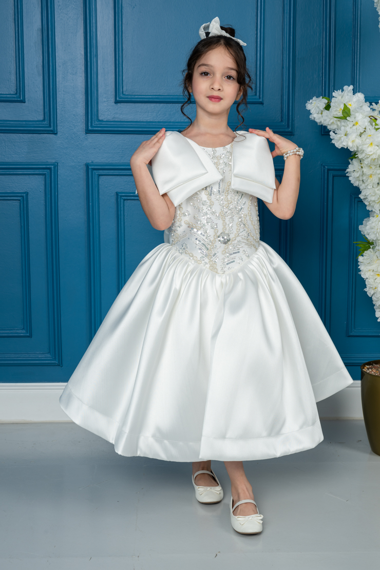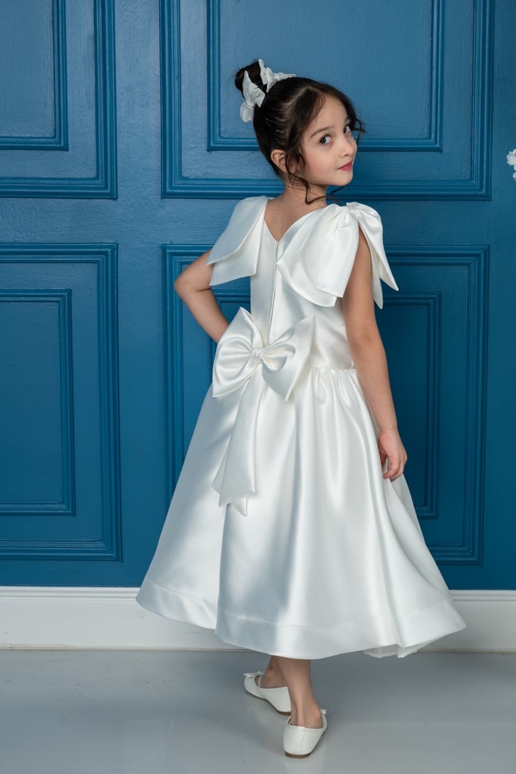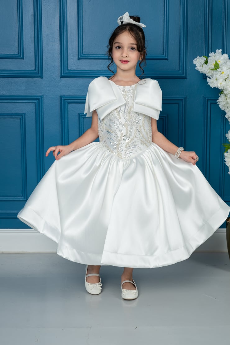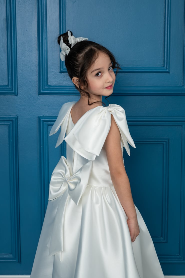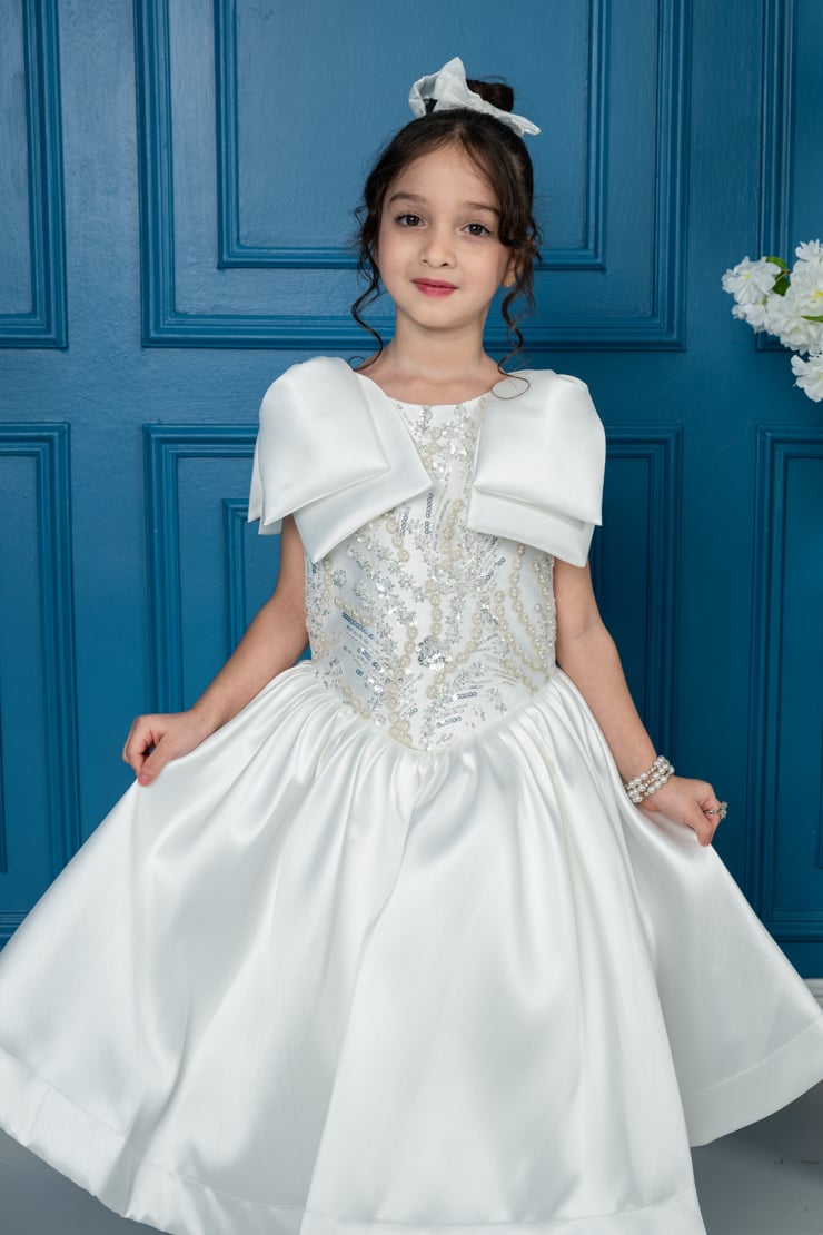 فستان بناتي فاخر بلون أبيض لامع مصنوع من قماش ساتان عالي الجودة يمنح إطلالة راقية وناعمة.