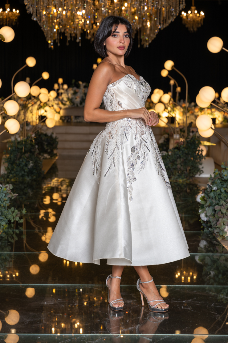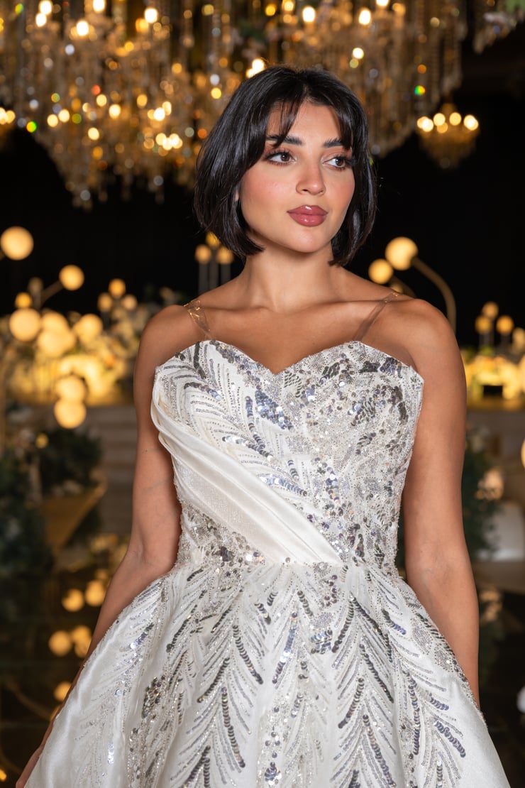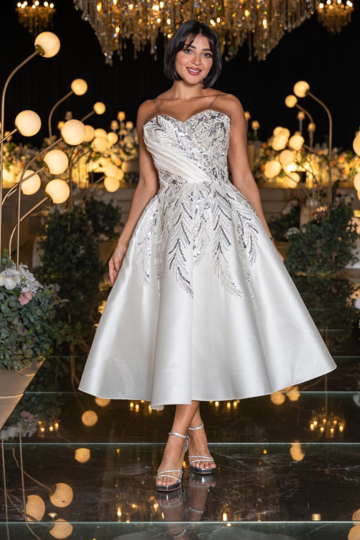 فستان سهرة أبيض فاخر من Lora بتصميم قصير أنيق وتطريز فخم بتفاصيل لامعة تعكس الفخامة والرقي، مثالي لإطلالة عصرية مميزة في المناسبات الراقية.