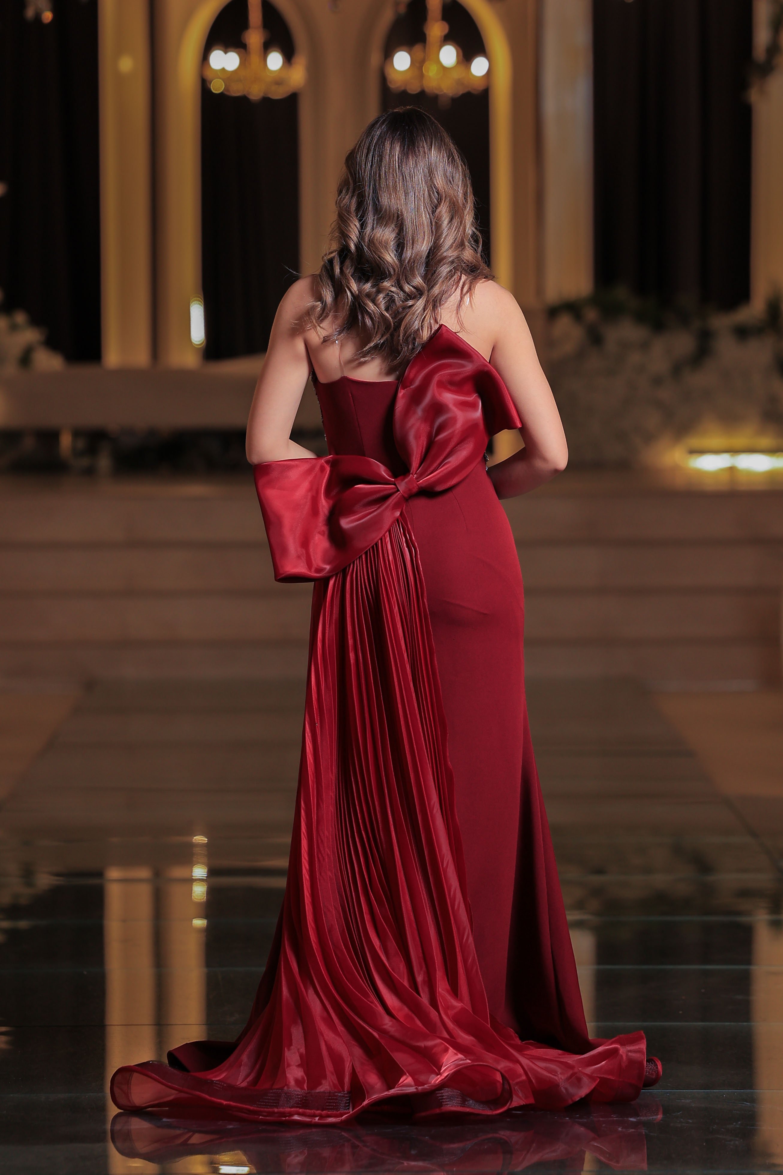 يتميز التصميم بلمسة دراماتيكية راقية مع ذيل طويل ناعم وانسدال حريري من الخلف، مما يضفي على الإطلالة حضورًا ملكيًا ساحرًا في كل مناسبة.