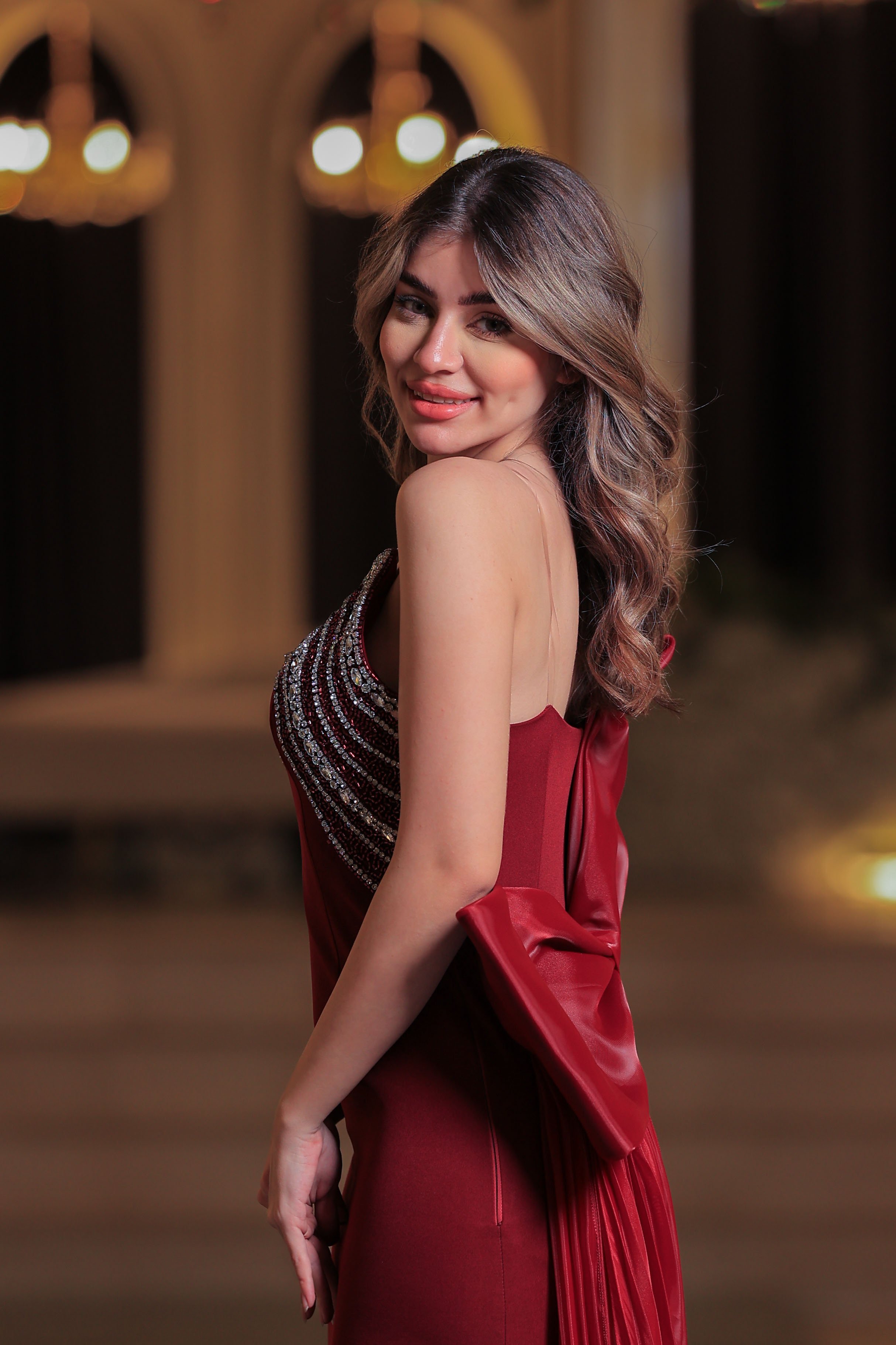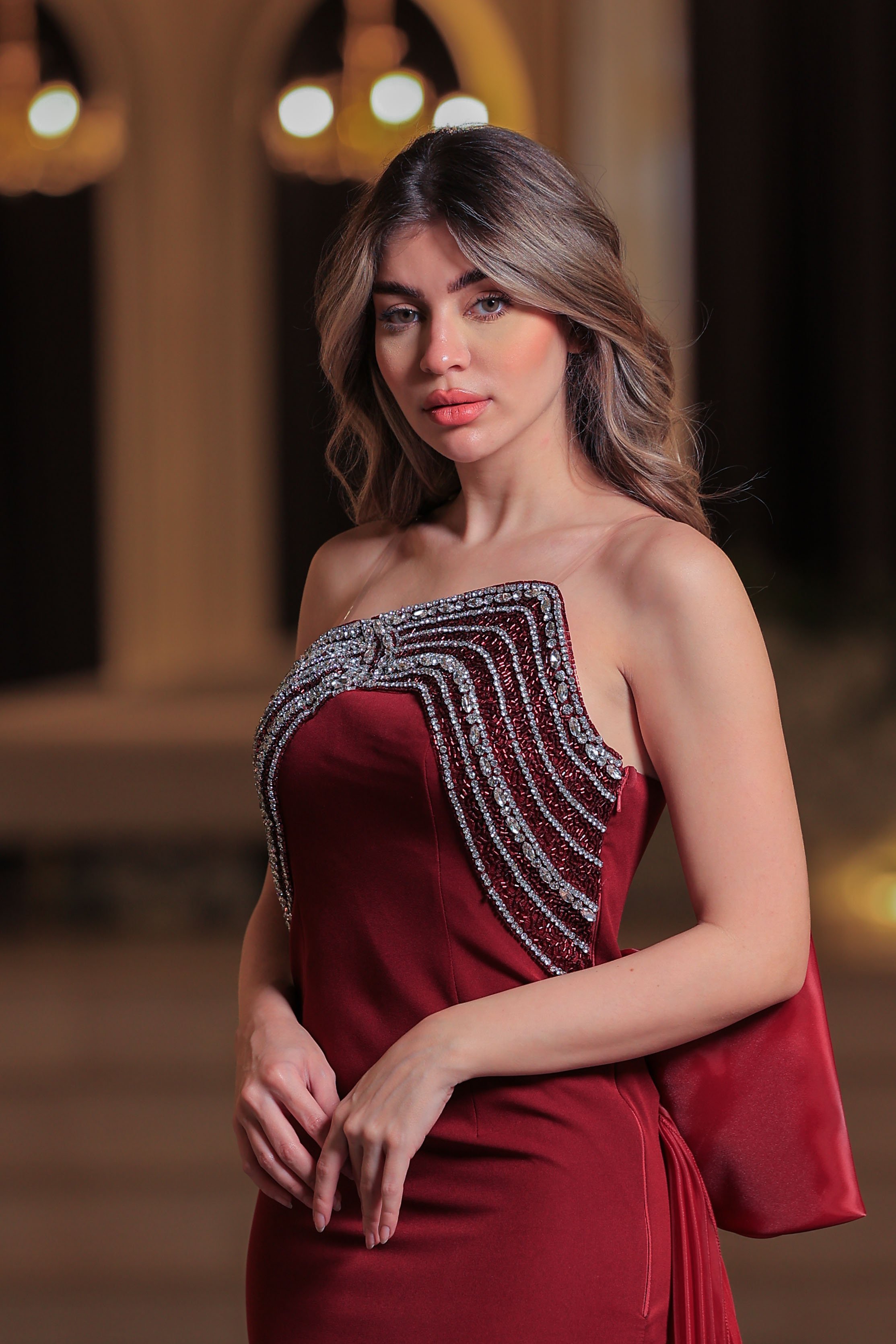 فستان سهرة أحمر ضيق بتفاصيل كريستالية من Loraتميّزي بإطلالة تأسر الأنظار مع هذا الفستان الأحمر الفاخر من Lora، المصمم ليجمع بين الأناقة الكلاسيكية والبريق العصري.