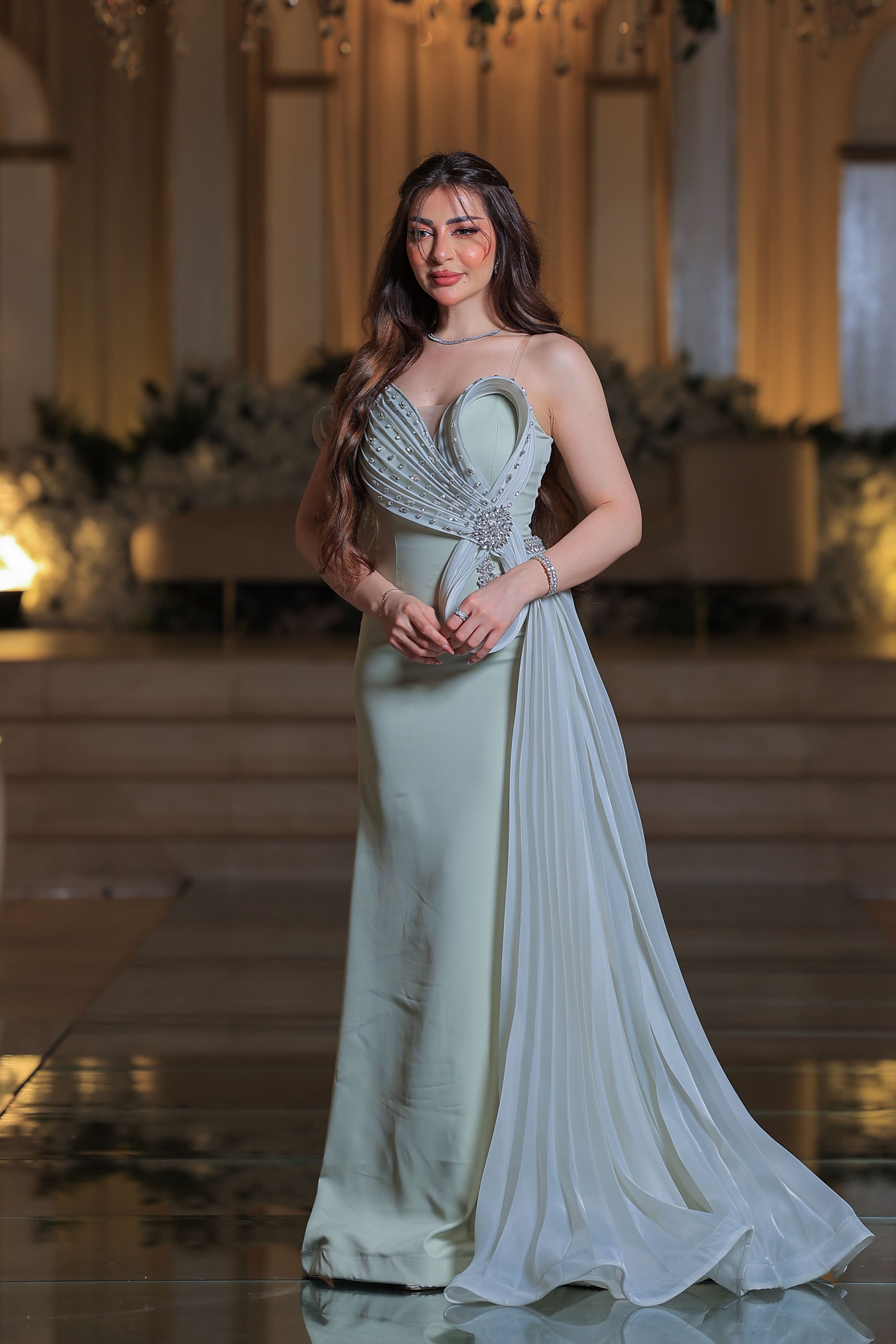 فستان سهرة أخضر فاتح بتصميم فاخر وتطريز كريستالي