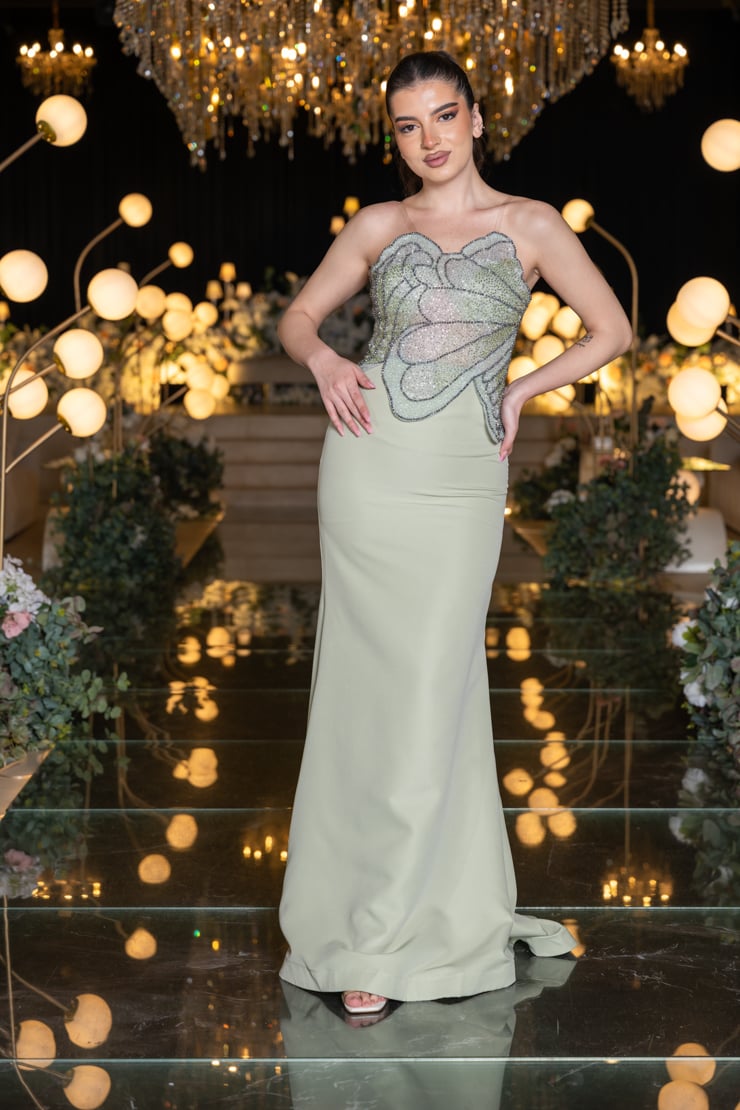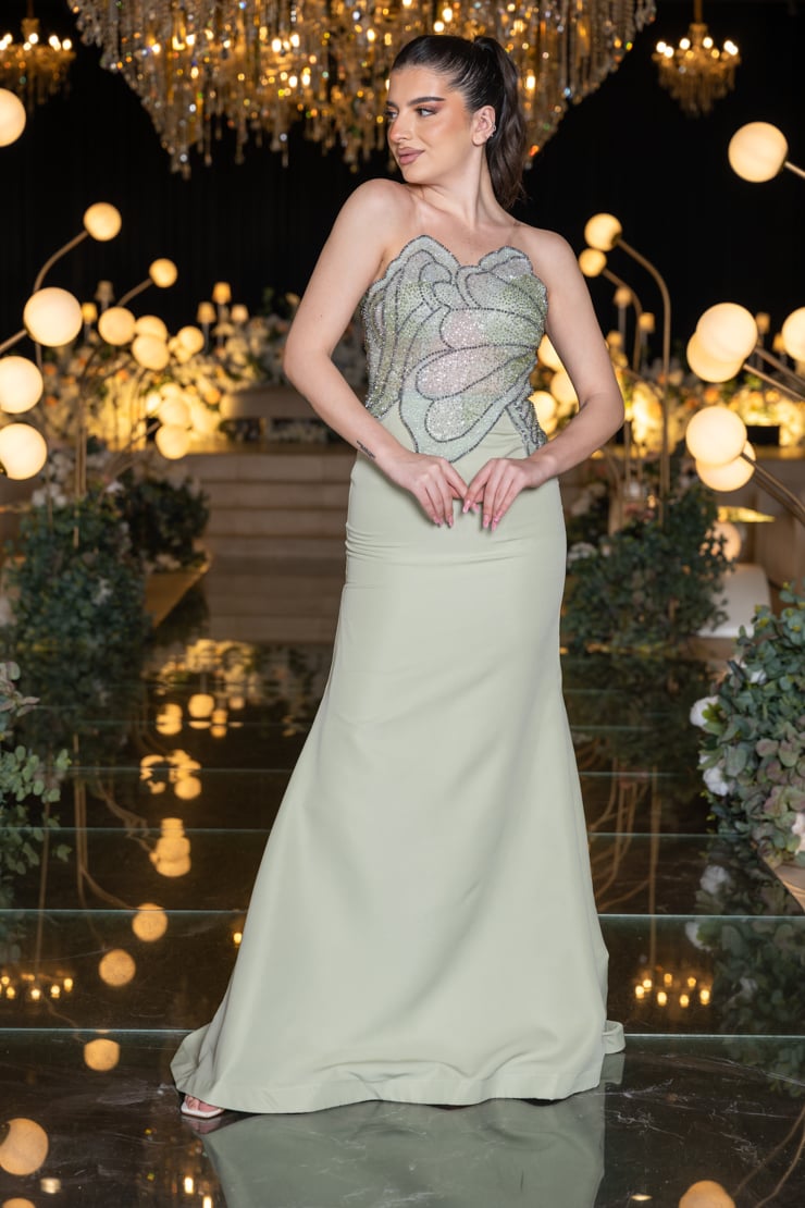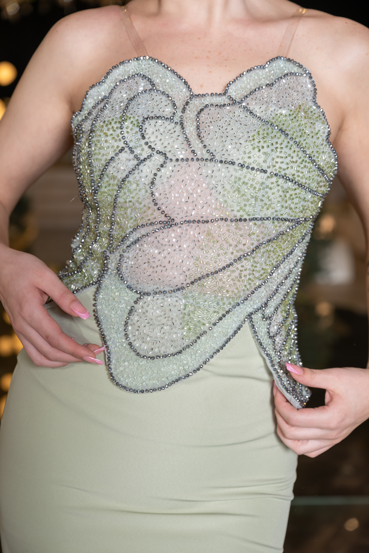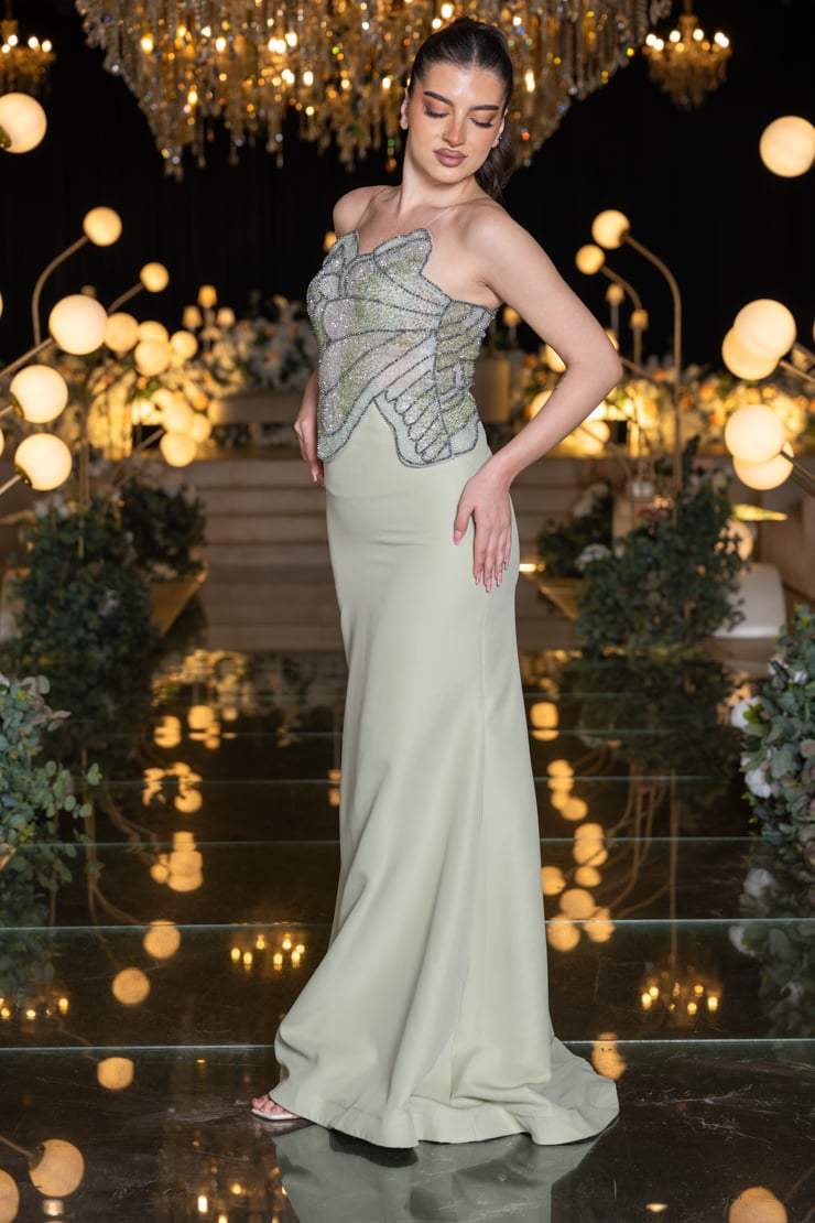 فستان سهرة أخضر فاتح بتطريز لامع وتصميم راقٍ