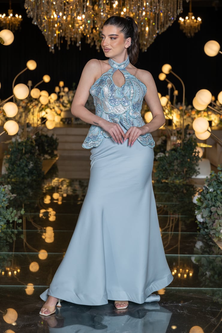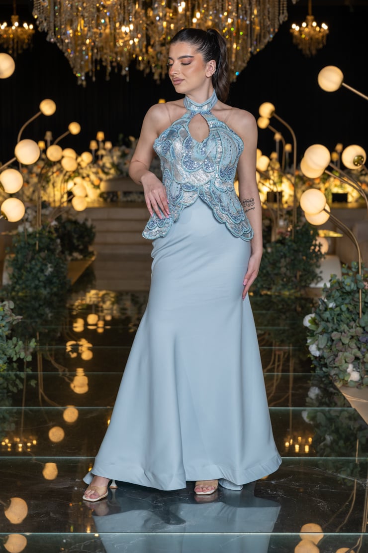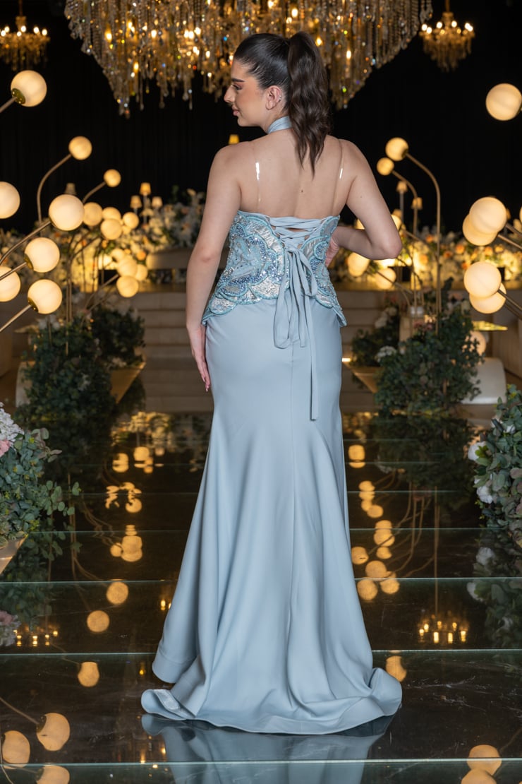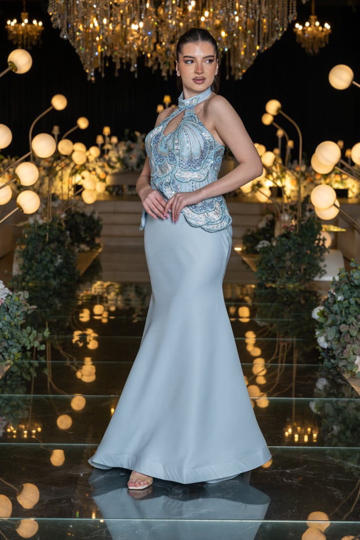 الياقة المرتفعة مع الربطة الخلفية تمنح الفستان حضورًا ملكيًا، في حين يضفي اللون الأزرق السماوي لمسة من الرقي والهدوء المثالي للمناسبات المسائية.