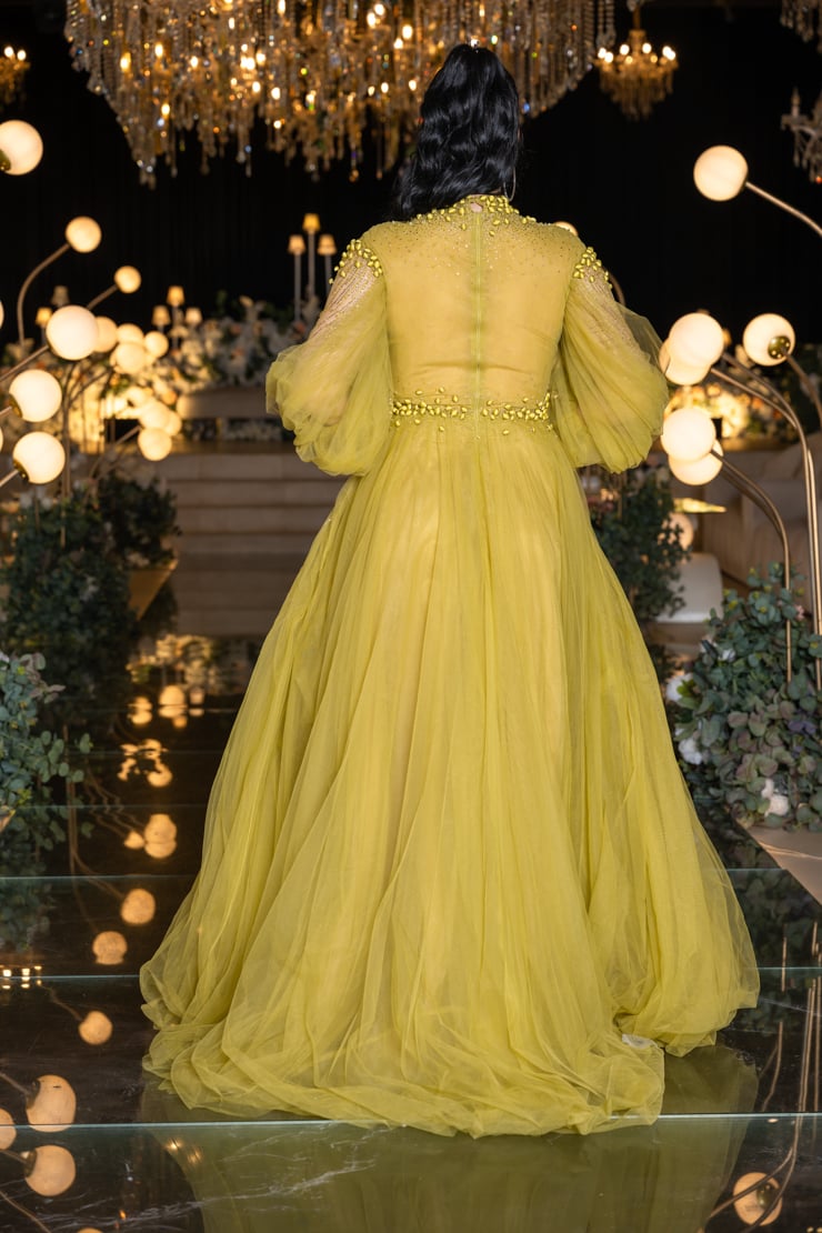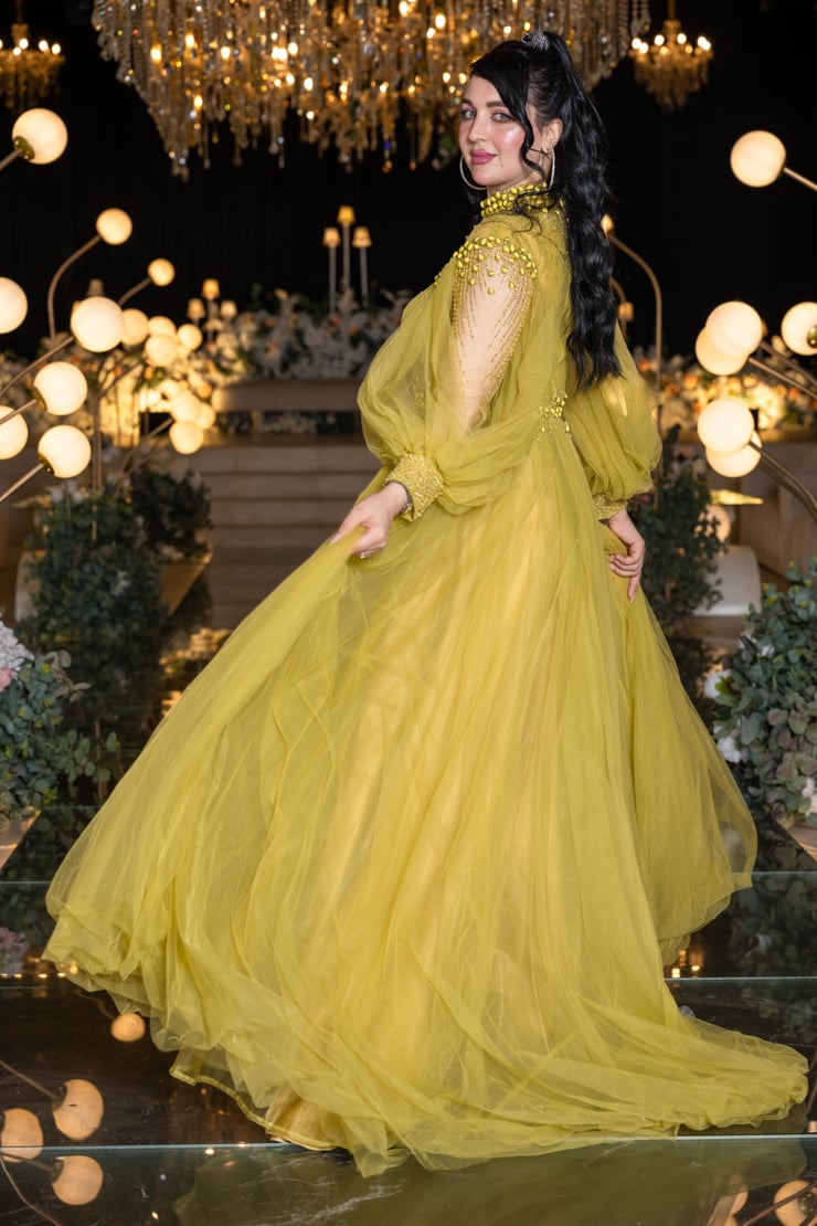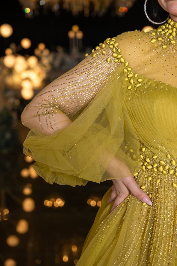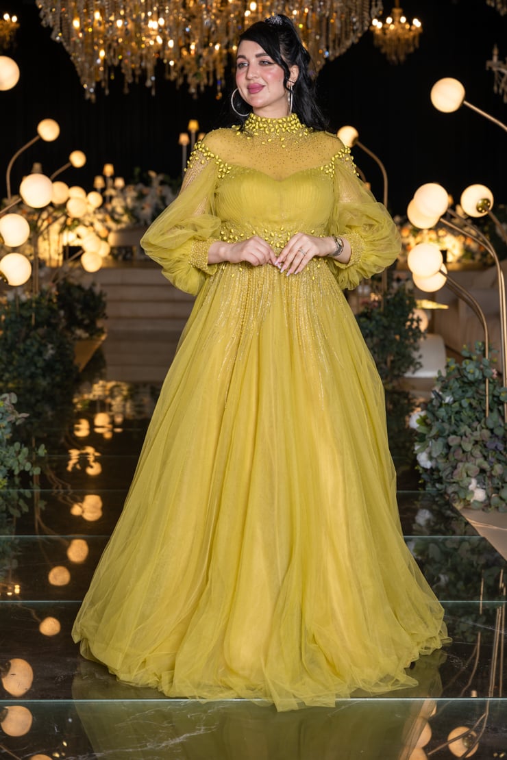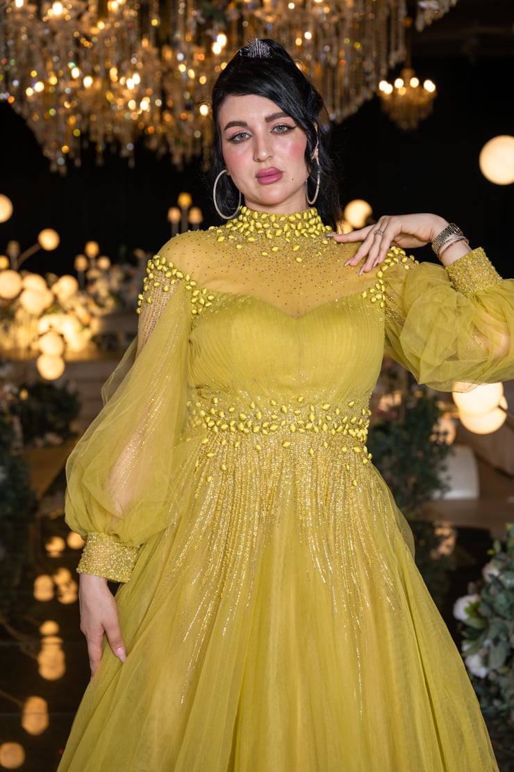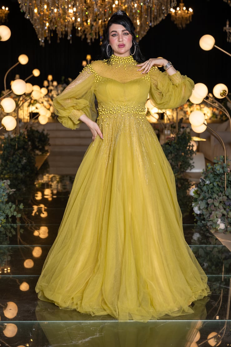 فستان سهرة أصفر من Lora بتصميم ملكي فاخر وتفاصيل لؤلؤية تضفي لمسة راقية من الفخامة والأناقة، مثالي للإطلالات المبهرة في المناسبات الخاصة.