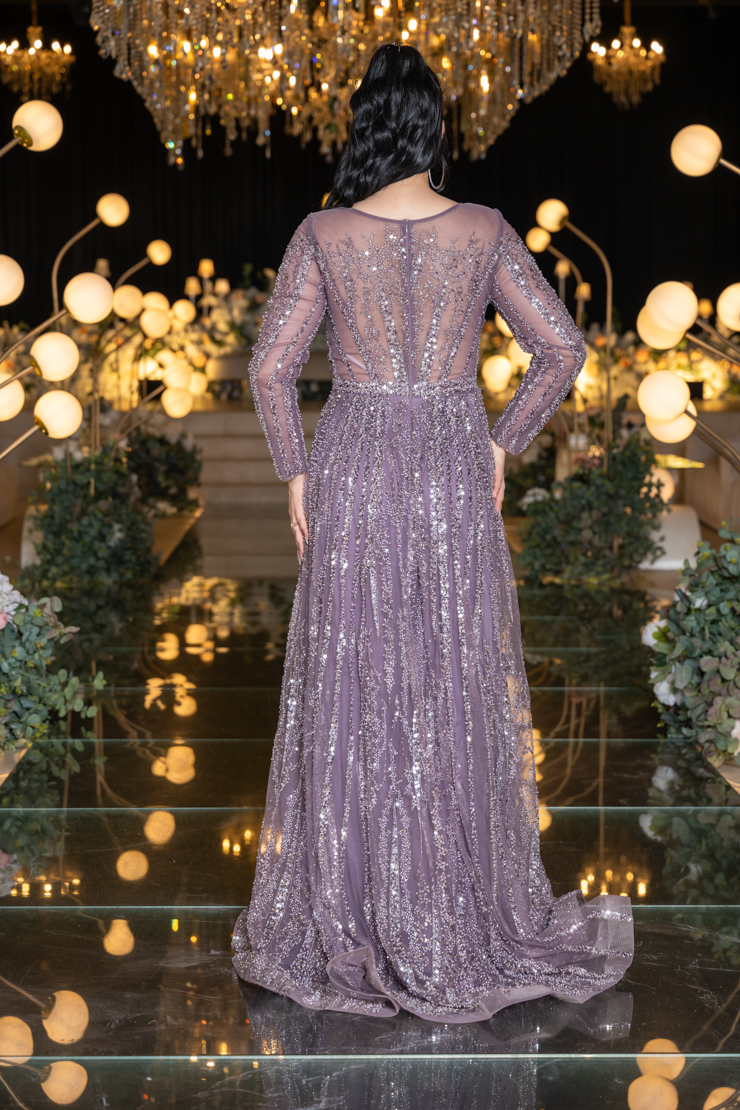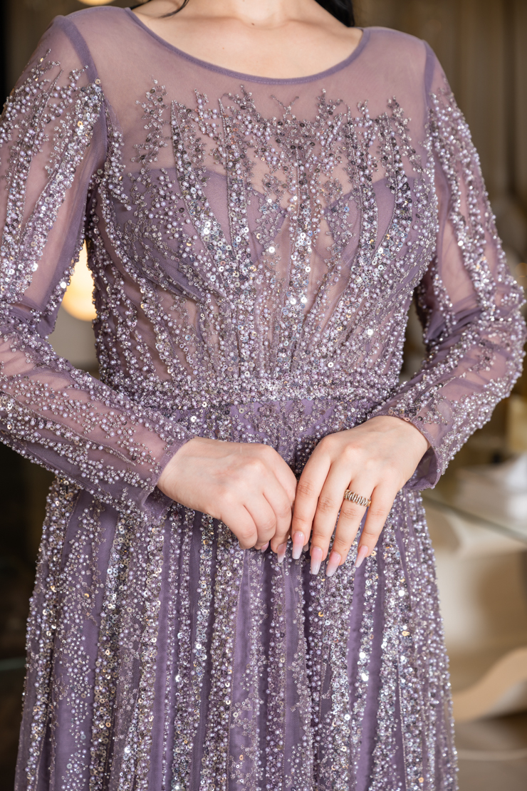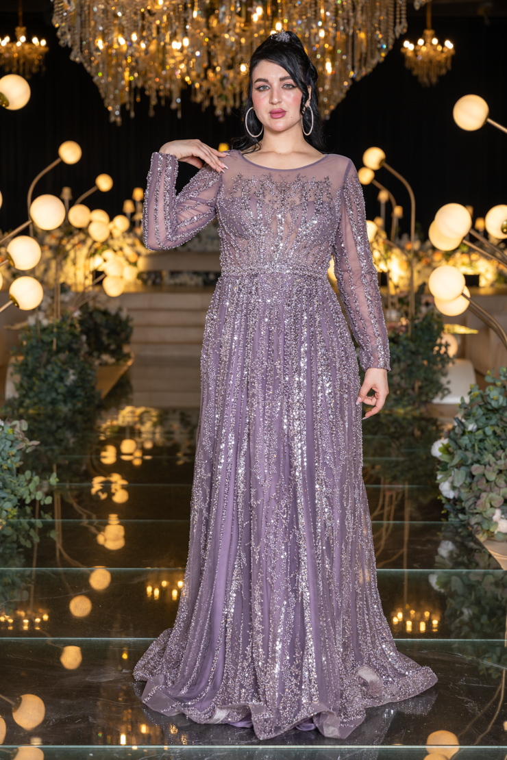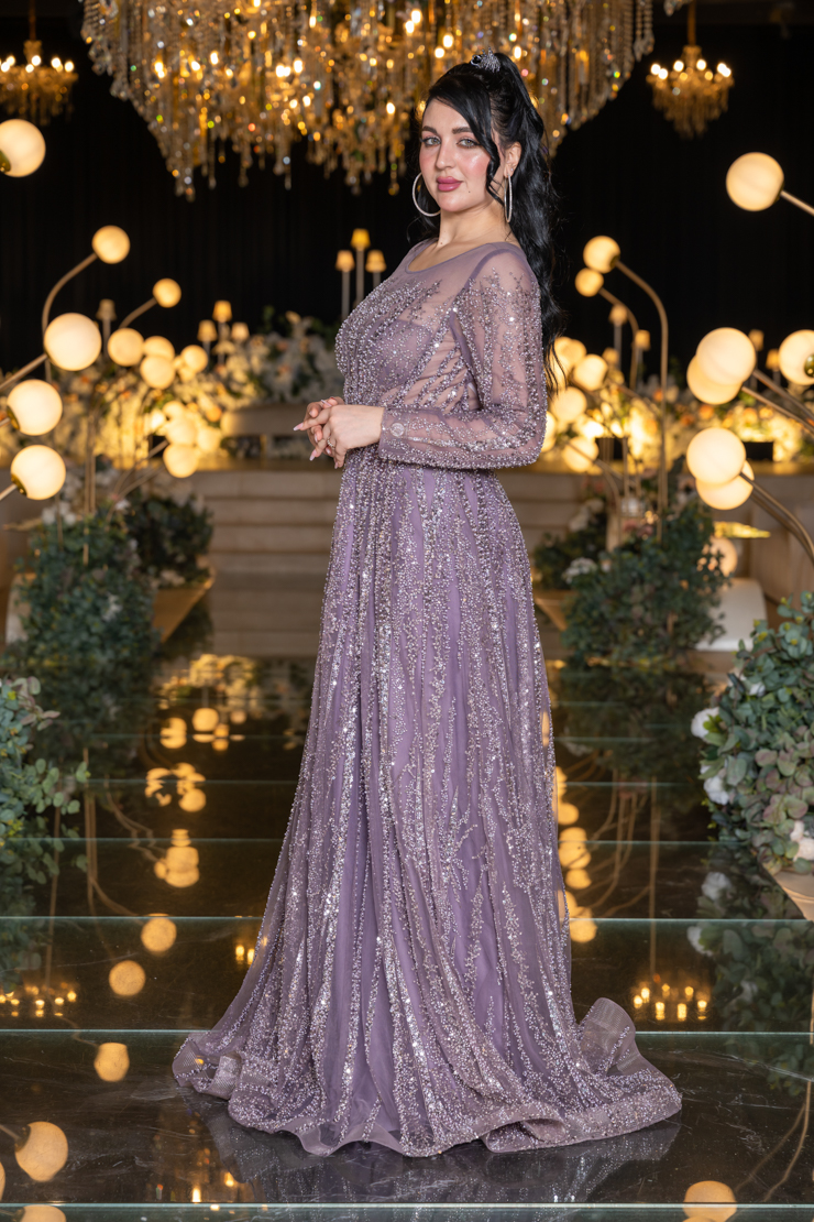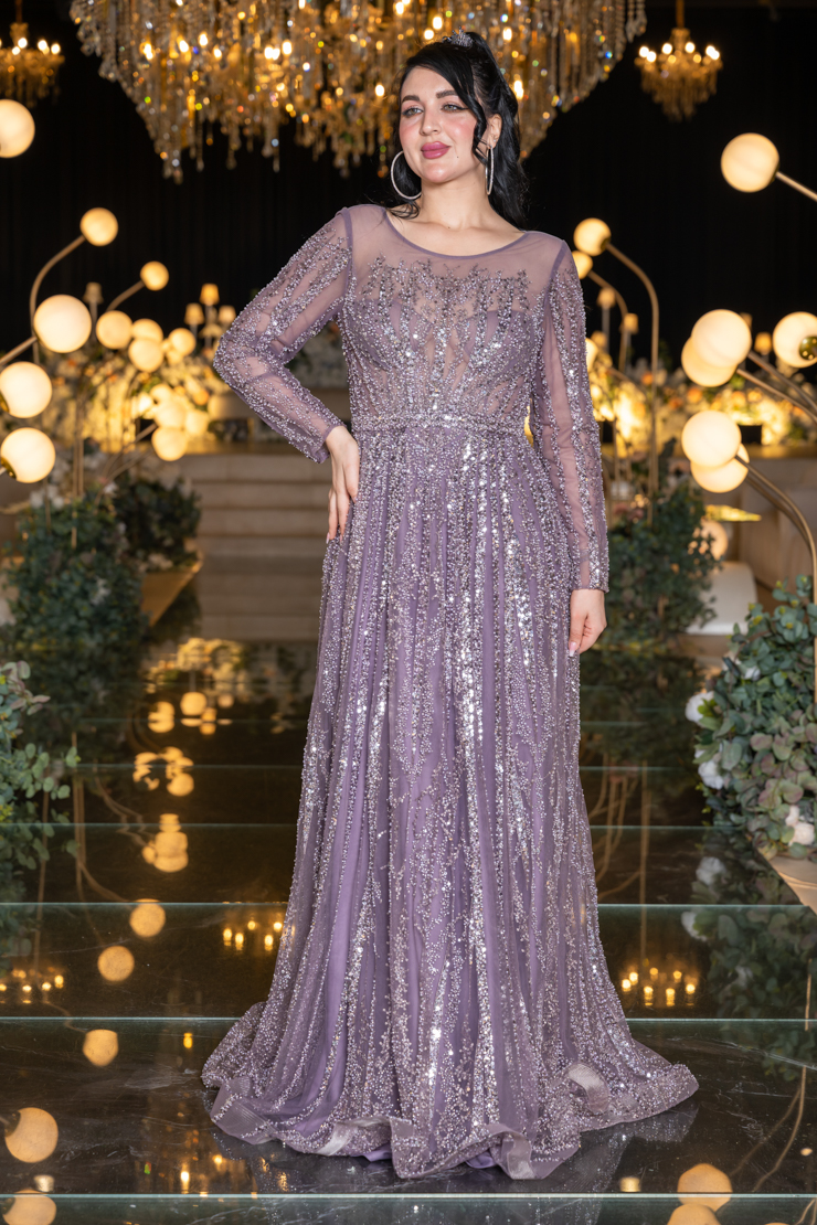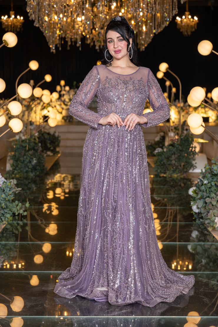 فستان سهرة بنفسجي فاخر من Lora بتصميم أنيق ومطرز بالكامل بتفاصيل براقة تمنحك إطلالة فخمة وساحرة في المناسبات الخاصة. يتميز بأكمام طويلة شفافة تضيف لمسة من الرقي والنعومة.