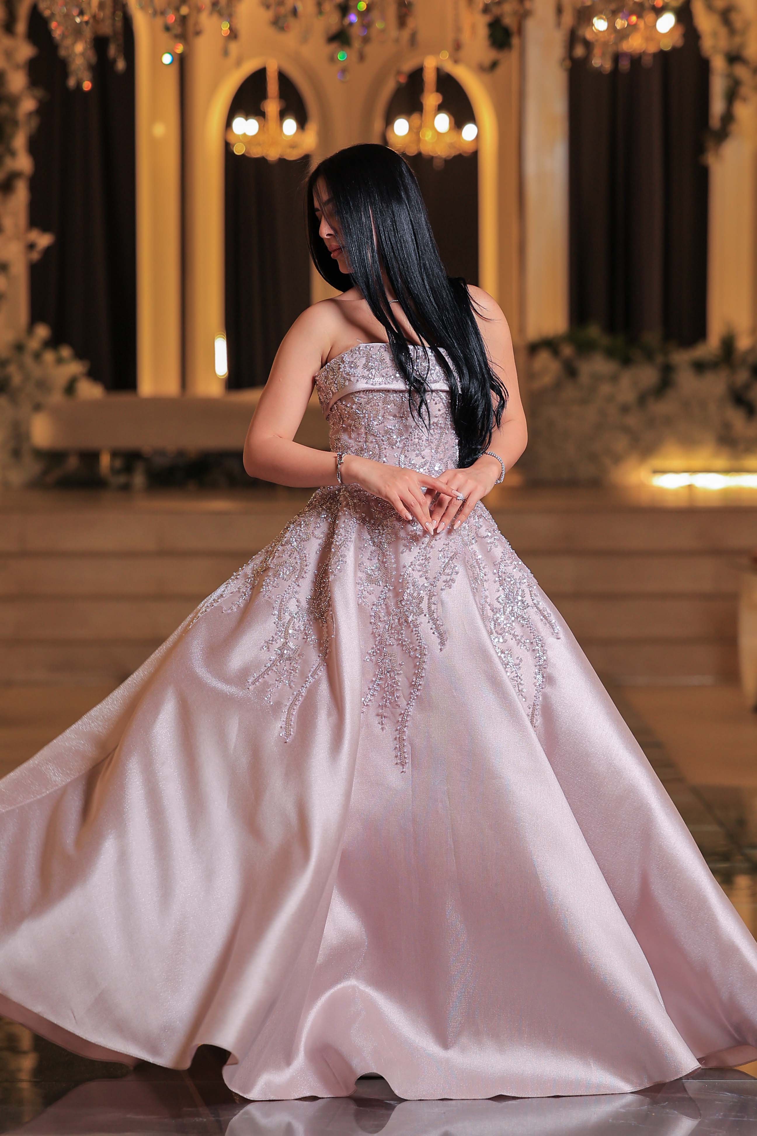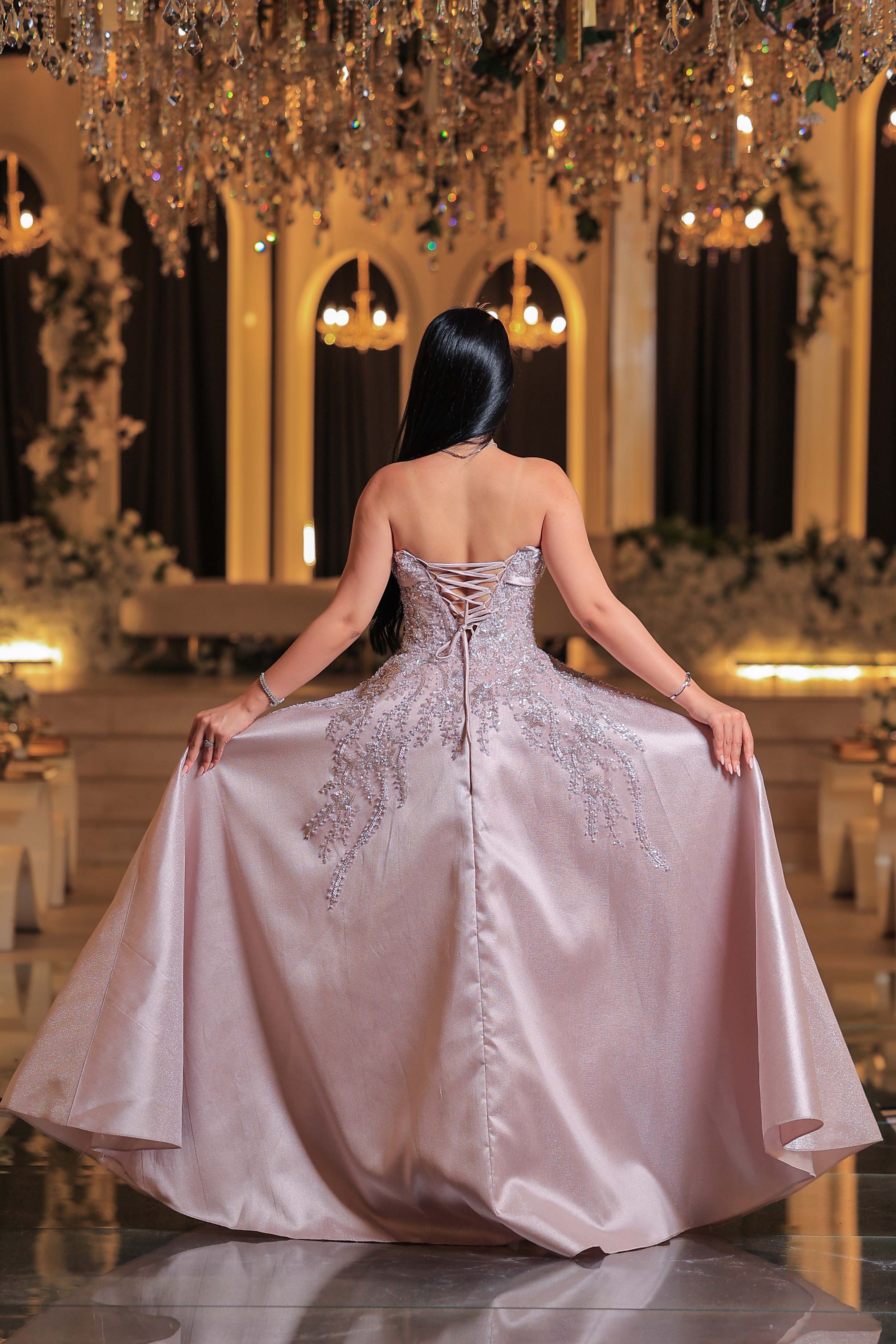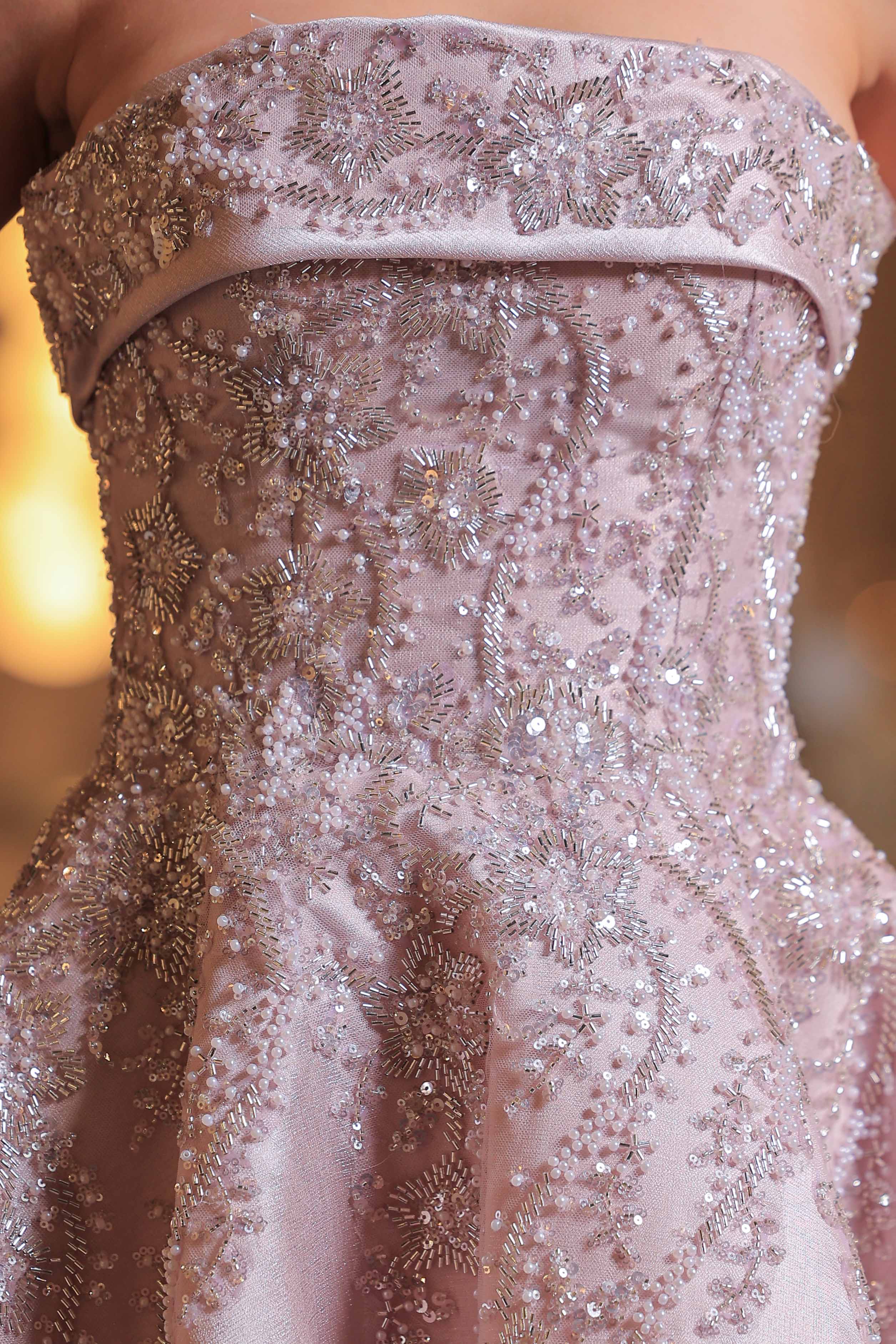 يأتي الفستان بقصة Ball Gown واسعة تمنح حضورًا راقياً، مع تطريز يدوي فاخر على منطقة الصدر والخصر بخيوط فضية لامعة تضفي لمسة من البريق الأنيق.