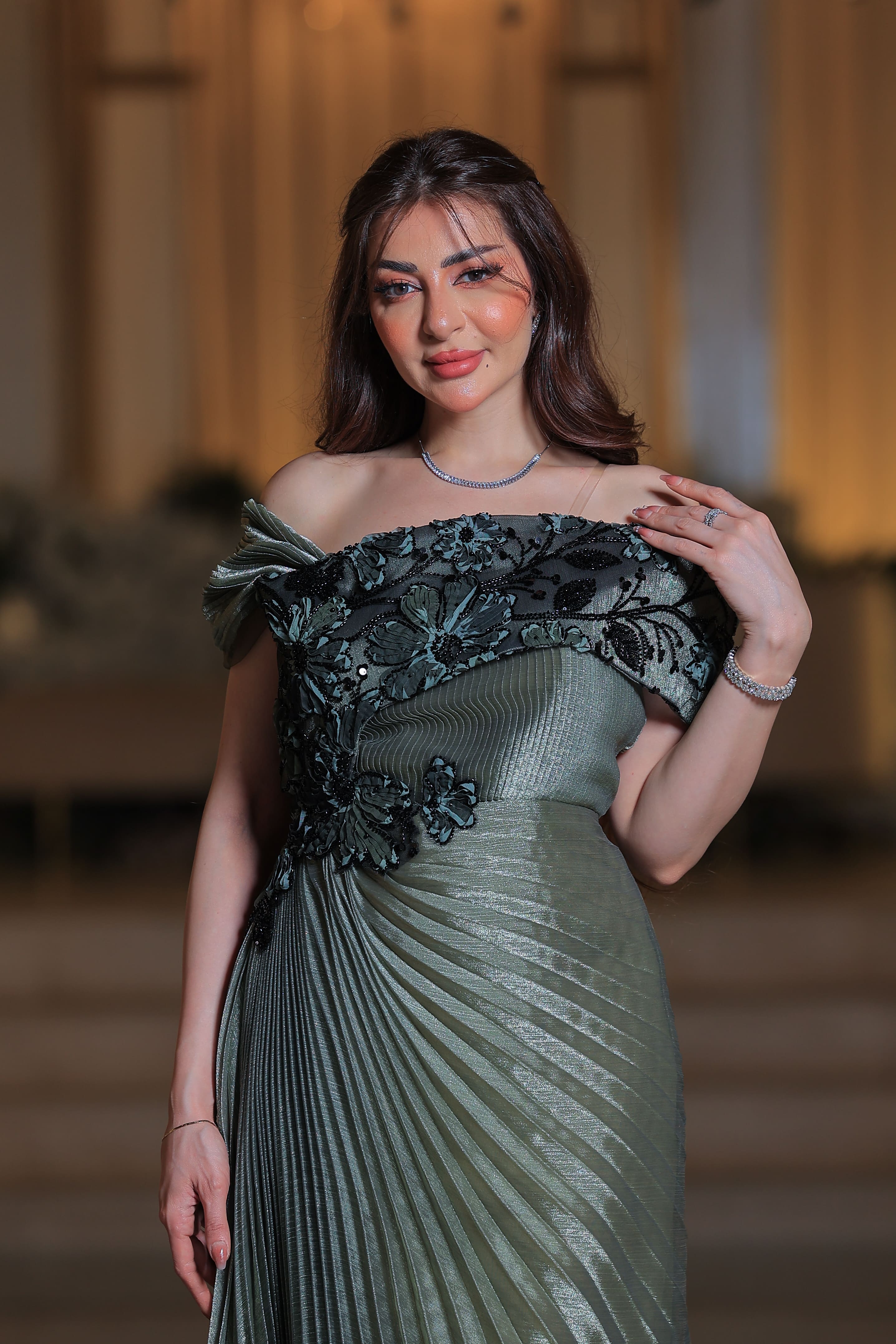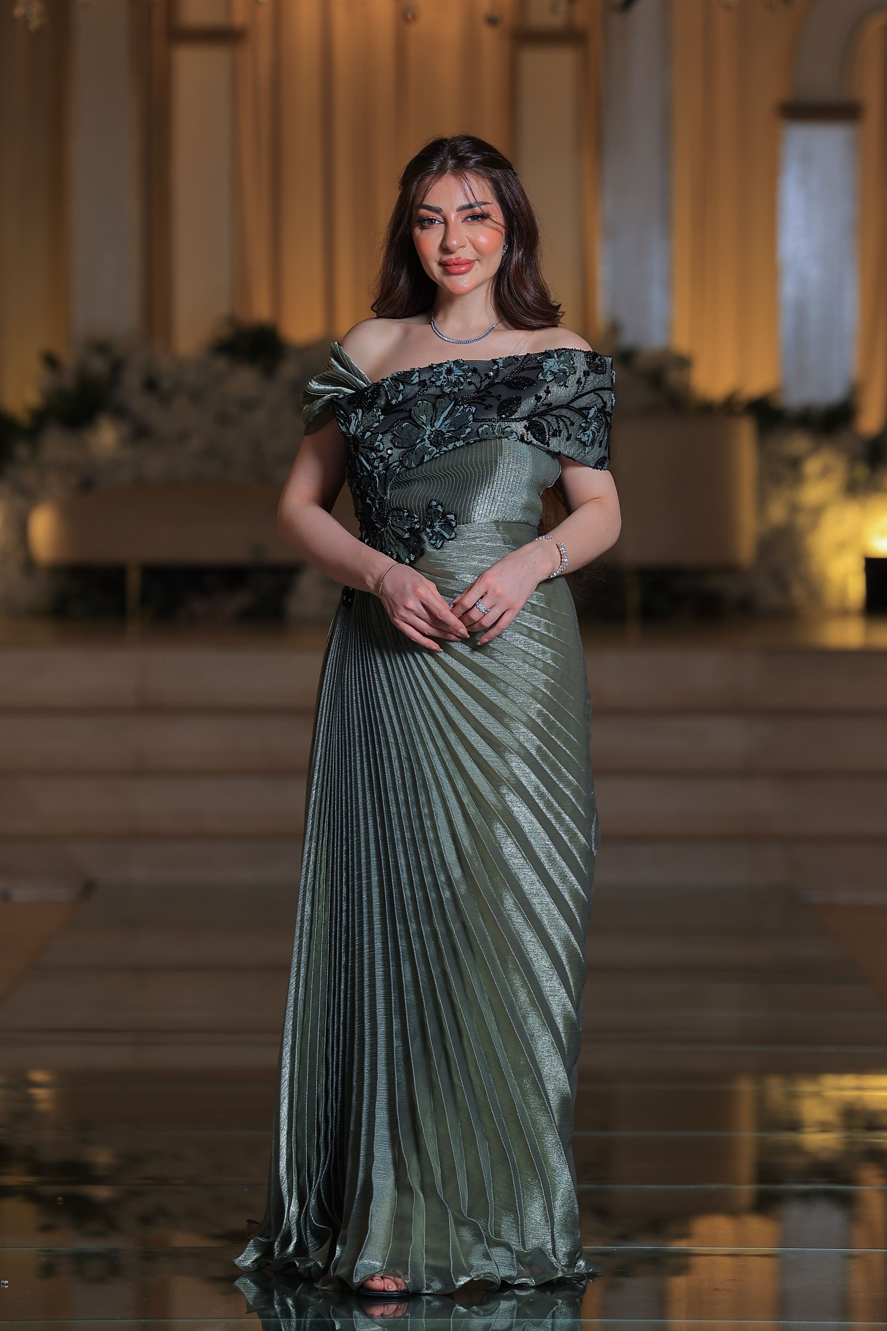 فستان سهرة فخم بلون أخضر معدني راقٍ، بتصميم أوف شولدر وتطريز يدوي أنيق على الصدر. الطيات اللامعة تضيف حركة ناعمة وانسيابية فخمة، لتمنحك إطلالة ملكية في كل مناسبة