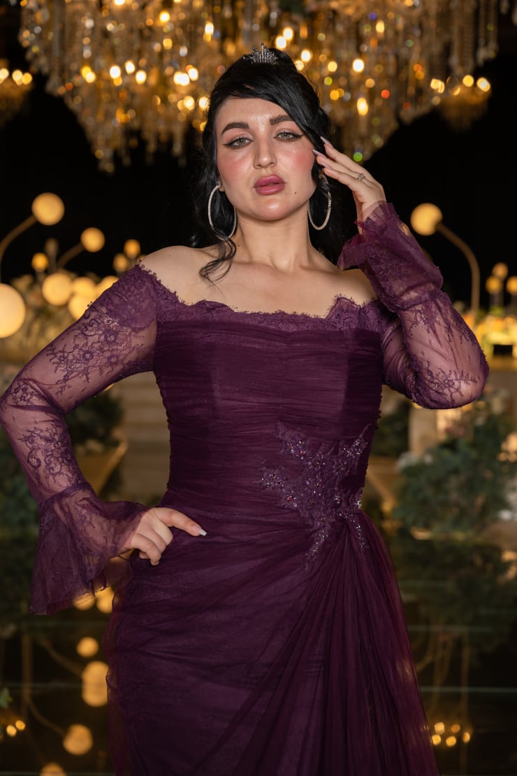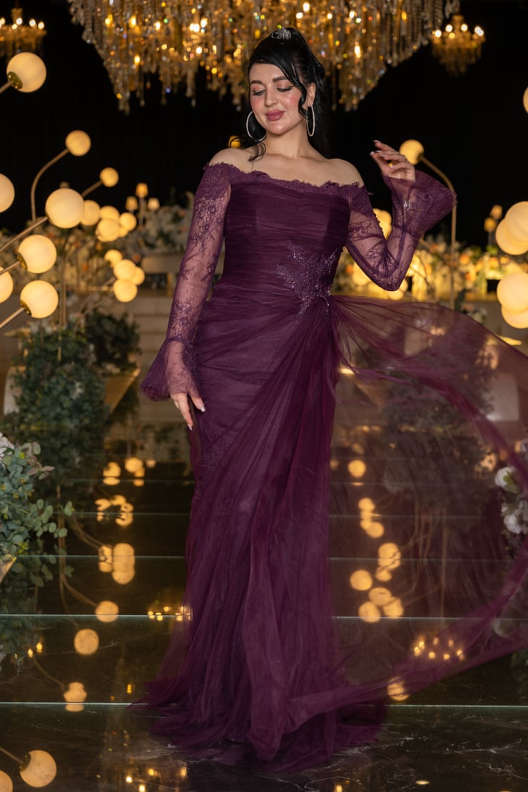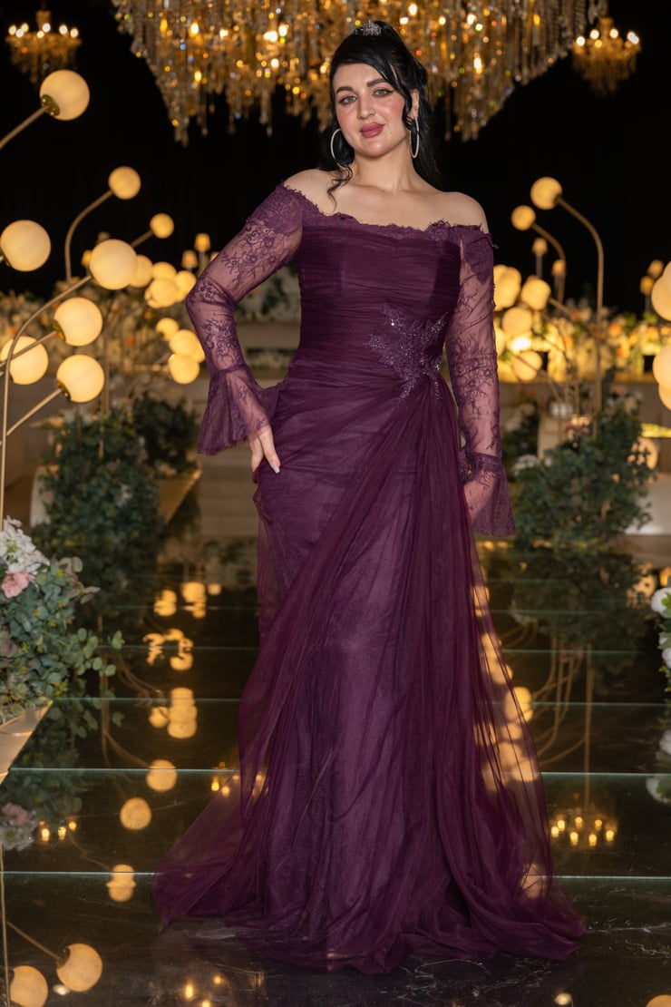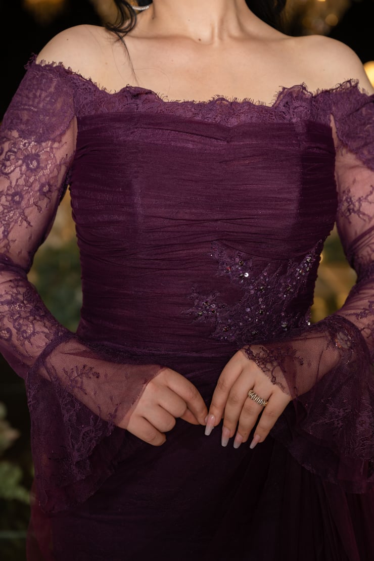 فستان سهرة فاخر بلون خمري عميق يتميز بتصميم أنيق من قماش التول الناعم والدانتيل الفاخر. الجزء العلوي مصمم بقصة كتف مكشوفة تضفي لمسة راقية وأنثوية، بينما الأكمام الطويلة المصنوعة من الدانتيل تضيف تفاصيل مميزة مليئة بالفخامة والرقي.
