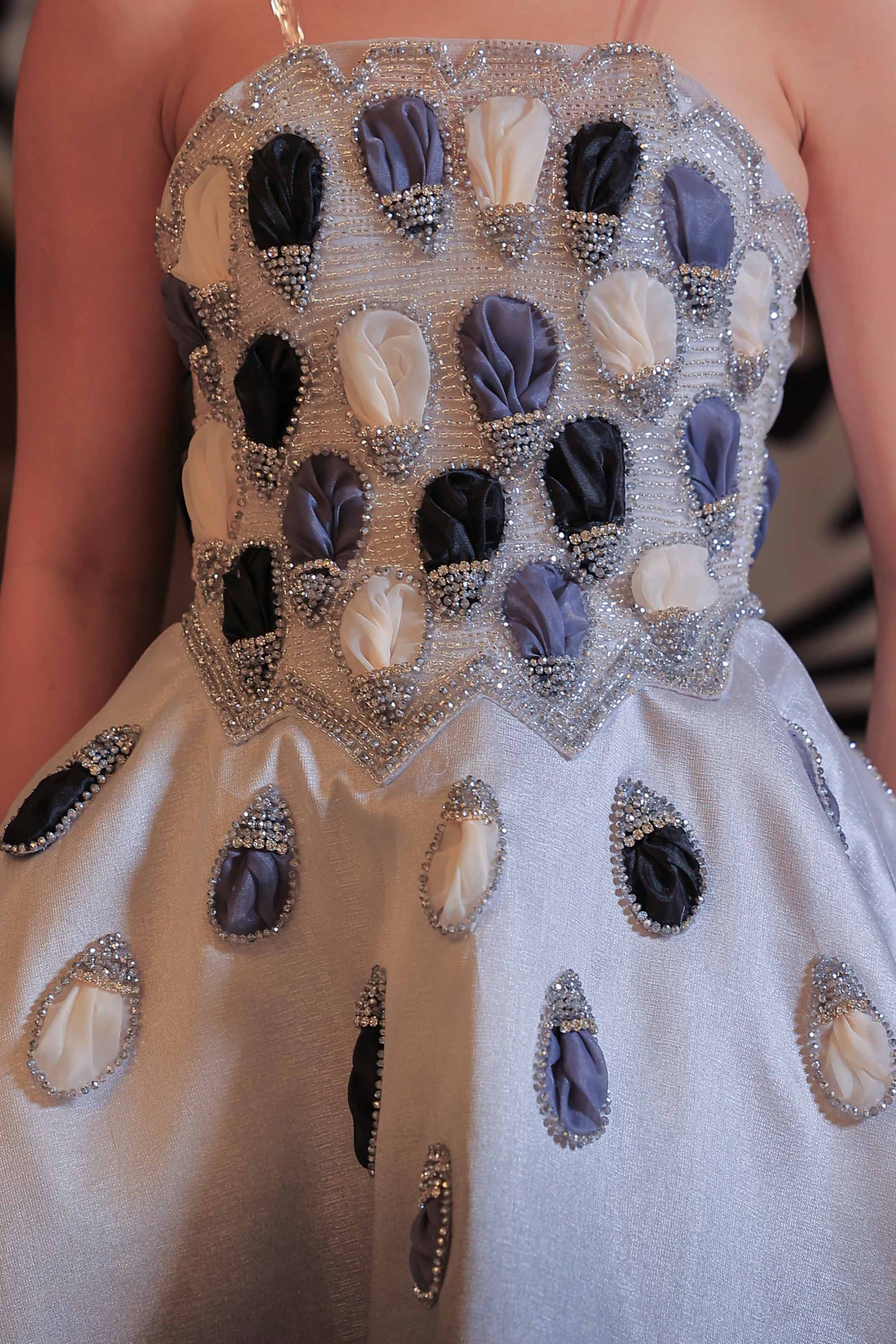 فستان سهرة رمادي بتدرج لوني وتطريز فاخر
