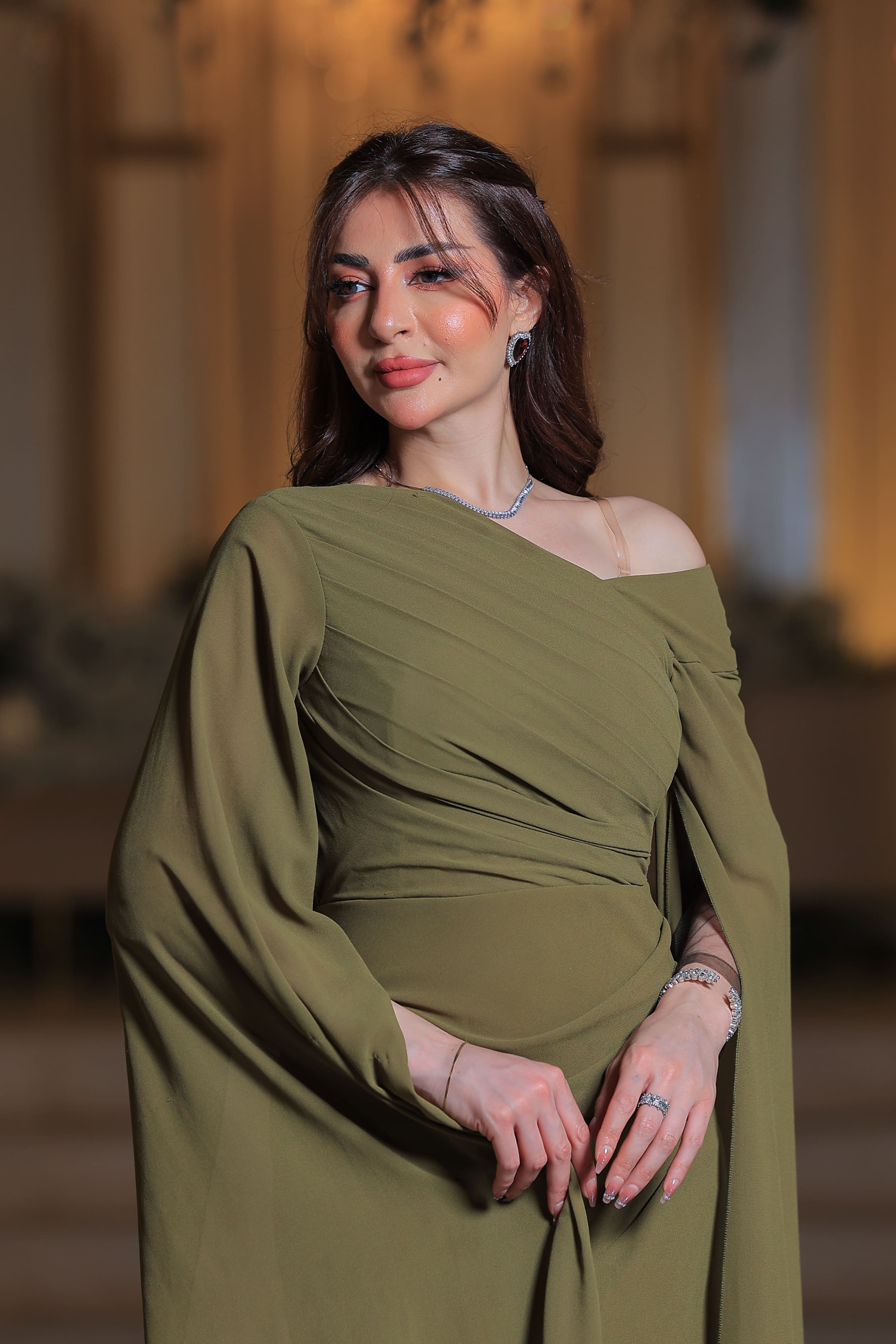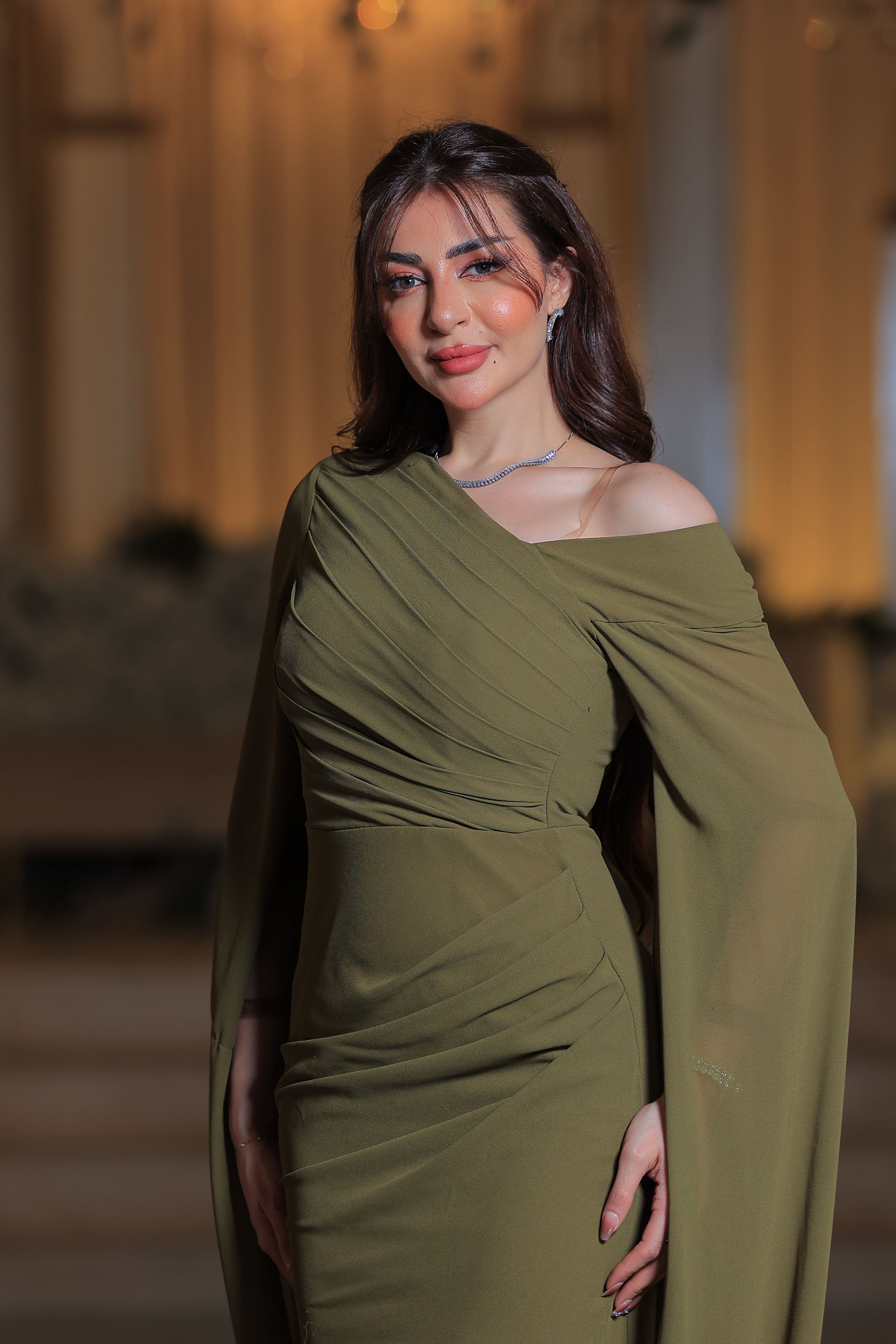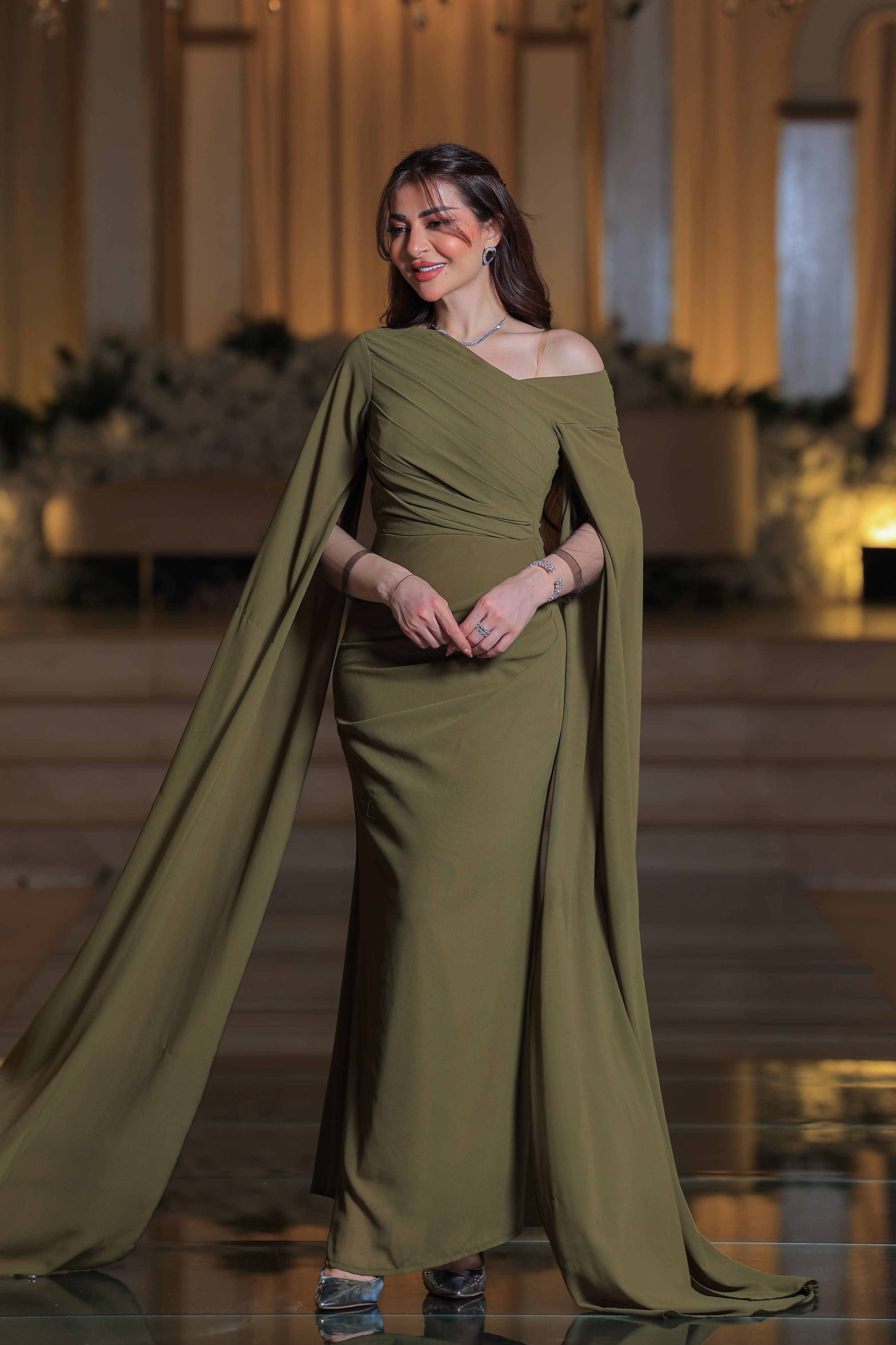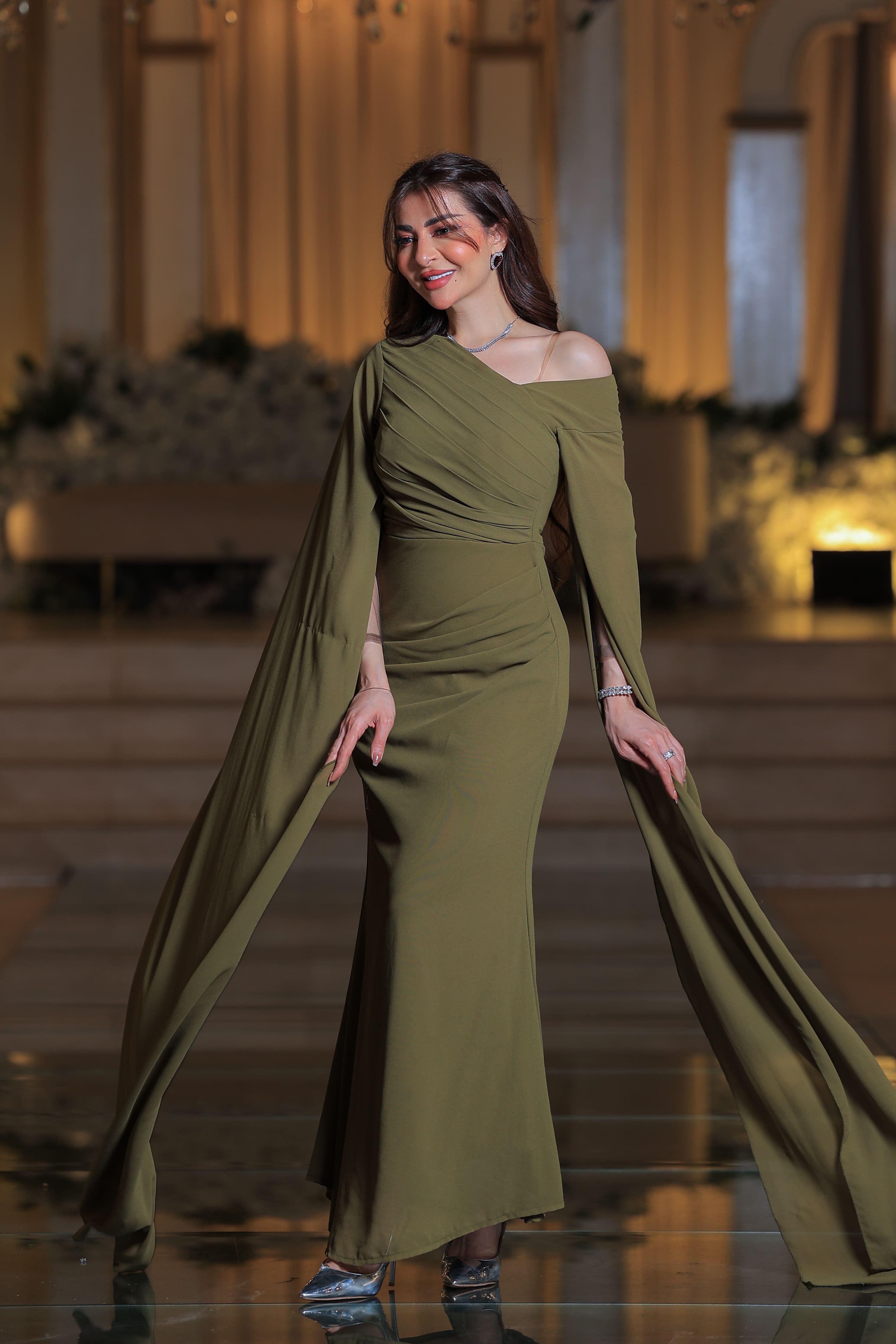 فستان سهرة زيتوني بتصميم أنيق وأكمام كاب من Loraتميّزي بإطلالة فخمة وأنيقة مع هذا الفستان الزيتوني من Lora الذي يجمع بين النعومة والجرأة في تصميم واحد مذهل.