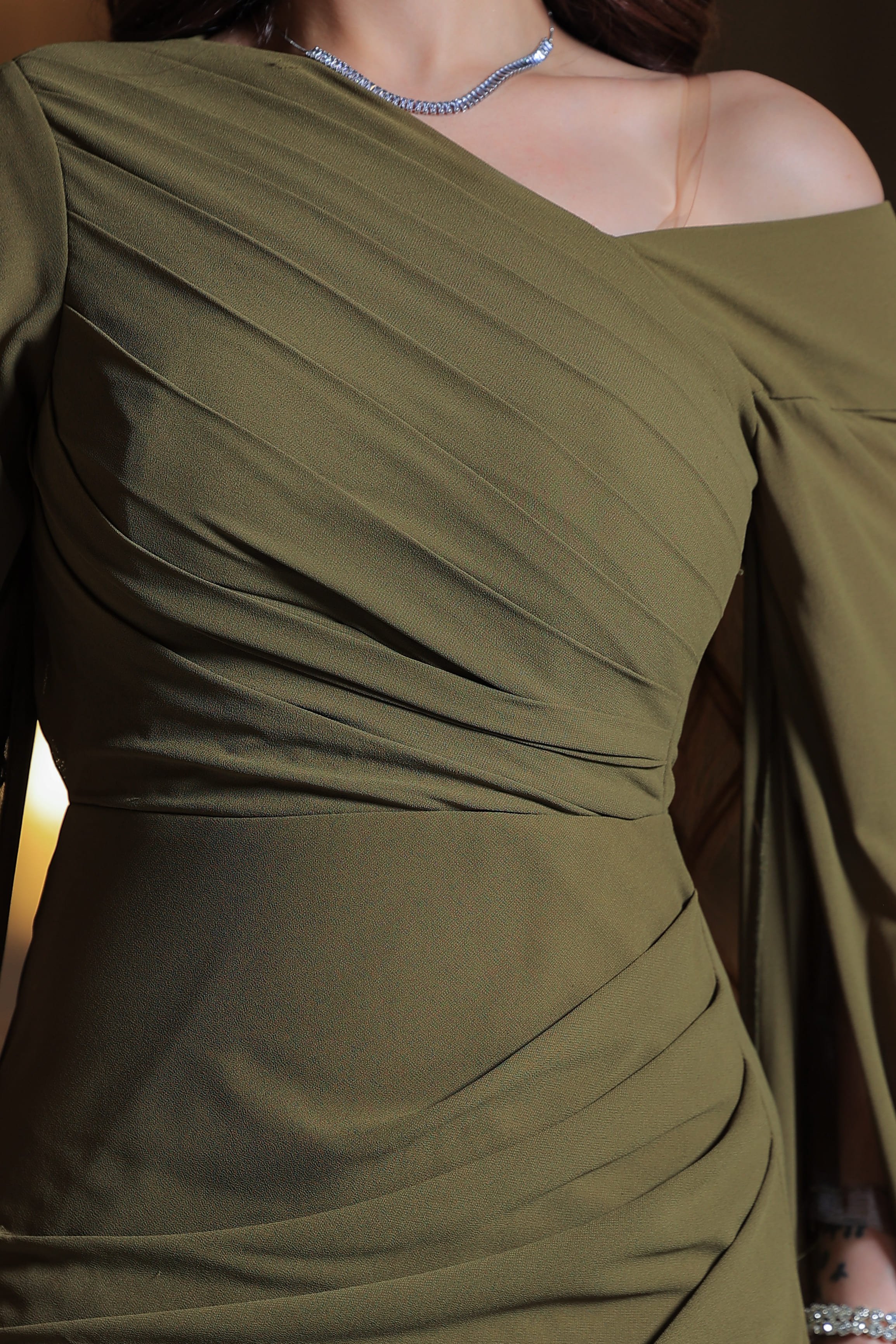 الجزء العلوي مصمم بطيات ناعمة من القماش (Draped Design) تبرز القوام برقة وانسيابية، فيما تأتي القصة الضيقة لتمنح مظهراً أنثوياً أنيقاً يعكس الرقي والثقة.