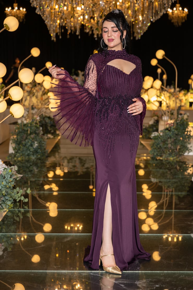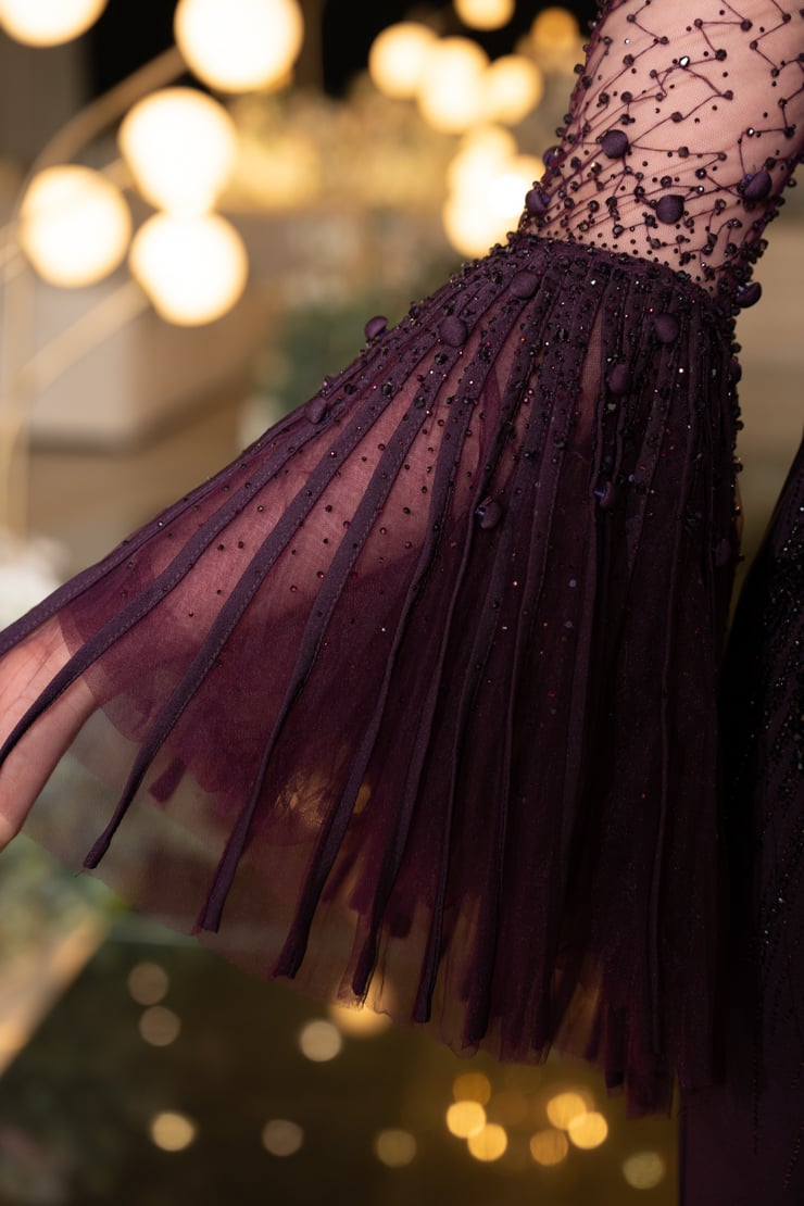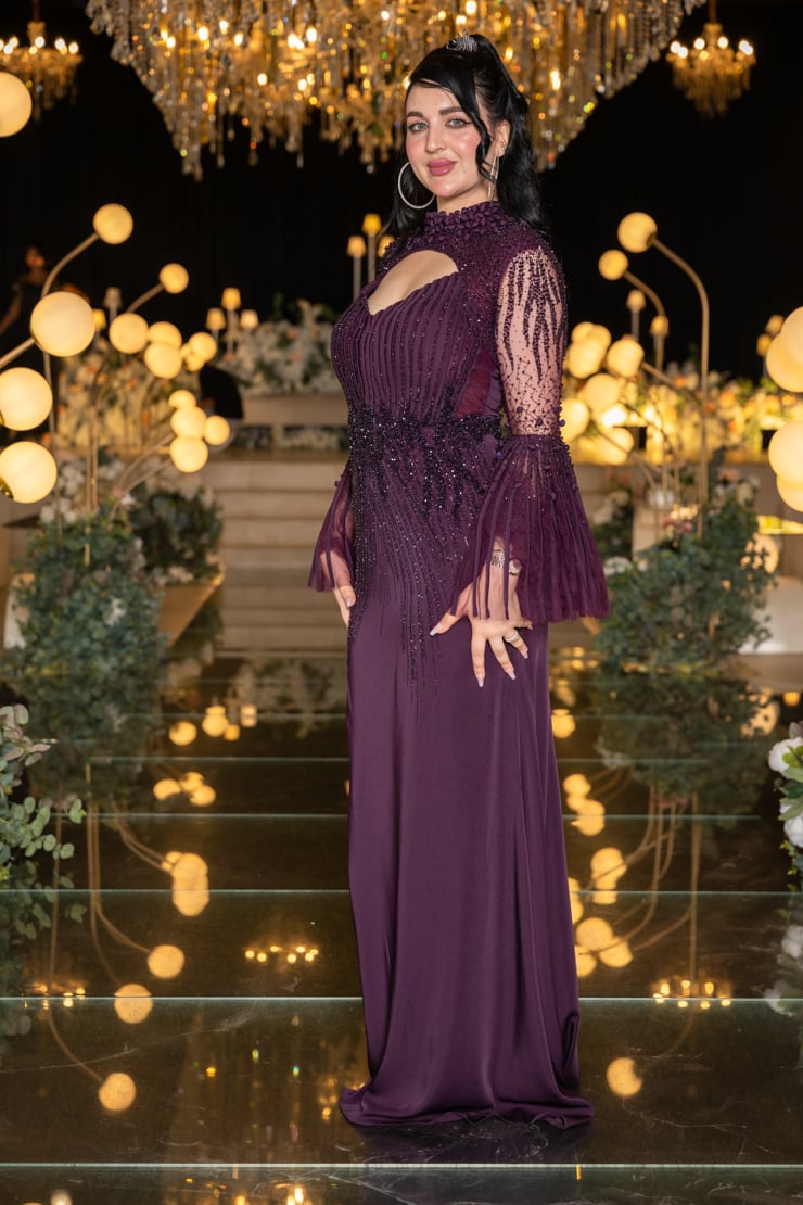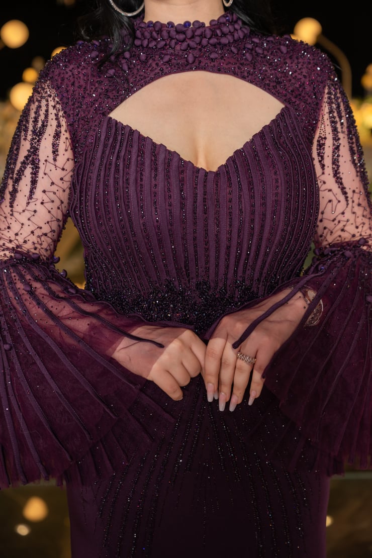 يتميز الفستان بقصة أنيقة تحدد الخصر وتطريز فاخر مرصع بأحجار لامعة تضفي لمسة من البريق على الإطلالة. الجزء العلوي يأتي بتصميم راقٍ مع فتحة صدر ناعمة تضيف لمسة من الجرأة الراقية، بينما الأكمام الشفافة الواسعة بتفاصيل مطرزة تضفي حركة جذابة وأنوثة راقية.