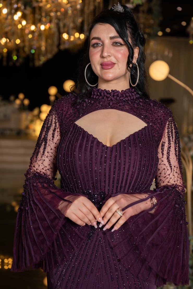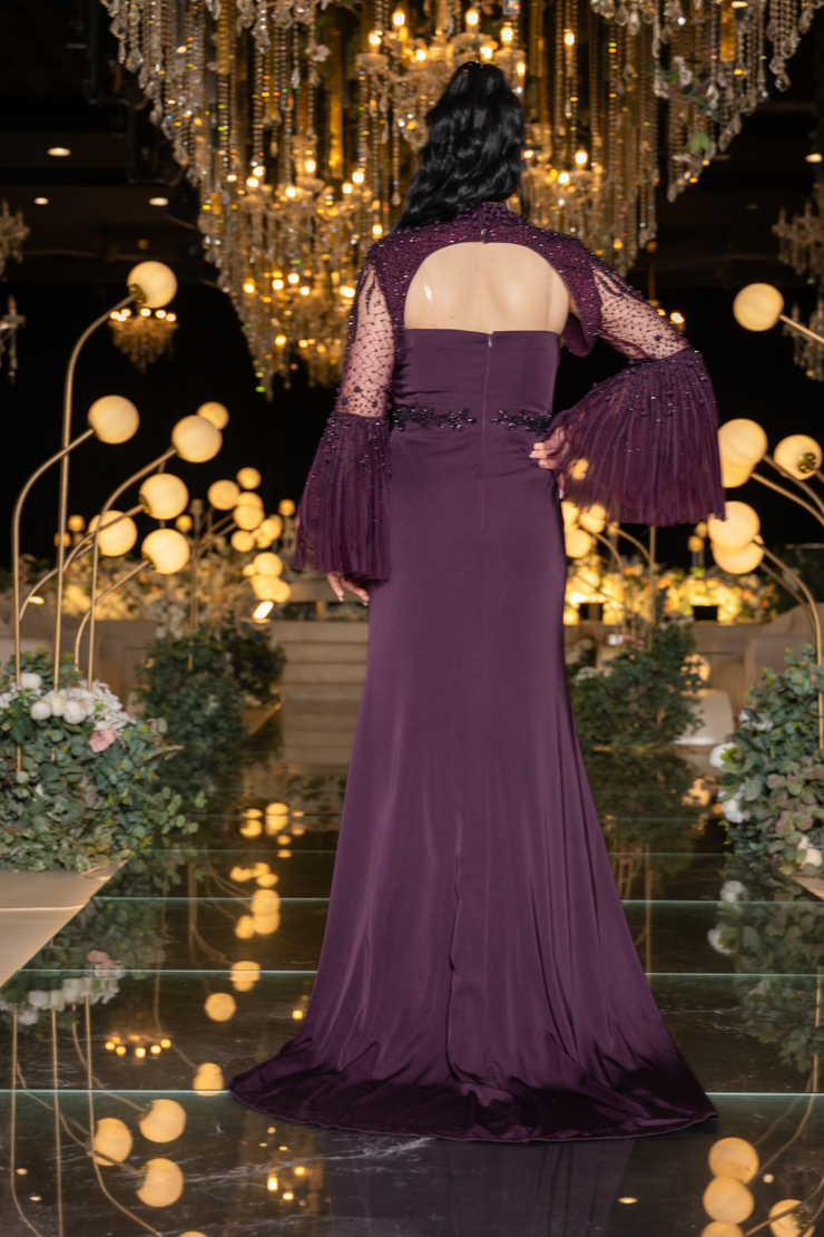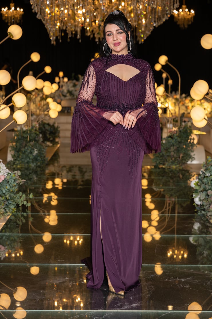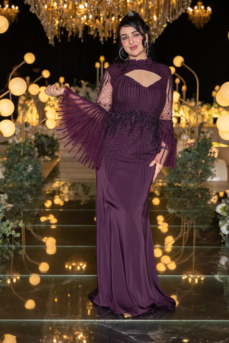 يتميز الفستان بقصة أنيقة تحدد الخصر وتطريز فاخر مرصع بأحجار لامعة تضفي لمسة من البريق على الإطلالة. الجزء العلوي يأتي بتصميم راقٍ مع فتحة صدر ناعمة تضيف لمسة من الجرأة الراقية، بينما الأكمام الشفافة الواسعة بتفاصيل مطرزة تضفي حركة جذابة وأنوثة راقية.