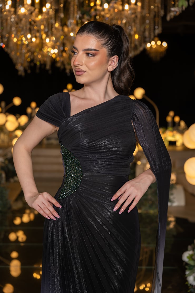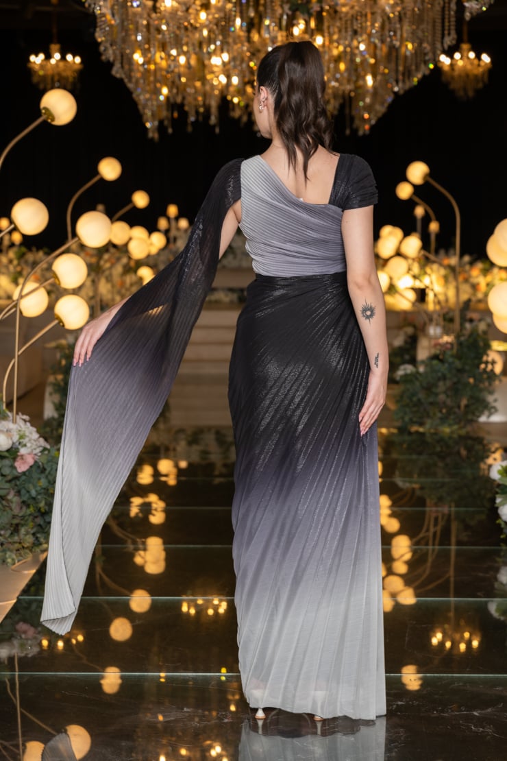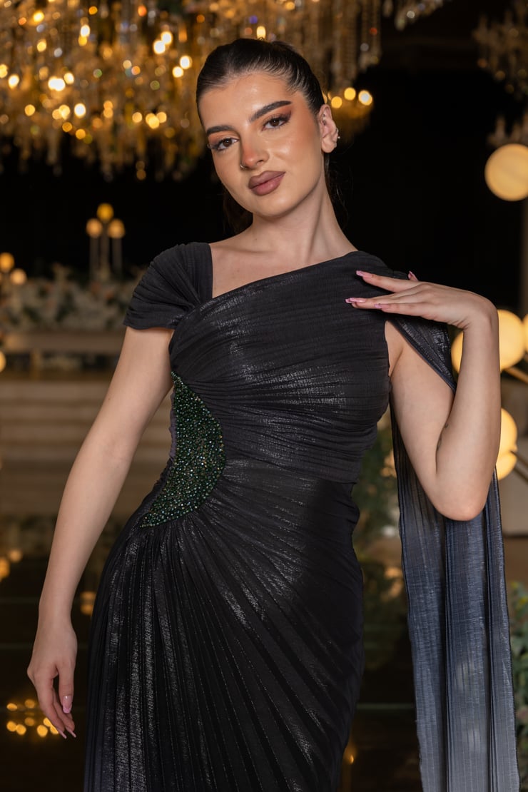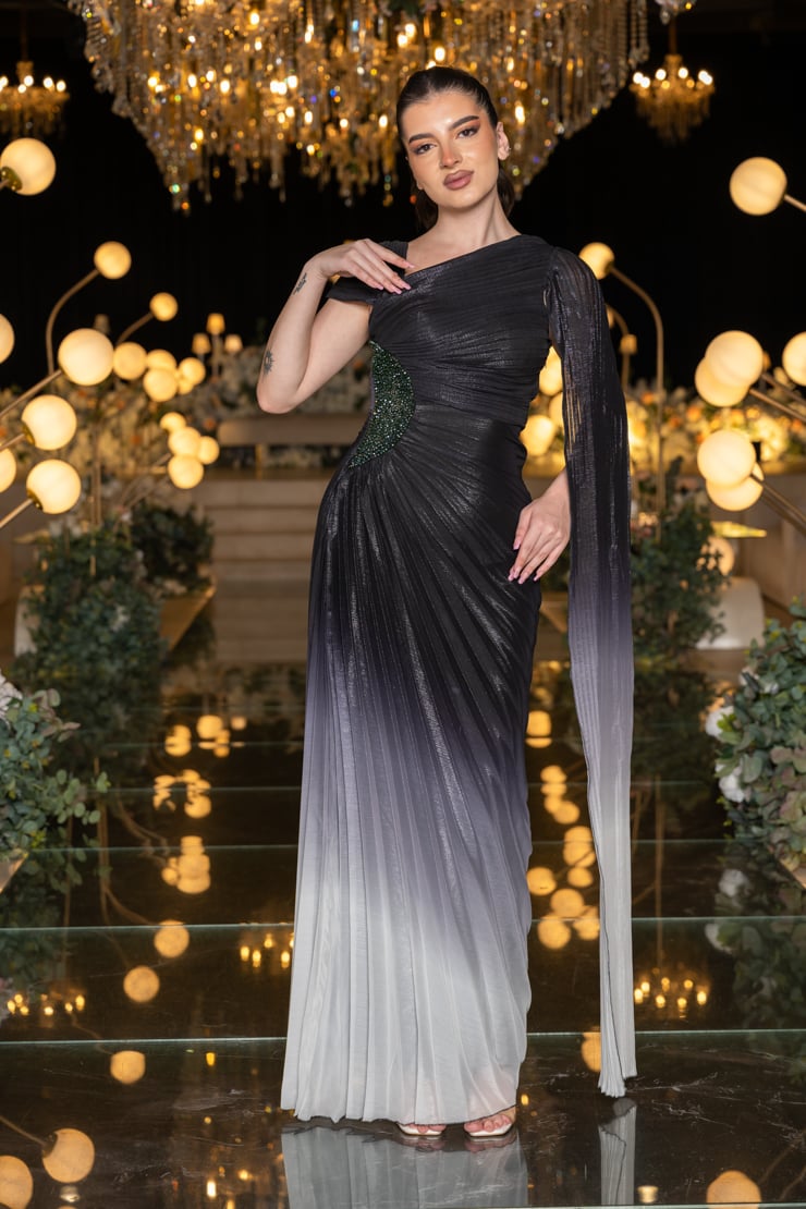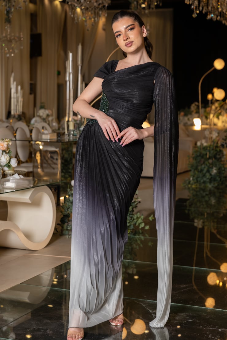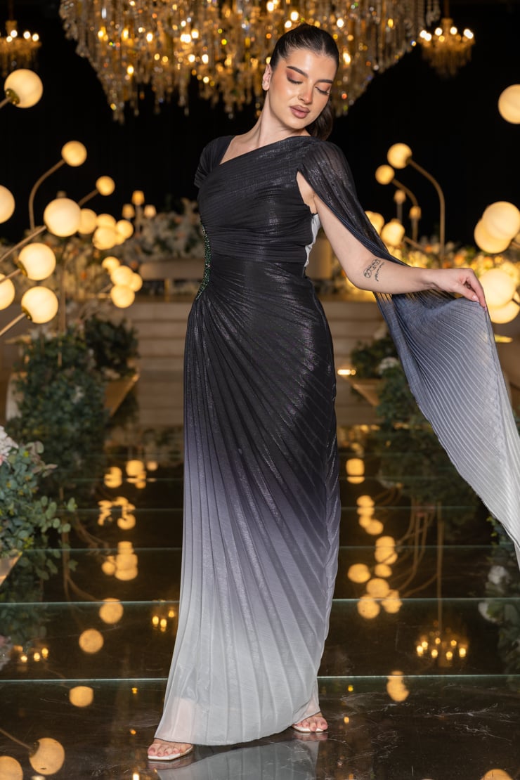 يأتي هذا الفستان بقماش مميز بخيوط لامعة تتدرج ألوانه بسلاسة من الأسود الفخم إلى الرمادي الفاتح في الأسفل، ما يمنح الإطلالة عمقًا بصريًا راقيًا. التصميم يعتمد على كسرات دقيقة تضفي حركة جميلة وانسيابية أثناء المشي.