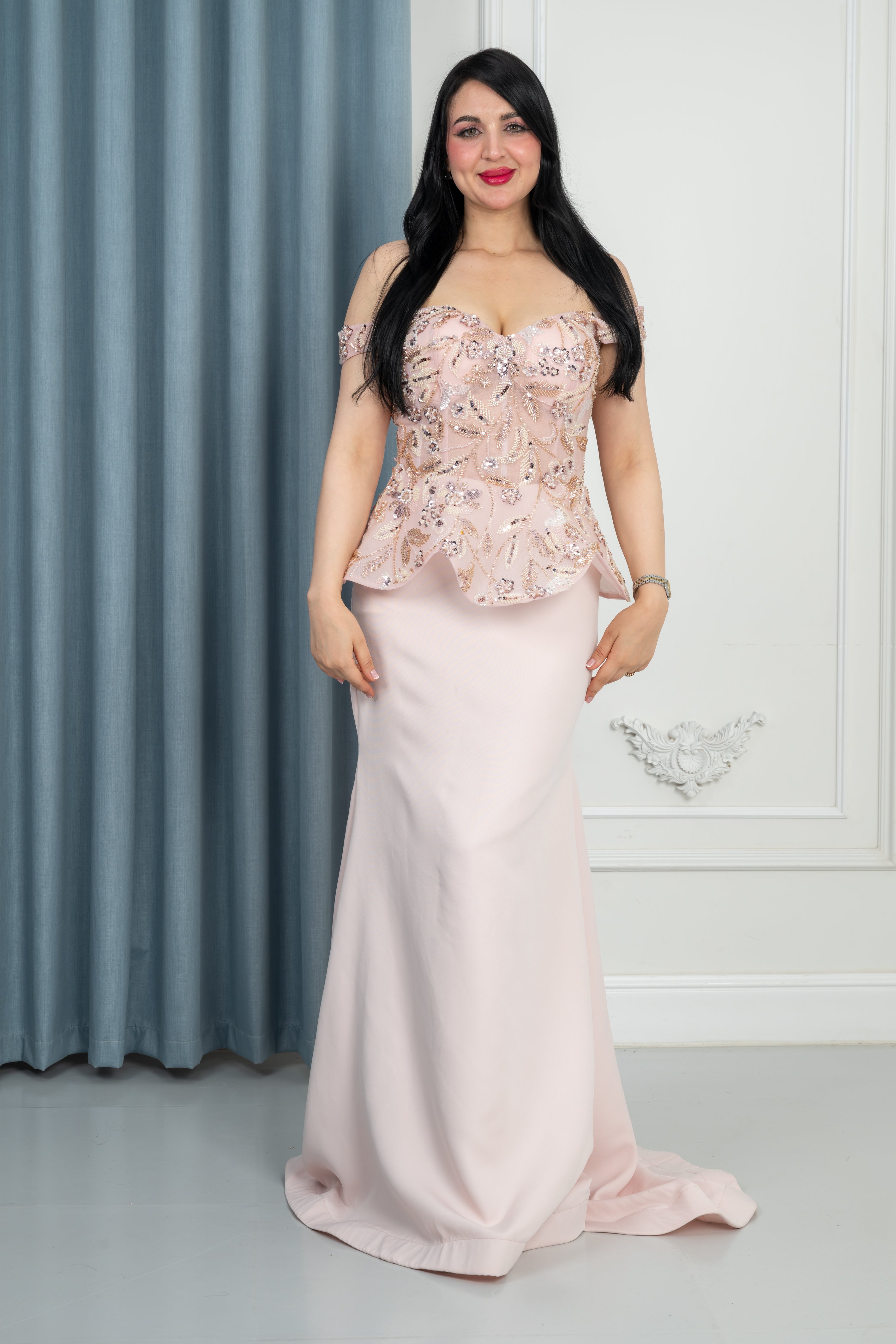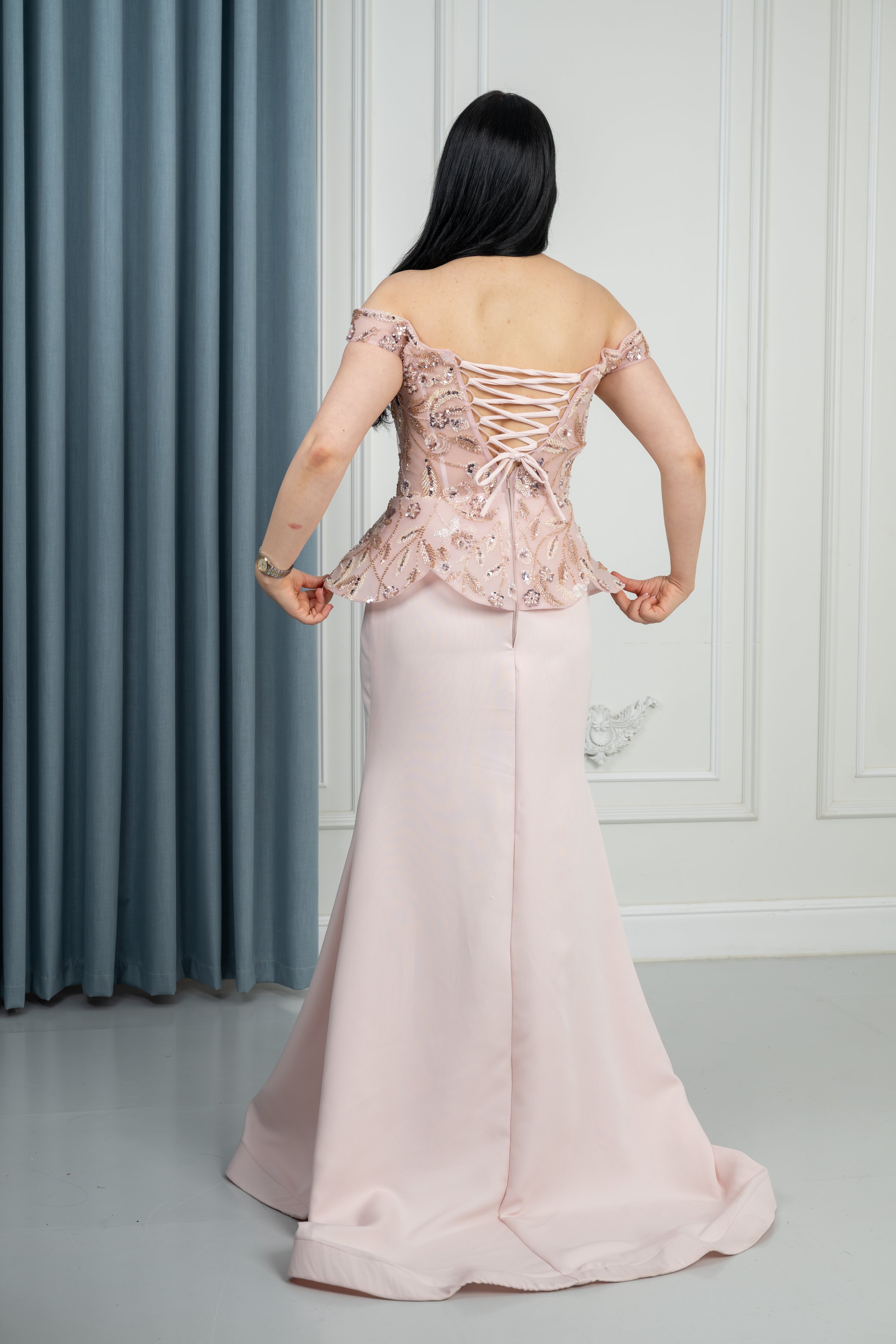 يأتي الفستان بلون وردي فاتح أنثوي ناعم يعكس الأناقة الكلاسيكية، بتصميم أكتاف ساقطة (Off Shoulder) يبرز الكتفين والرقبة بأسلوب جذاب وراقٍ.