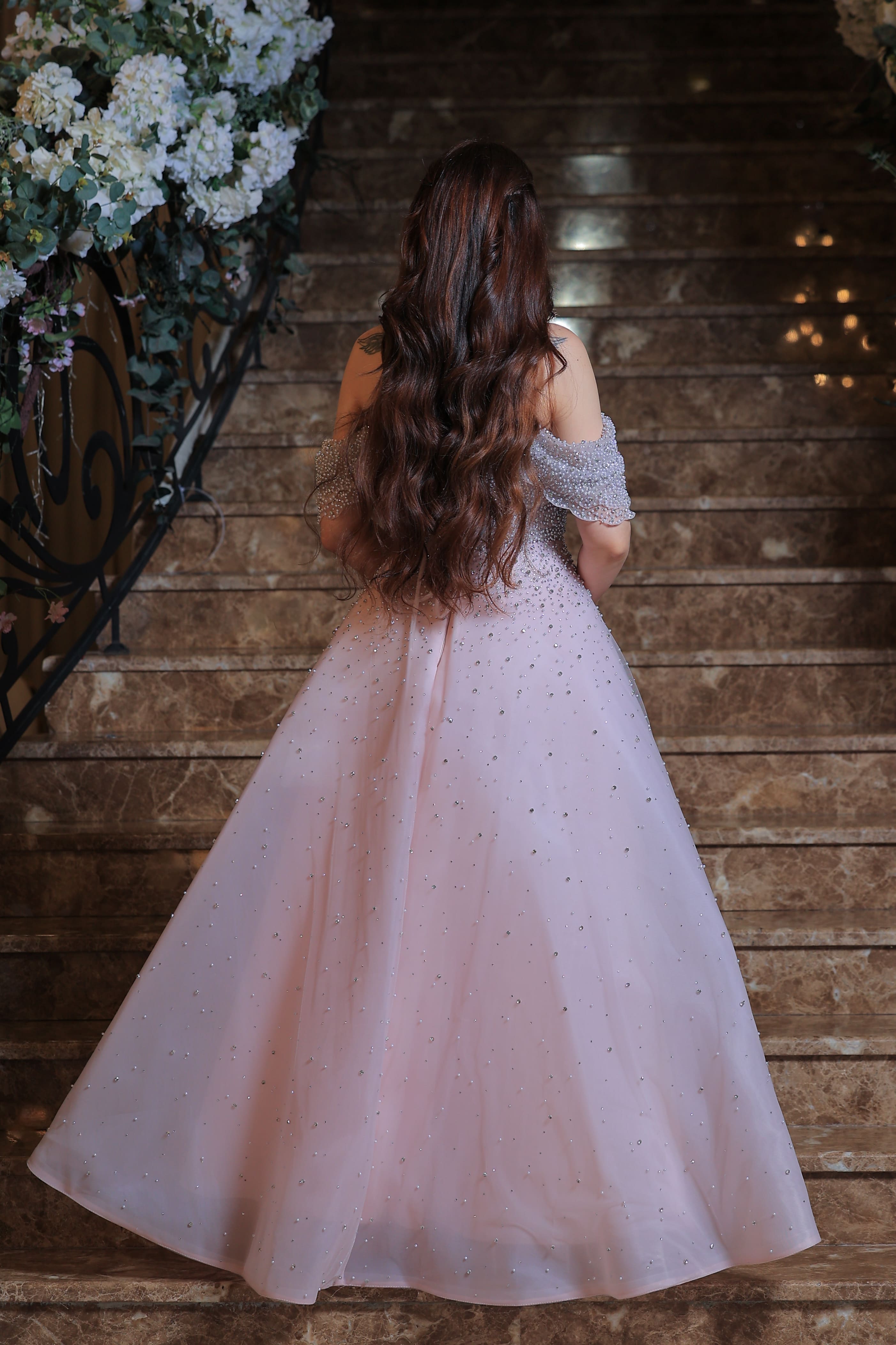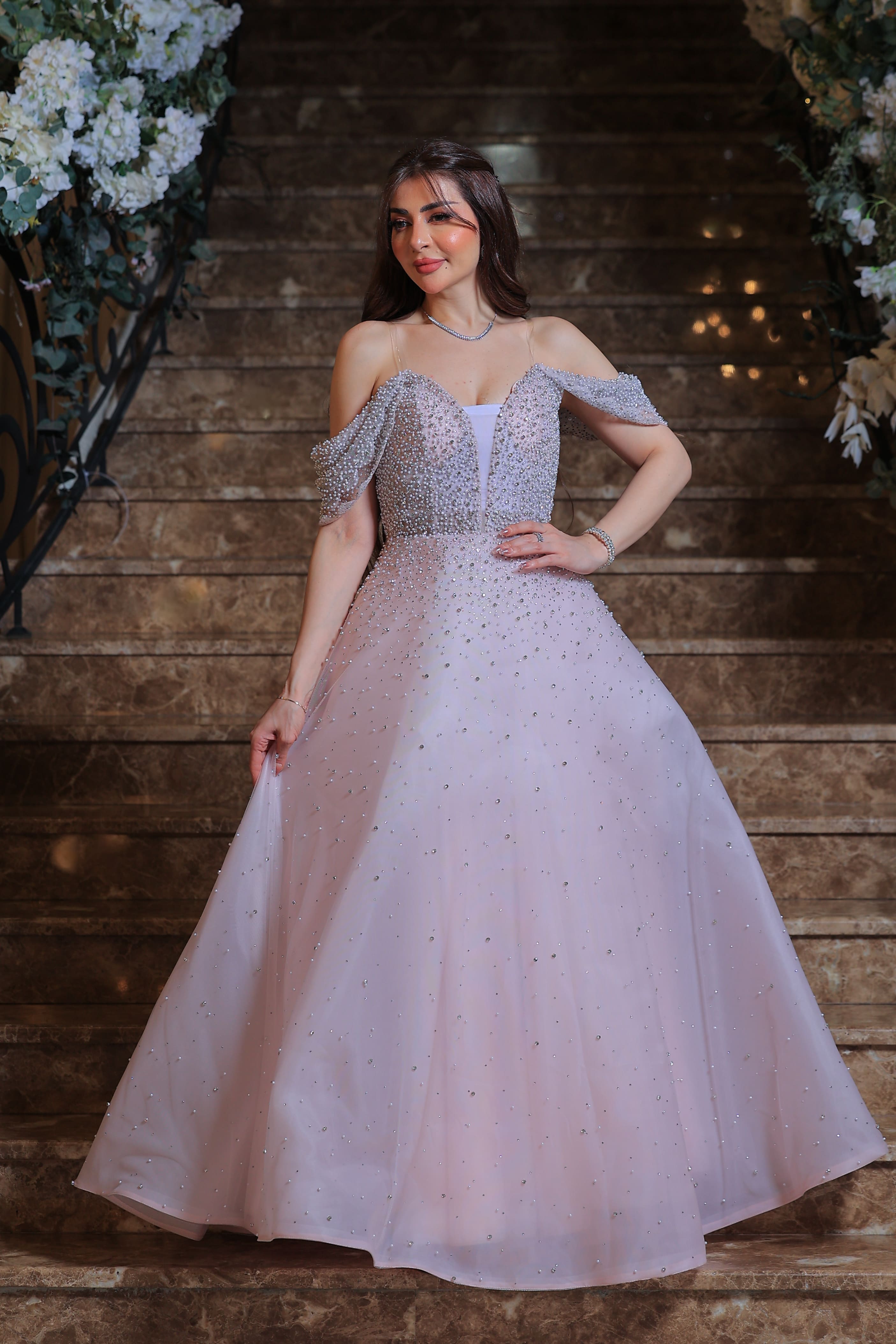 فستان سهرة وردي فاتح مكشوف الأكتاف ومطرز بالكريستال