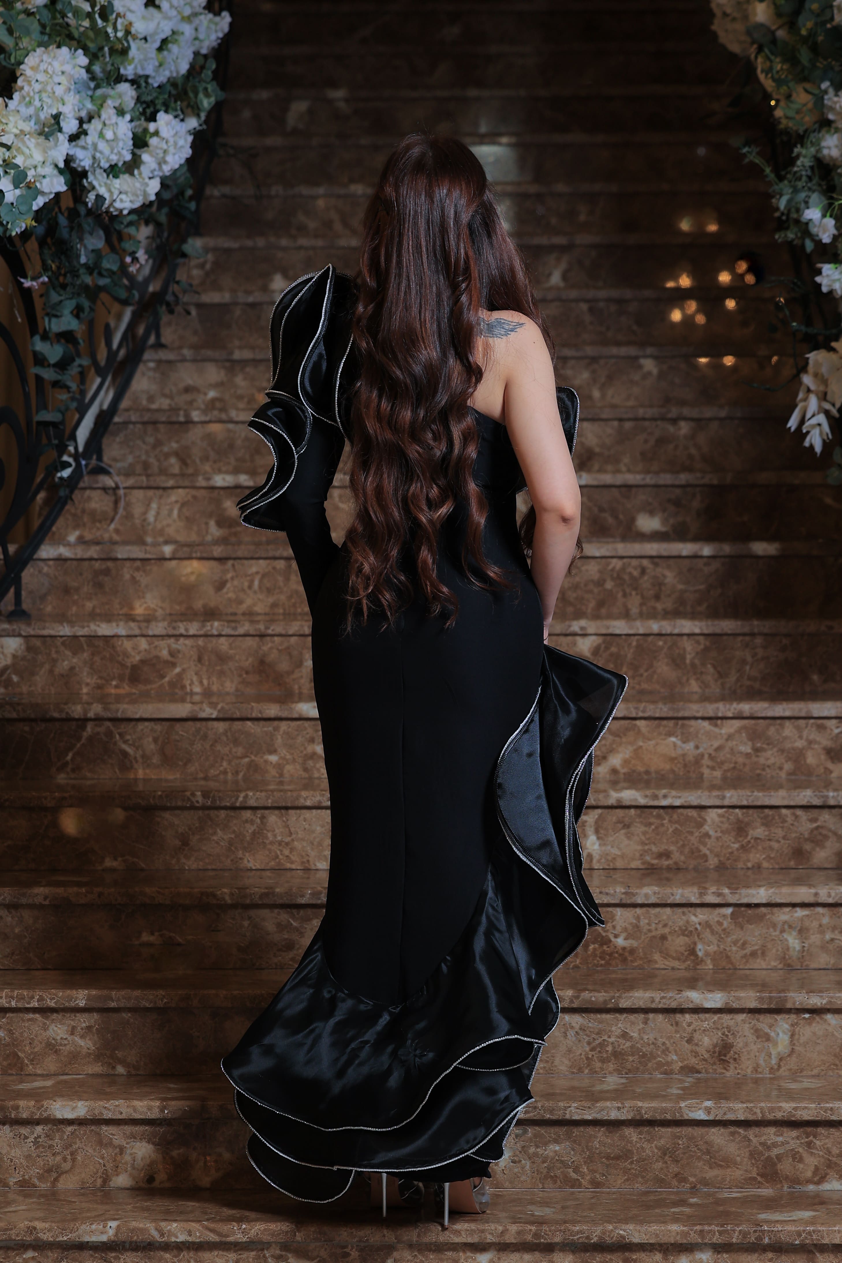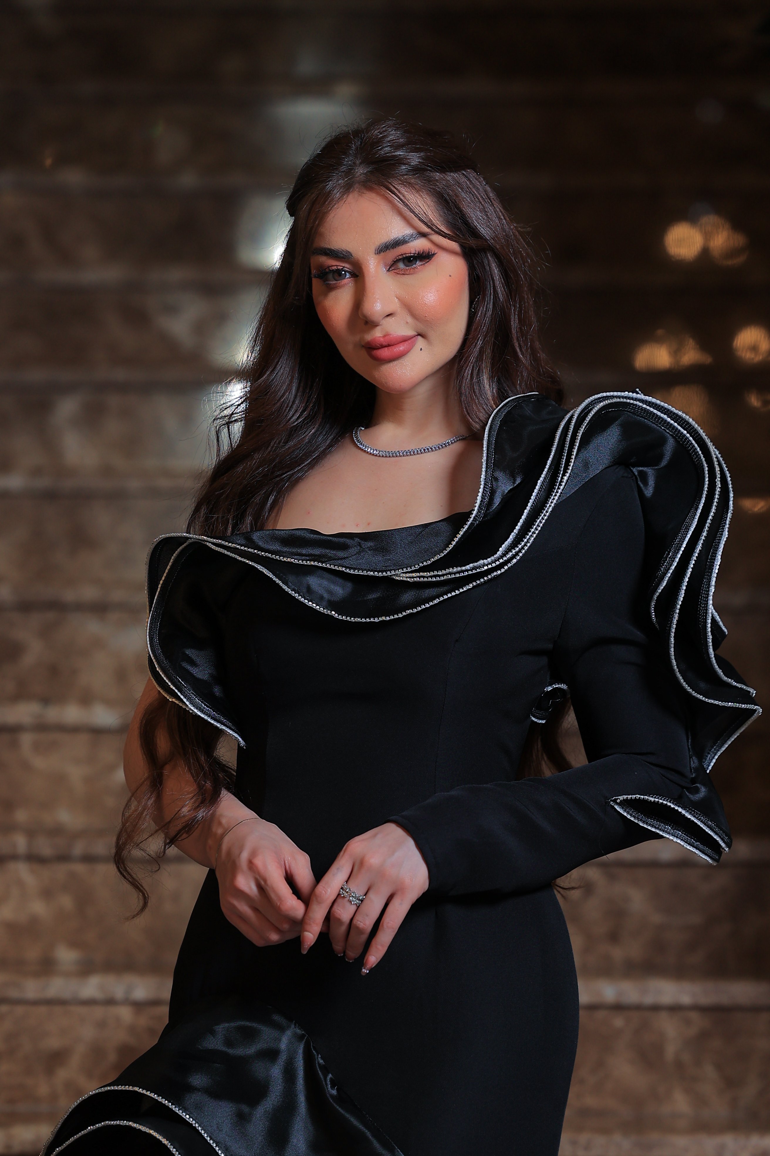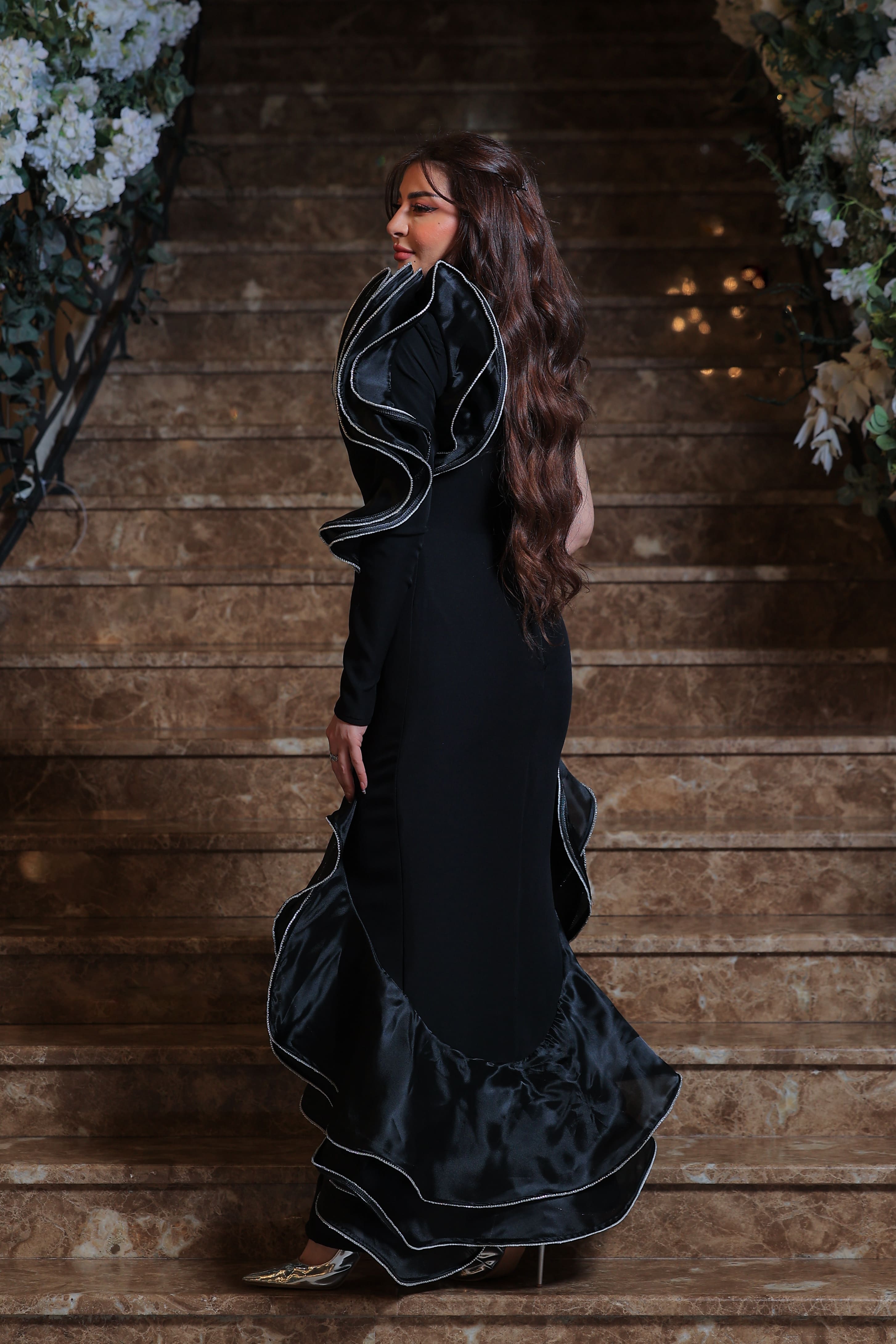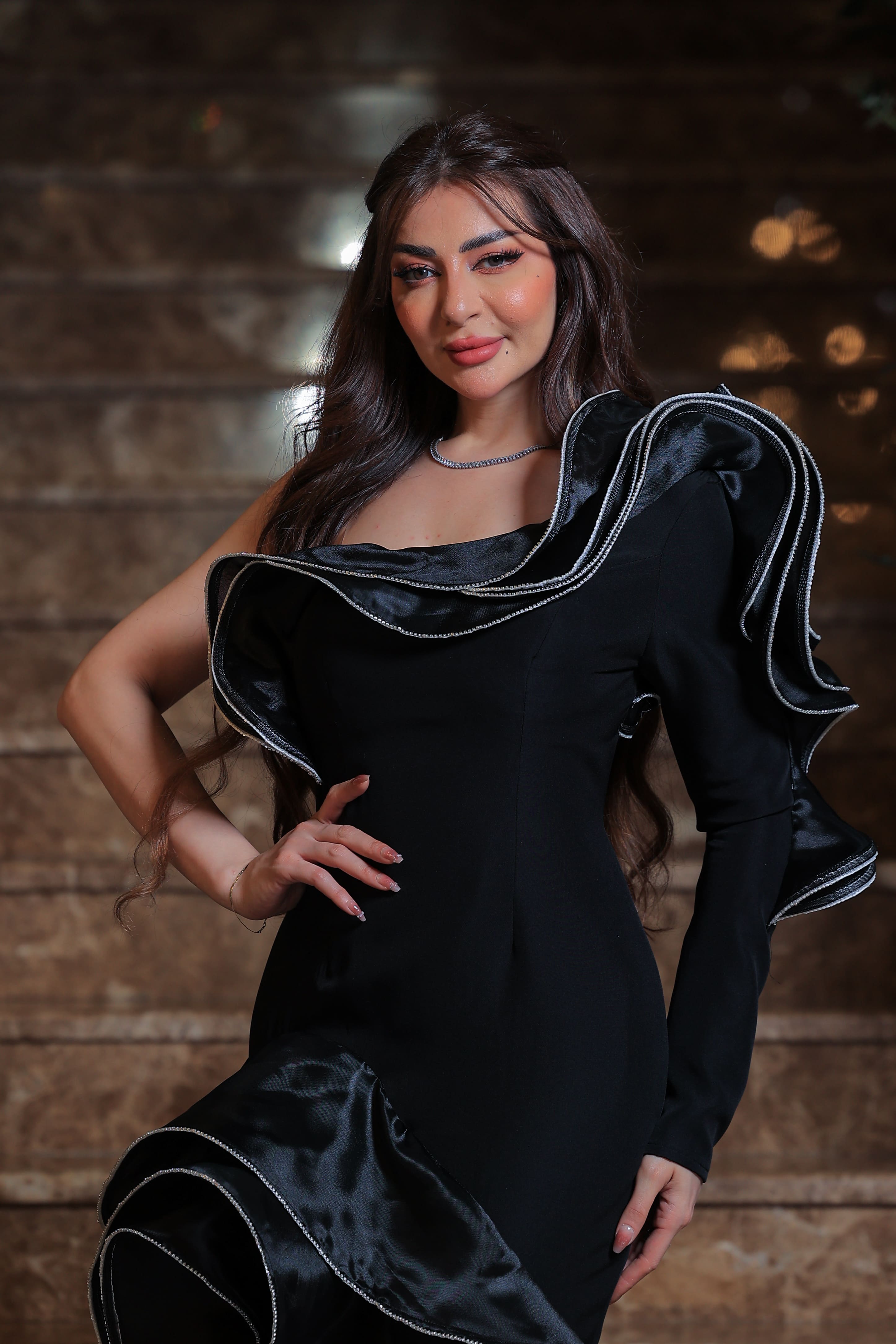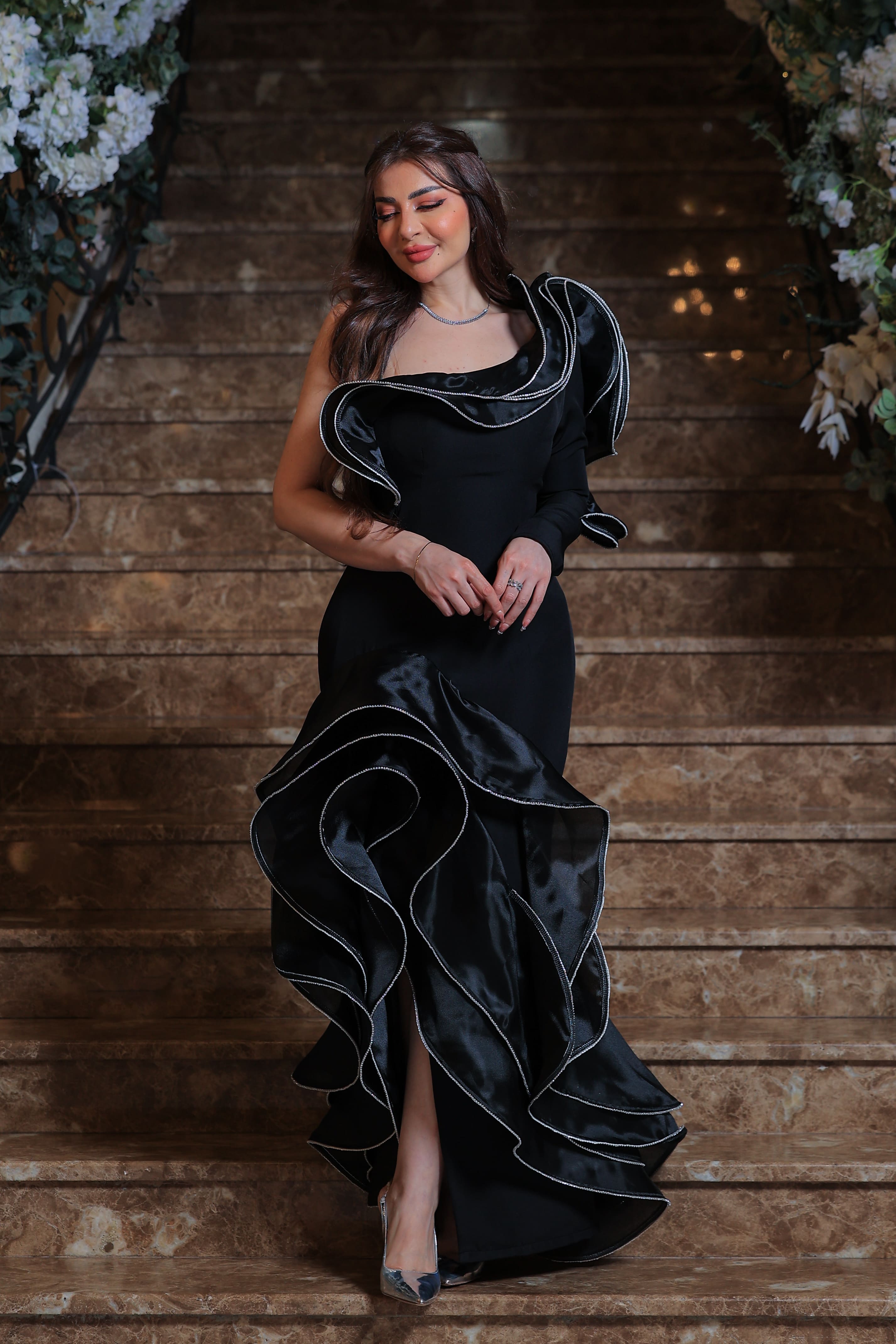 فستان سهرة أسود أنيق بتصميم عصري يبرز أنوثتك ويمنحك حضوراً فخماً في كل مناسبة. يتميز هذا الفستان بتصميم فريد يجمع بين البساطة في القصة والجرأة في التفاصيل، حيث يأتي من قماش أسود فاخر مطفي الملمس مع كشكشات بارزة من الساتان اللامع تمتد حول الأكتاف والصدر وتنحدر إلى الأسفل بطريقة انسيابية جذابة.