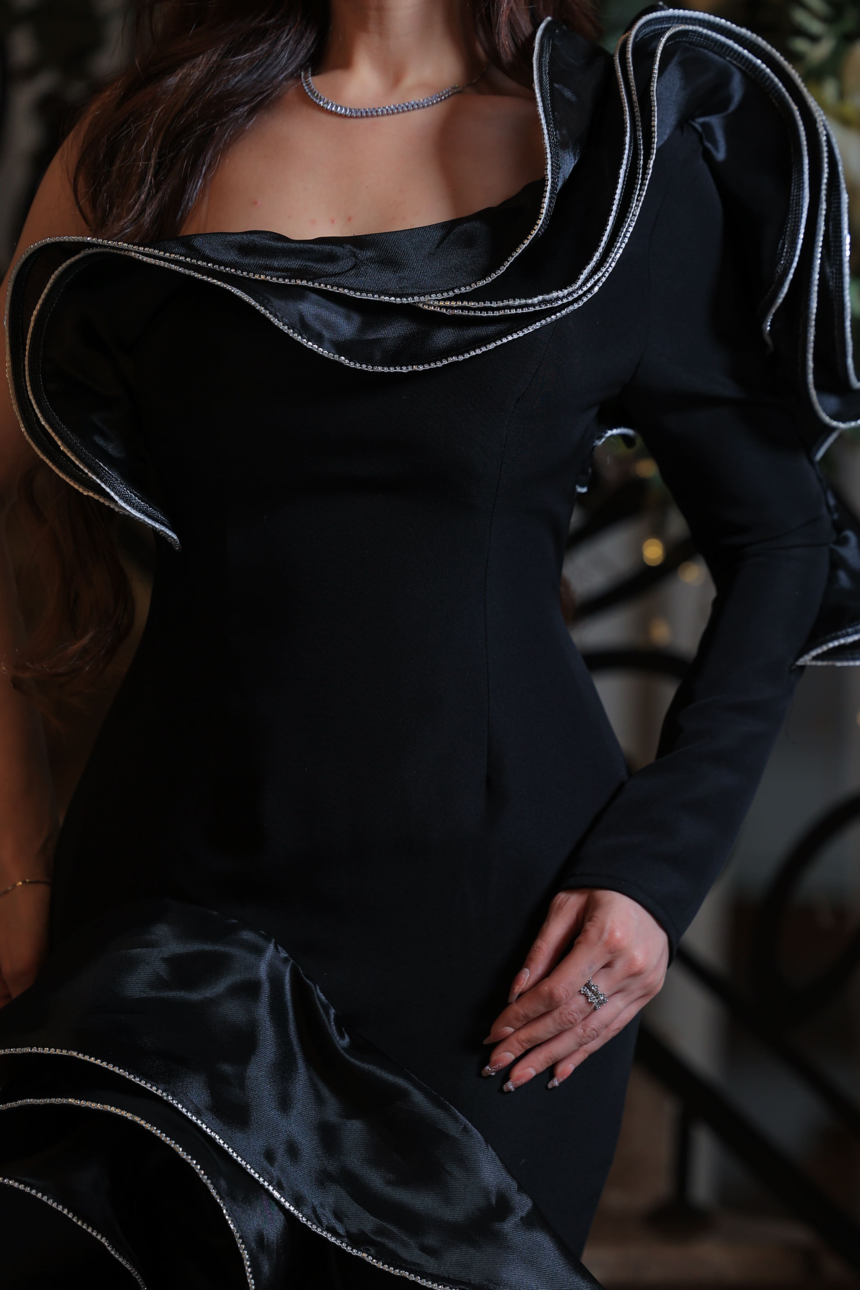 فستان أسود فاخر بتفاصيل كشكش ساتان أنيقة