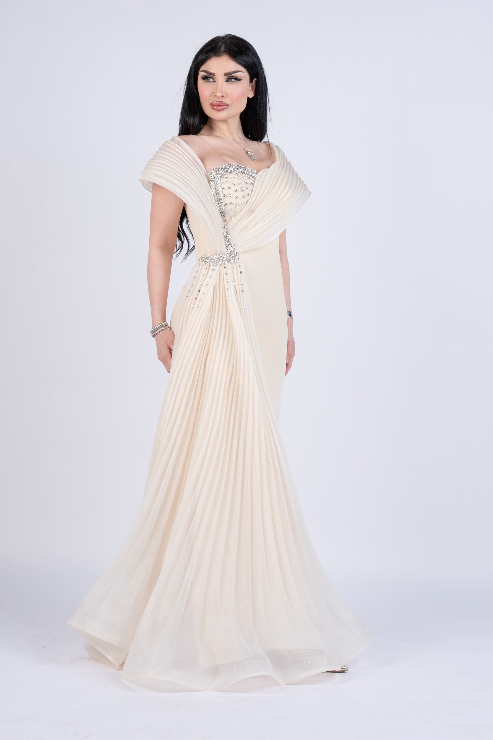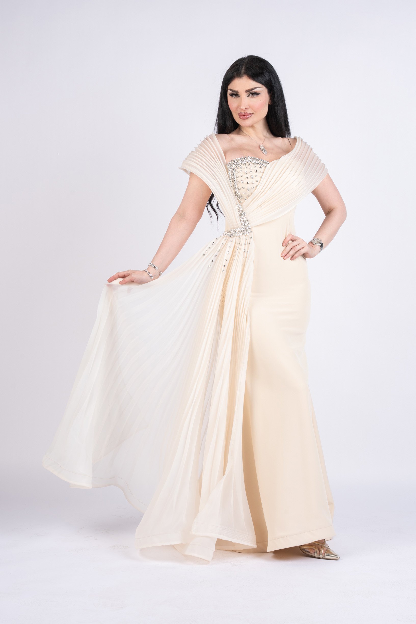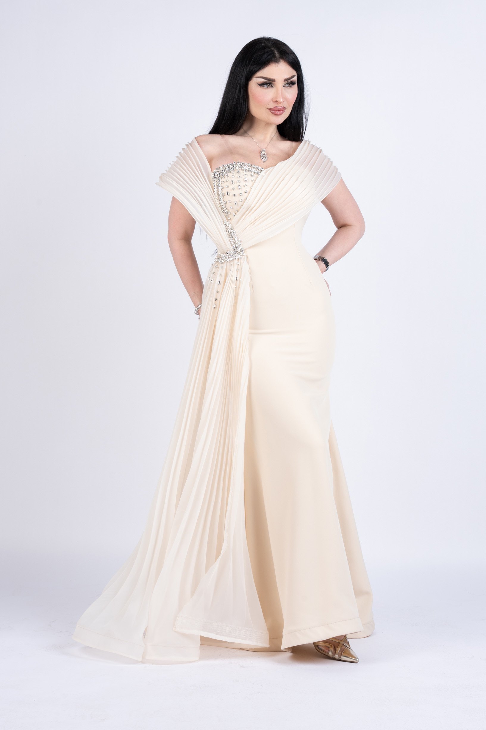 فستان سهر نسائي أنيق بون كلاسيكي فاخر وكسرات في الصدر مع كلفة يلائم أكبر المناسبات والاحتفالات