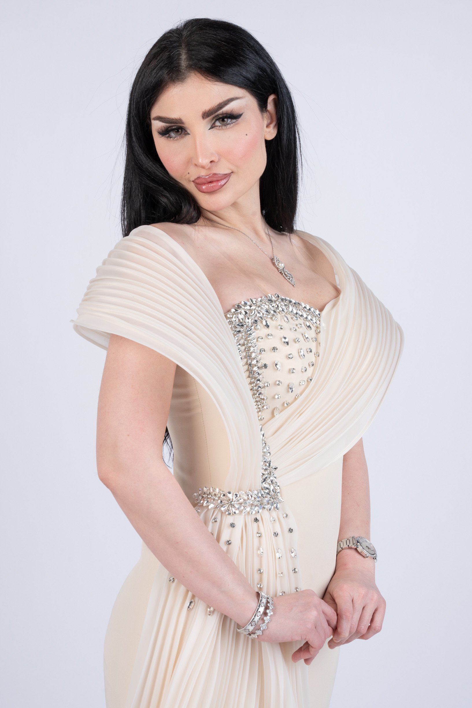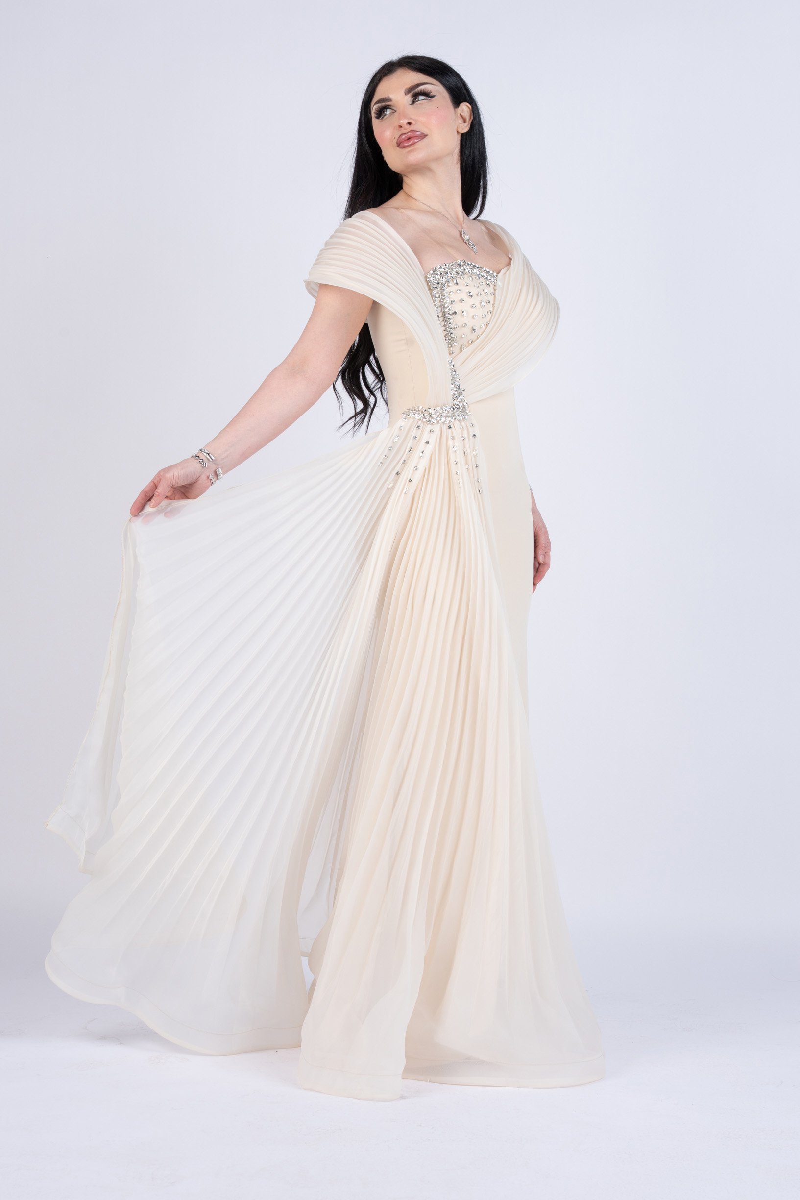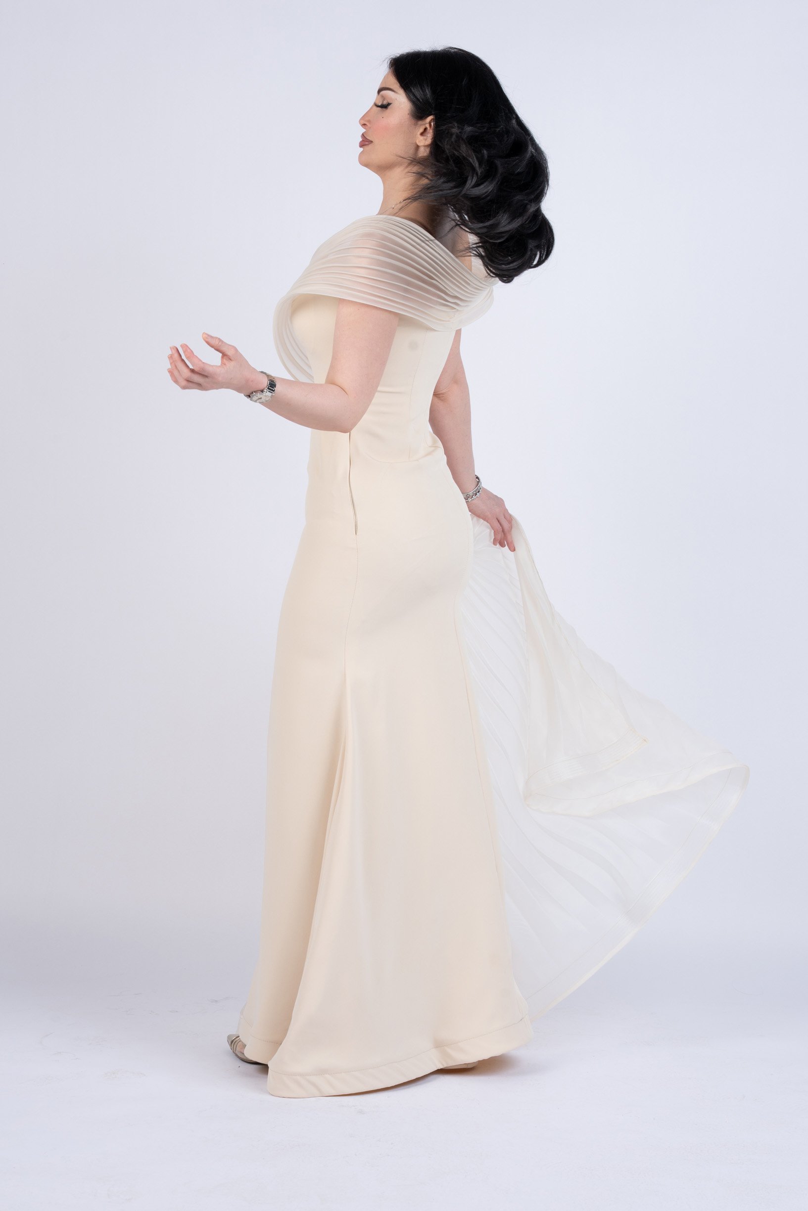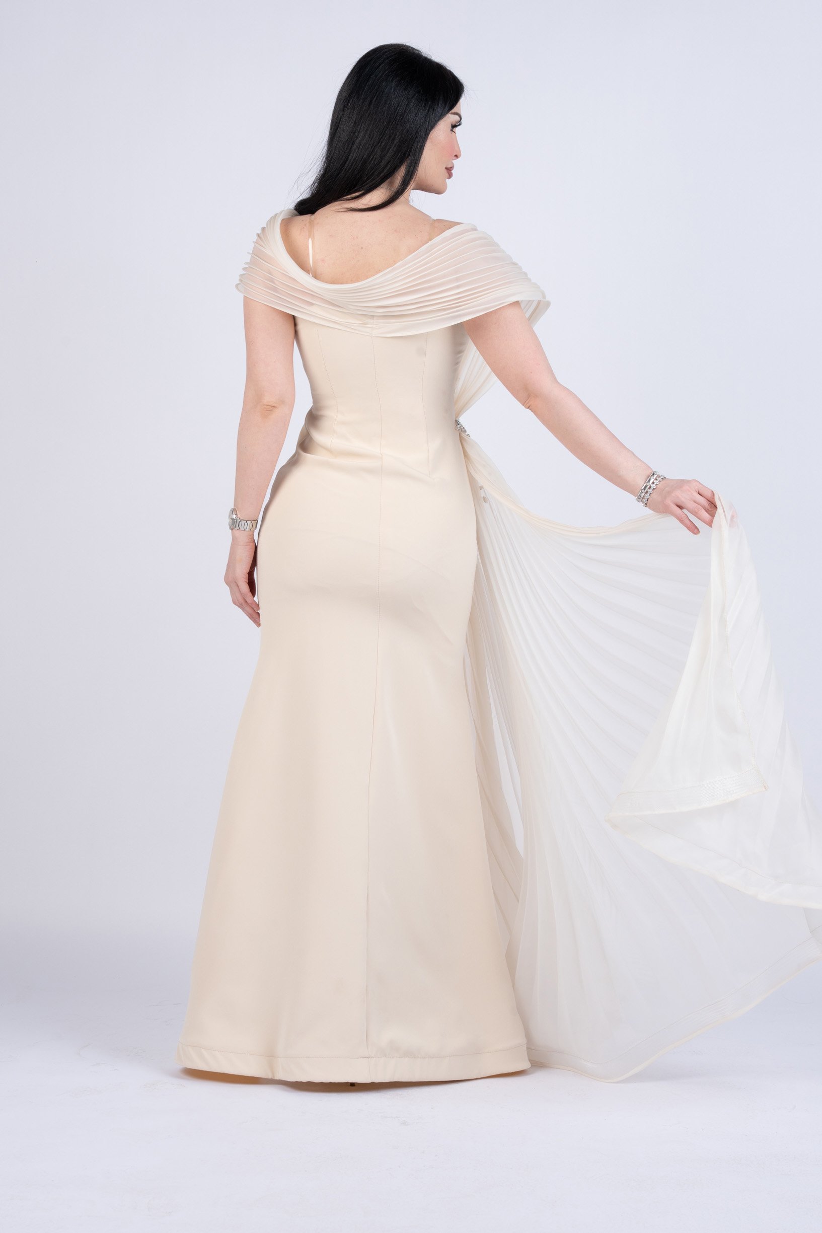فستان سهر نسائي أنيق بون كلاسيكي فاخر وكسرات في الصدر مع كلفة يلائم أكبر المناسبات والاحتفالات