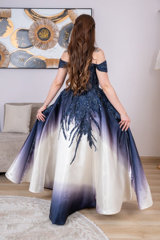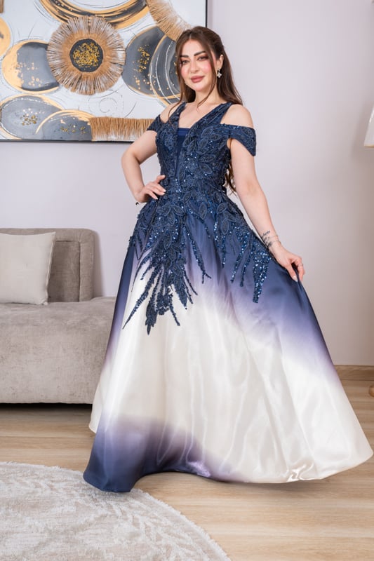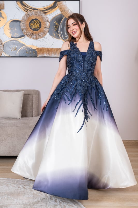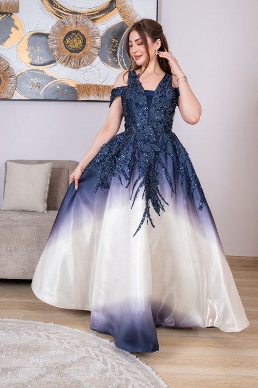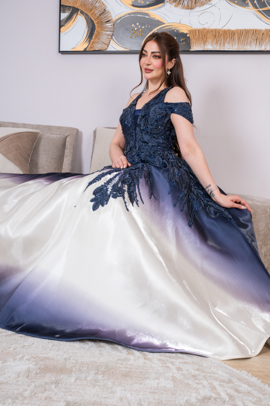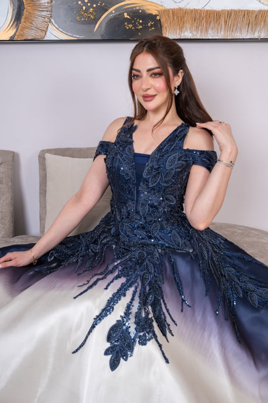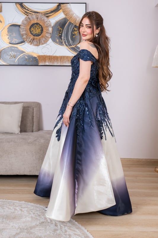 فستان سهرة ملكي بتدرجات الأزرق والبيج من لورا استمتعي بإطلالة ساحرة لا تُنسى مع هذا الفستان الفاخر المصمم خصيصًا ليبرز أنوثتك وأناقتك في المناسبات الخاصة. يتميز الفستان بتصميم أوف شولدر (Off-Shoulder) أنيق، مع تطريزات فاخرة من الخرز والترتر بتفاصيل ورقية ثلاثية الأبعاد تضفي لمسة من الفخامة والرقي.