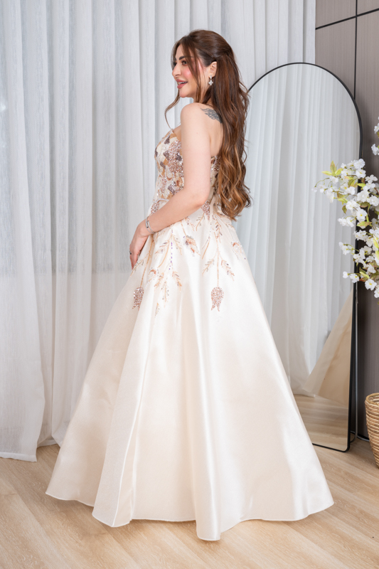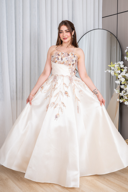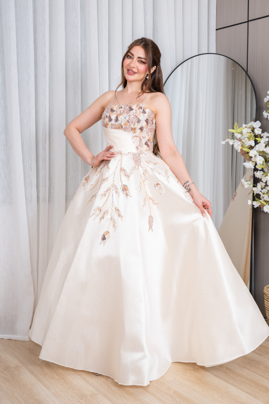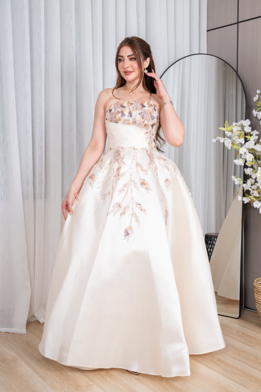 استمتعي بإطلالة تنطق بالفخامة مع هذا الفستان الكريمي من لورا، المصمم خصيصًا لذوق المرأة التي تعشق التميز. يتميز الفستان بقصة A-Line فاخرة تبرز أنوثتك، مع تطريزات دقيقة بالألوان الذهبية والبرونزية على الصدر والتنورة تضيف لمسة من البريق الملكي.