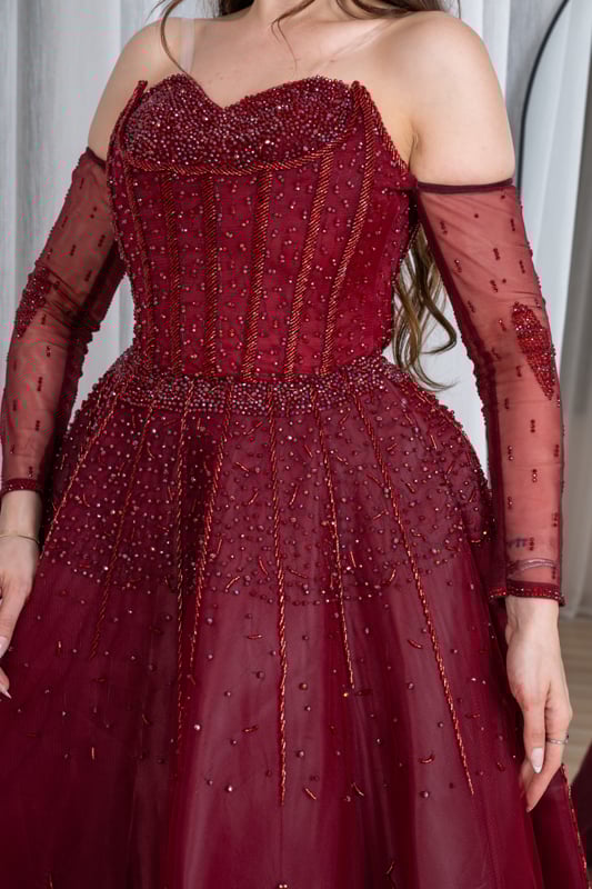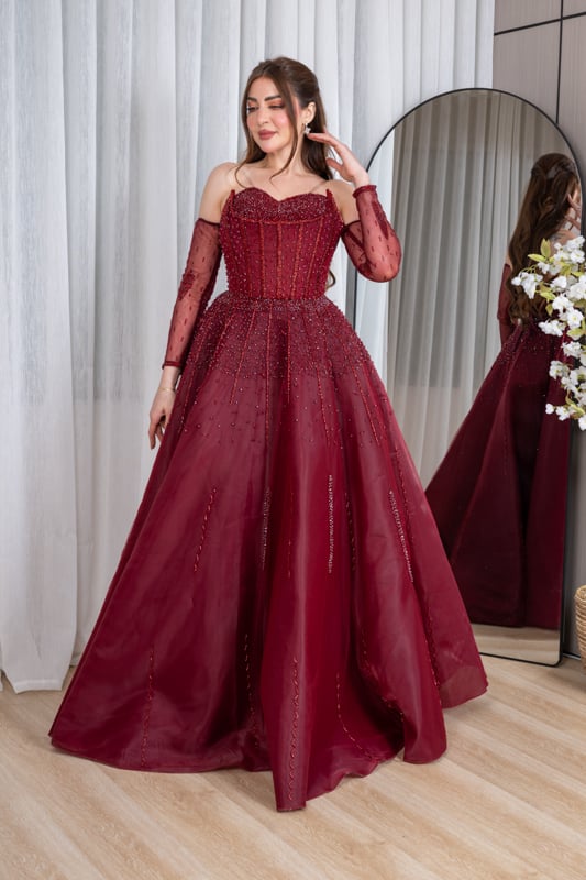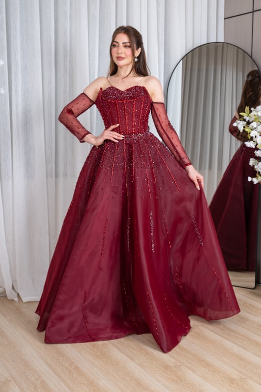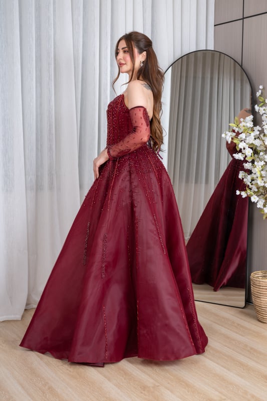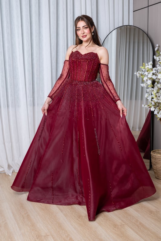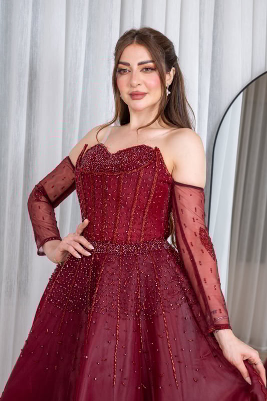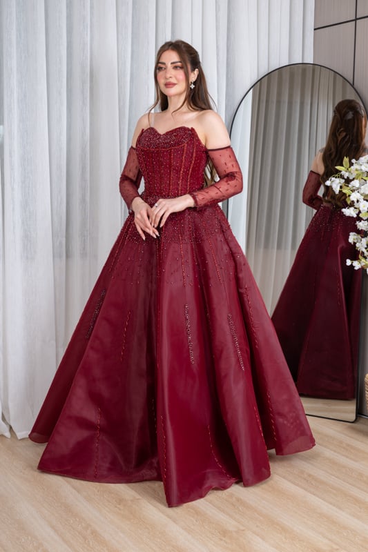 تألقي بإطلالة ملكية مع فستان السهرة العنابي من لورا – تصميم واسع منفوش بلمسات ترتر فاخرة تضيف بريقًا خاصًا لكل لحظة. يتميز الفستان بصدرية مهيكلة تُبرز القوام، وأكمام شيفون قابلة للإزالة لأناقة مزدوجة. مثالي للمناسبات الكبيرة مثل الزواجات، الحفلات، أو الخطوبة.