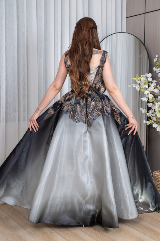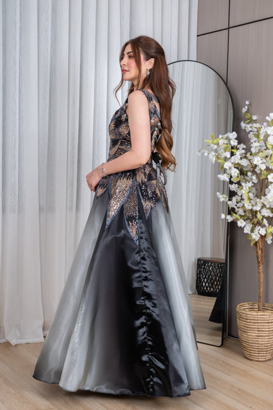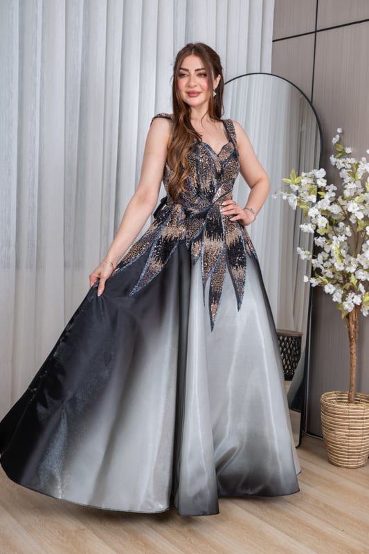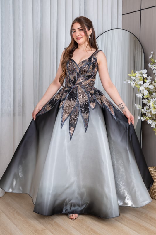فستان سهرة فاخر بتدرجات الأسود والفضي، مطرز بدقة فنية تشبه أوراق الشجر المتلألئة، يمنحك لمسة من الفخامة والثقة. تصميمه بقصة A-Line وقماش لامع ينساب برقي على جسدك ليمنحك إحساسًا كأنكِ أميرة تمشي على السجادة الحمراء.