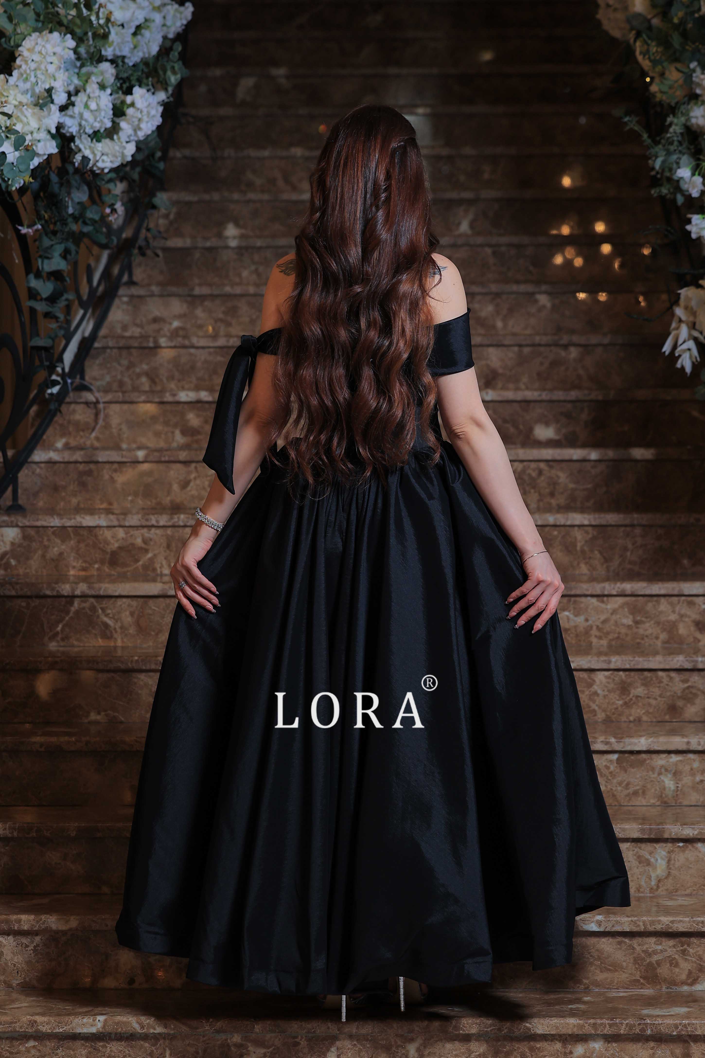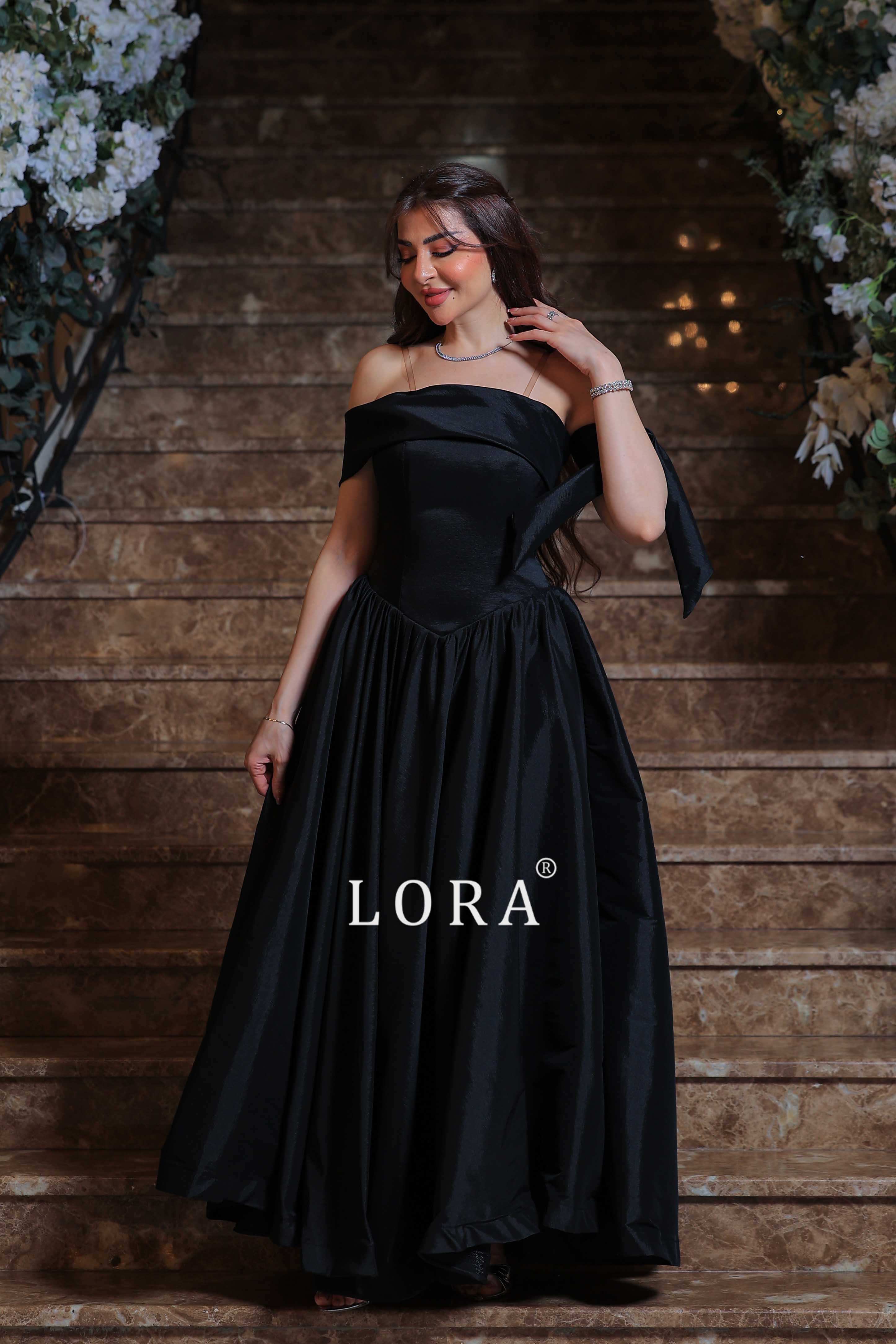 فستان سهرة طويل من لورا فاشن بلون أسود ملكي جذاب، يتميز بتصميم أوف شولدر مع ربطة حريرية على الذراع تضيف لمسة من الرقة والأنوثة.