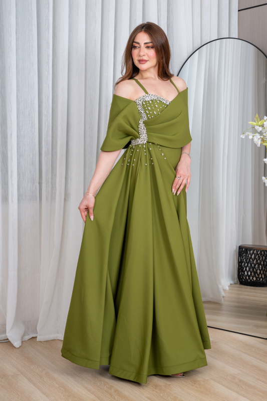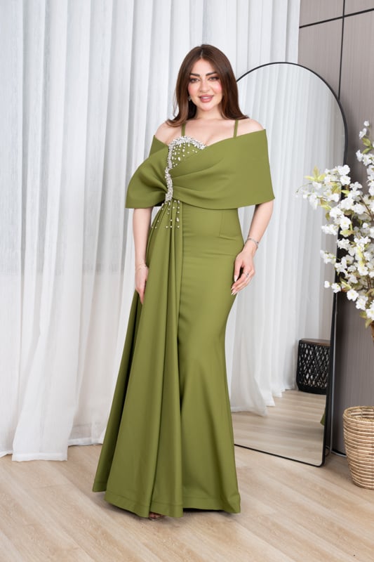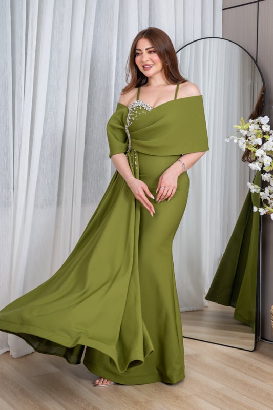 كوني محط الأنظار في كل مناسبة مع هذا الفستان الأخضر الفاخر المصمم بأسلوب يجمع بين الجرأة والرقي. يتميز بقصة ضيقة تُبرز جمال قوامكِ، مع كاب أنيق ينسدل على الأكتاف ويُضفي لمسة درامية فخمة. التطريزات اللامعة على الصدر تضيف بريقاً راقياً، لتظهري بإطلالة ملكية تنطق بالأنوثة والثقة. مثالي لحفلات الخطوبة، السهرة، أو المناسبات الخاصة التي تتطلب حضوراً لافتاً.